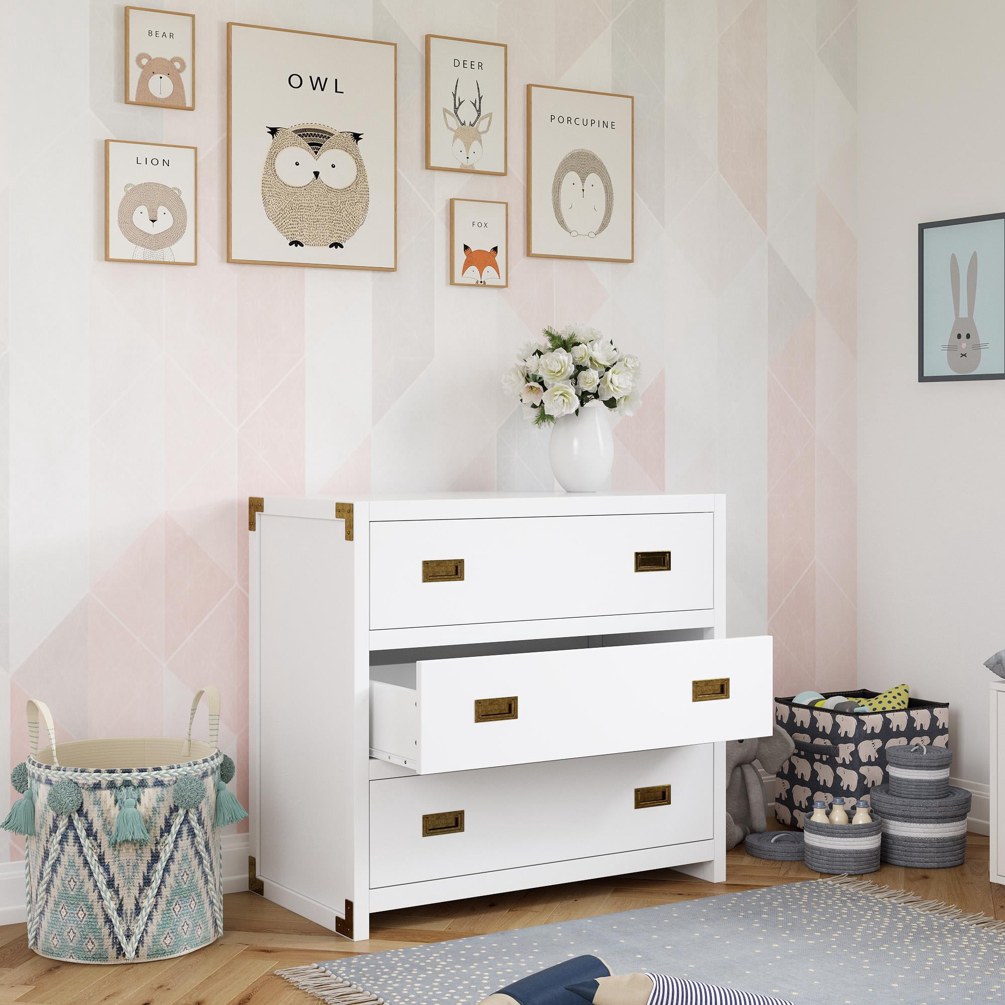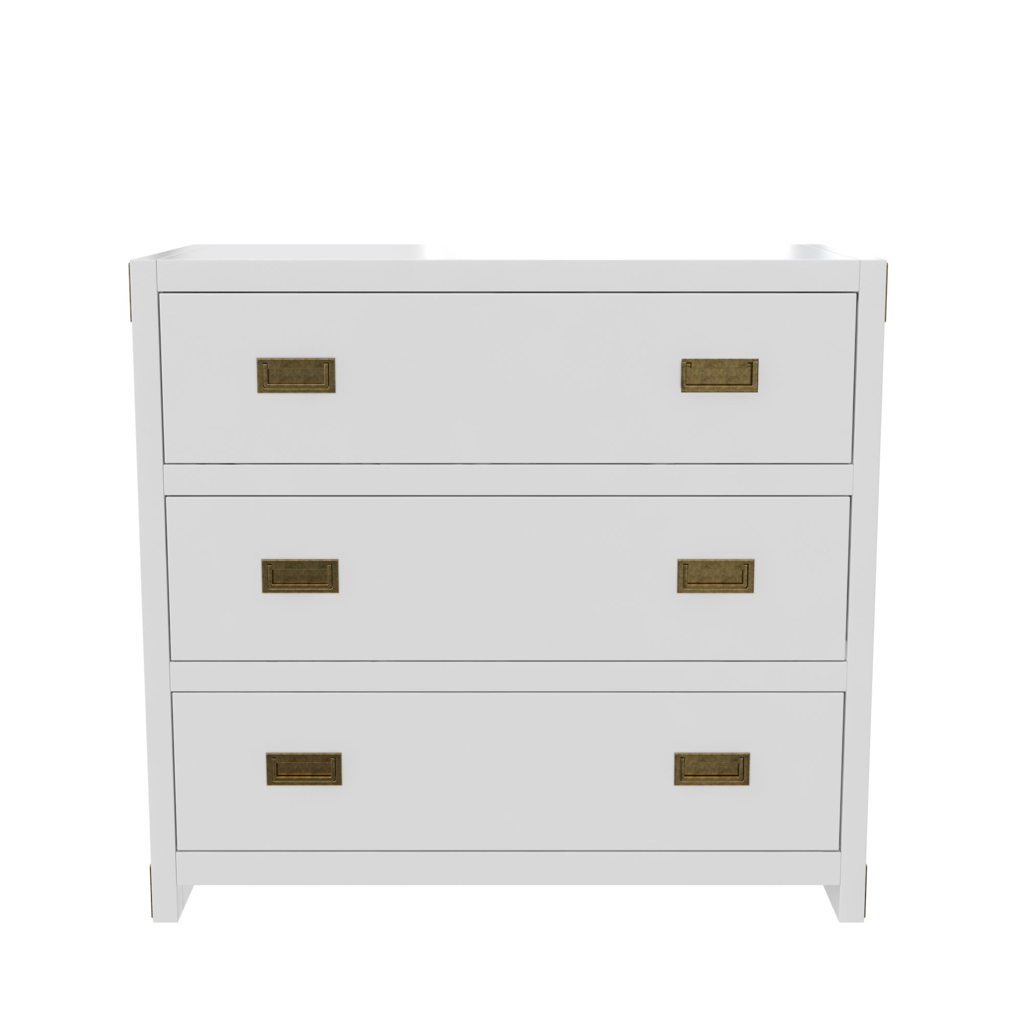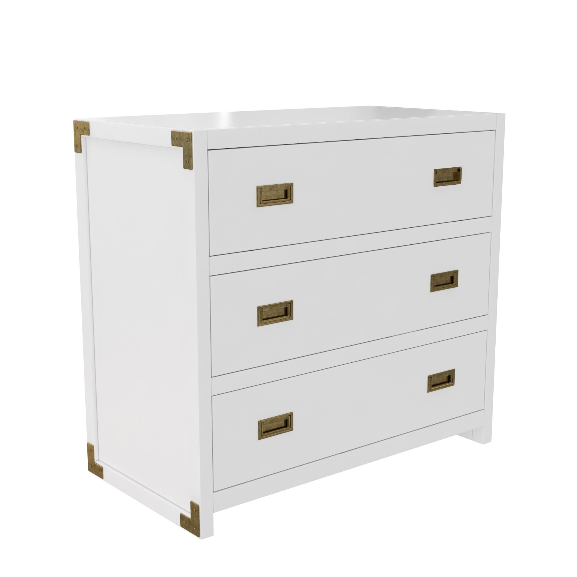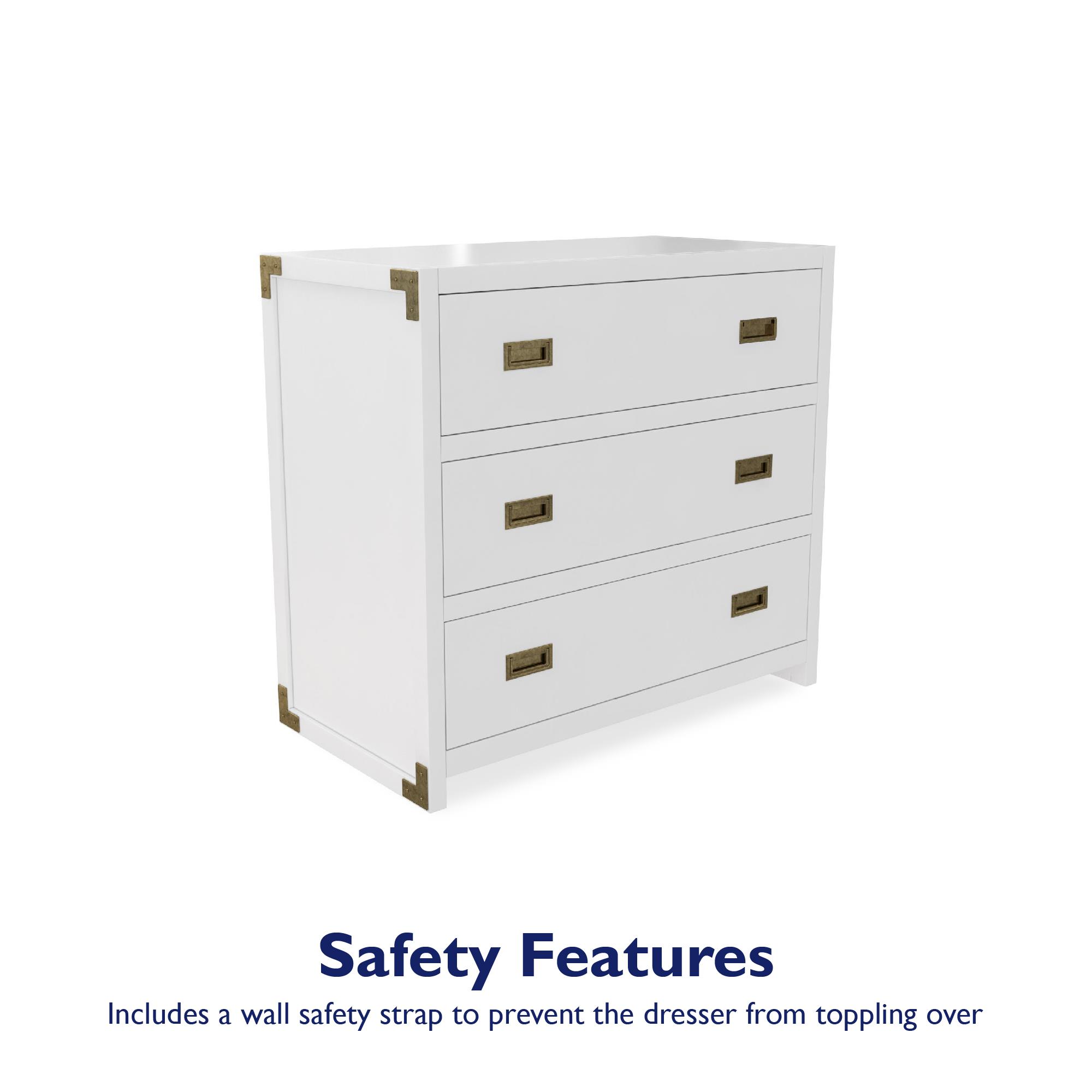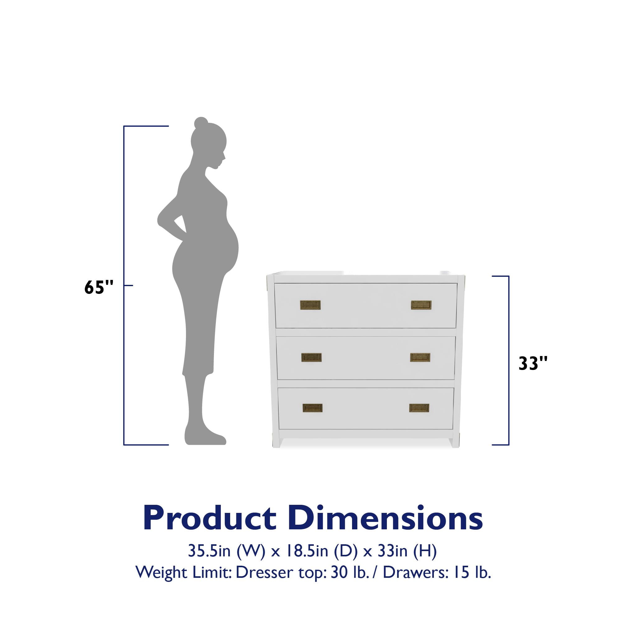 Modern campaign style nursery dresser with 3 sturdy wood drawers for storage and brass plated decor accents. Meets international ASTM and U.S. CPSC safety standards Brass metal hardware and drawer glides for easy opening and closing. Stop mechanisms on drawers for added security Includes an anti-tip kit with wall strap to ensure child safety. Finished in a non-toxic painting process Add the matching Dresser Topper (sold separately) to convert the 3-Drawer Dresser into a convenient changing station. Available in a variety of neutral colors. 1-year limited warranty Product dimensions: 35.5″L x 18.5″W x 33″H. Net weight: 79.5 lbs. Shipping dimensions: 37″L x 22″W x 9″H. Net weight: 87 lbs.