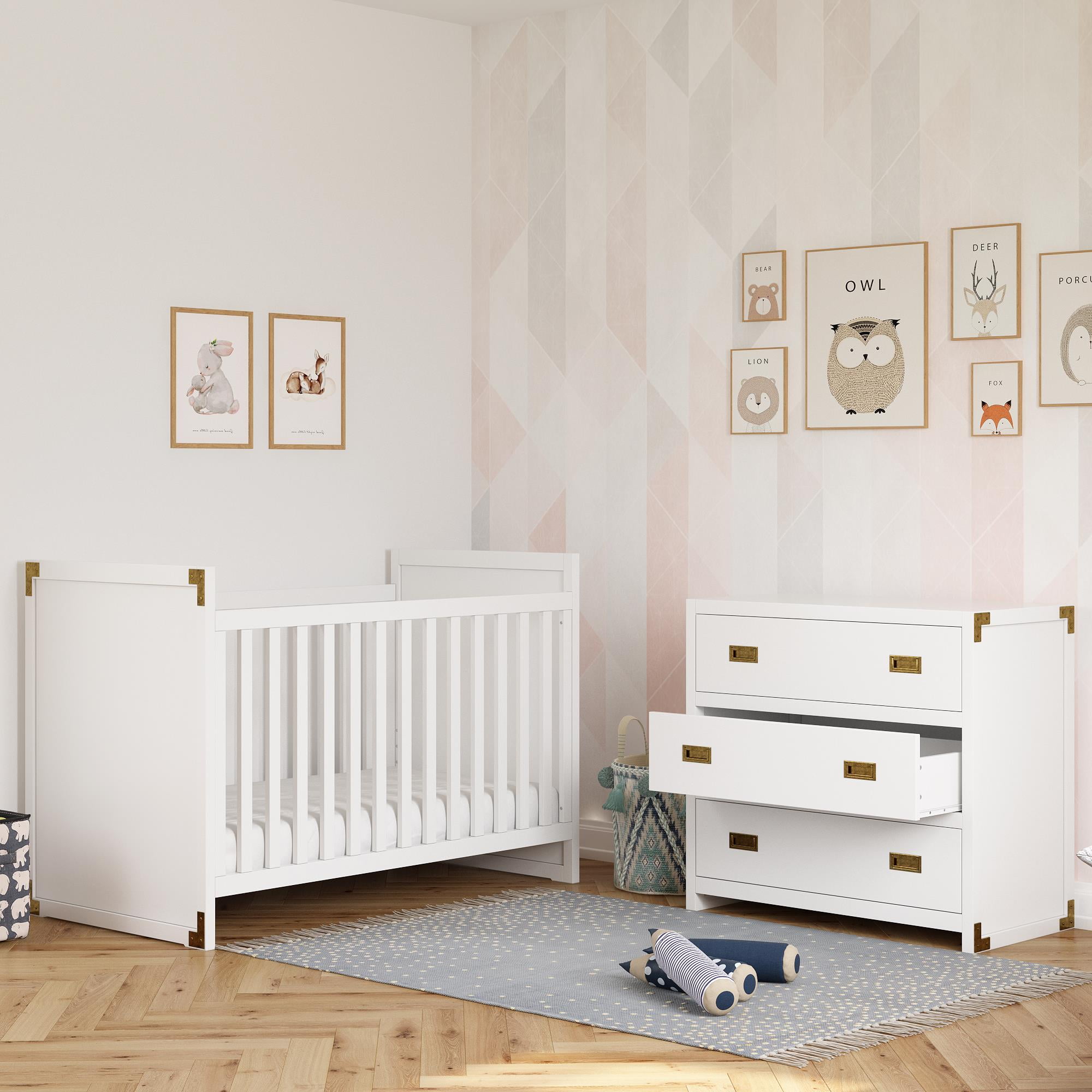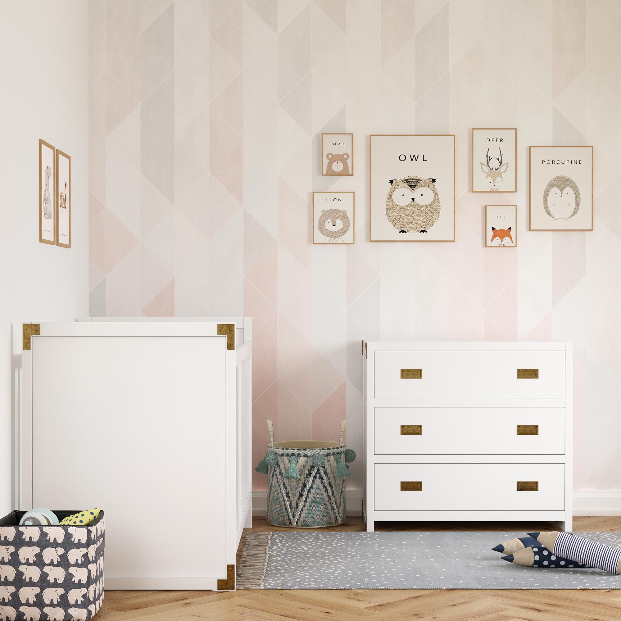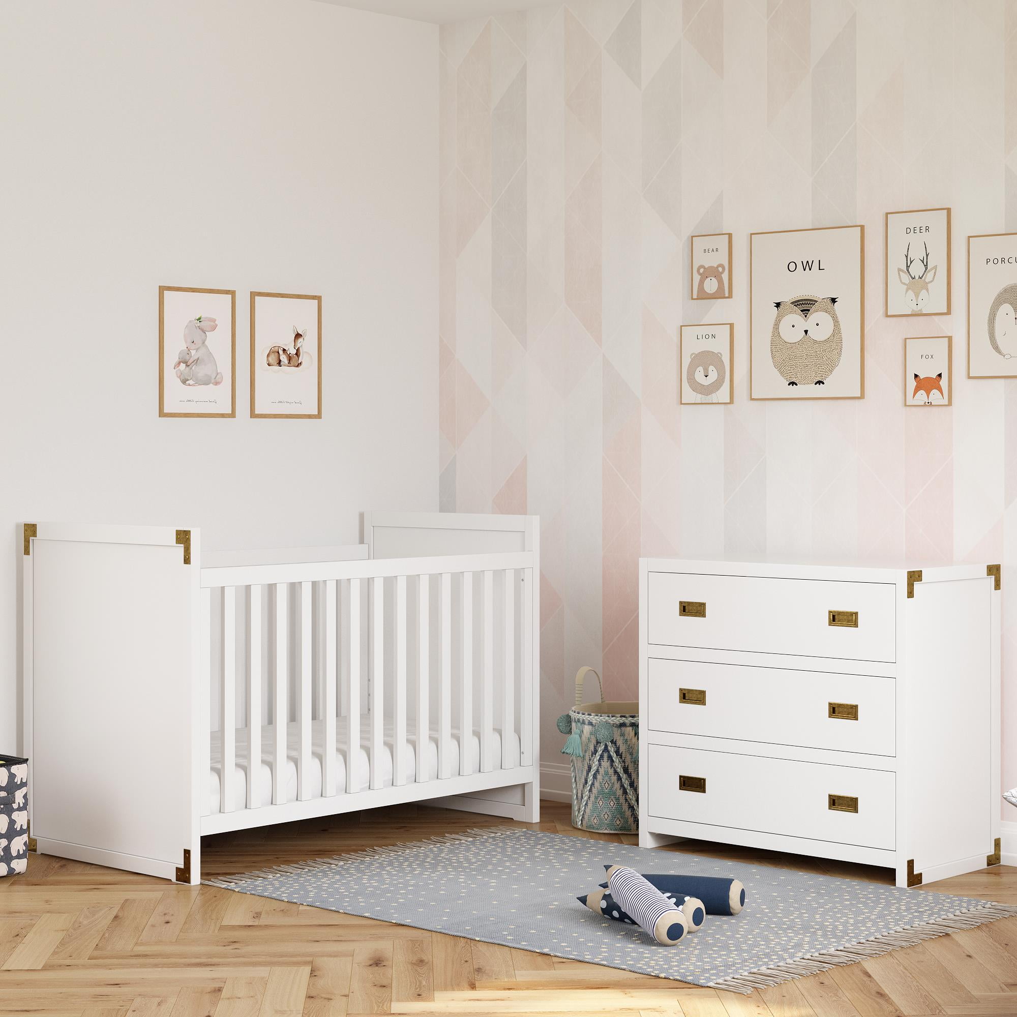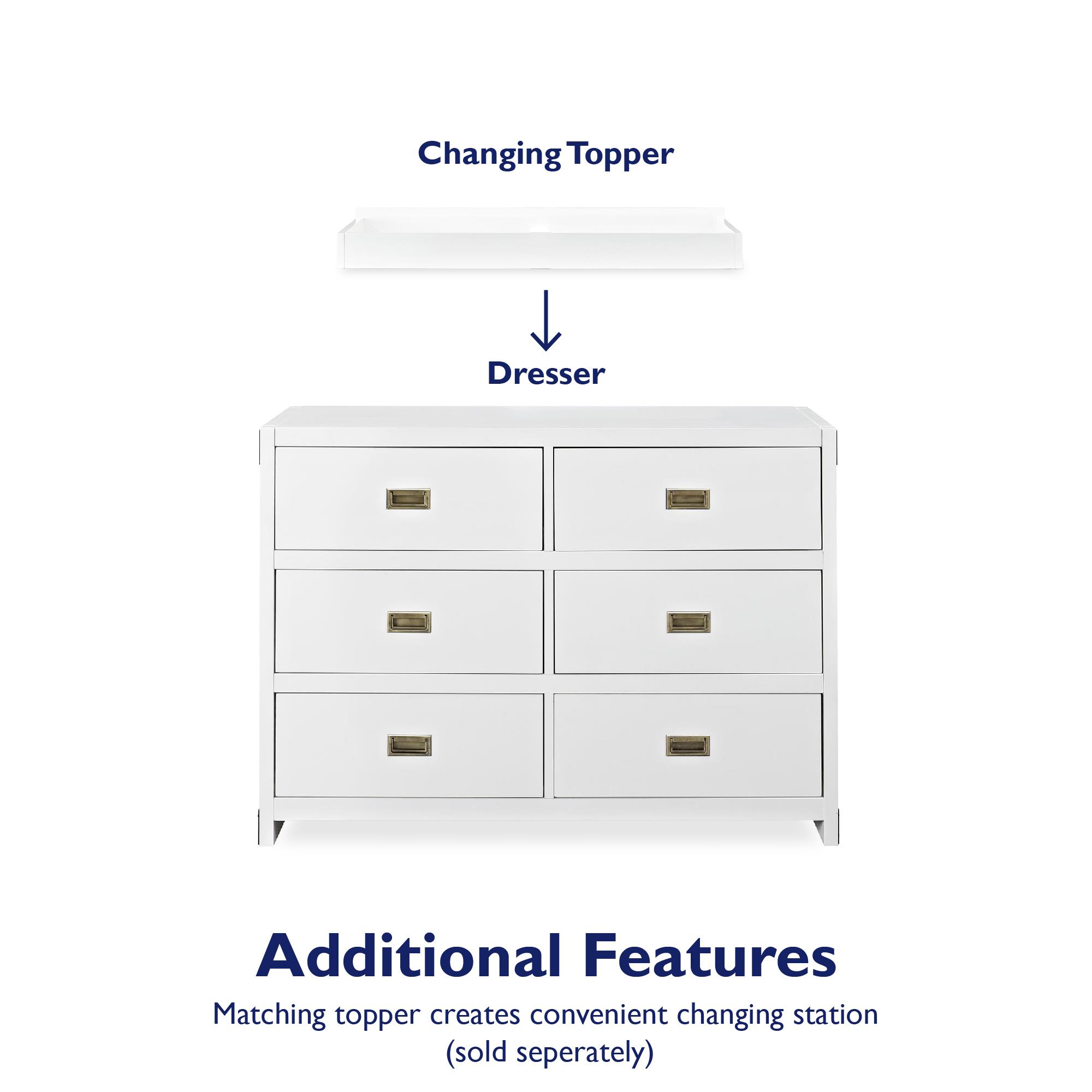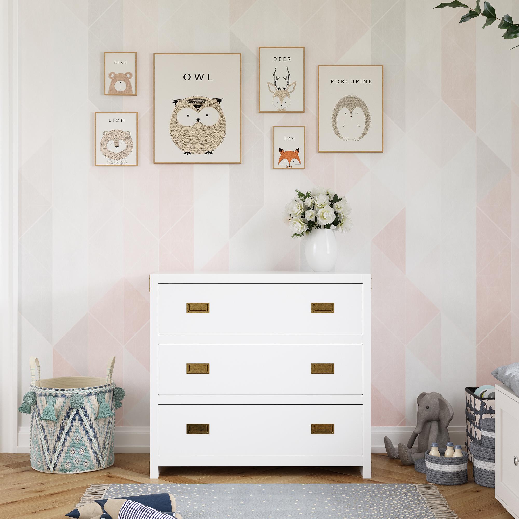Modern campaign style nursery dresser with 3 sturdy wood drawers for storage and brass plated decor accents. Meets international ASTM and U.S. CPSC safety standards Brass metal hardware and drawer glides for easy opening and closing. Stop mechanisms on drawers for added security Includes an anti-tip kit with wall strap to ensure child safety. Finished in a non-toxic painting process Add the matching Dresser Topper (sold separately) to convert the 3-Drawer Dresser into a convenient changing station. Available in a variety of neutral colors. 1-year limited warranty Product dimensions: 35.5″L x 18.5″W x 33″H. Net weight: 79.5 lbs. Shipping dimensions: 37″L x 22″W x 9″H. Net weight: 87 lbs.