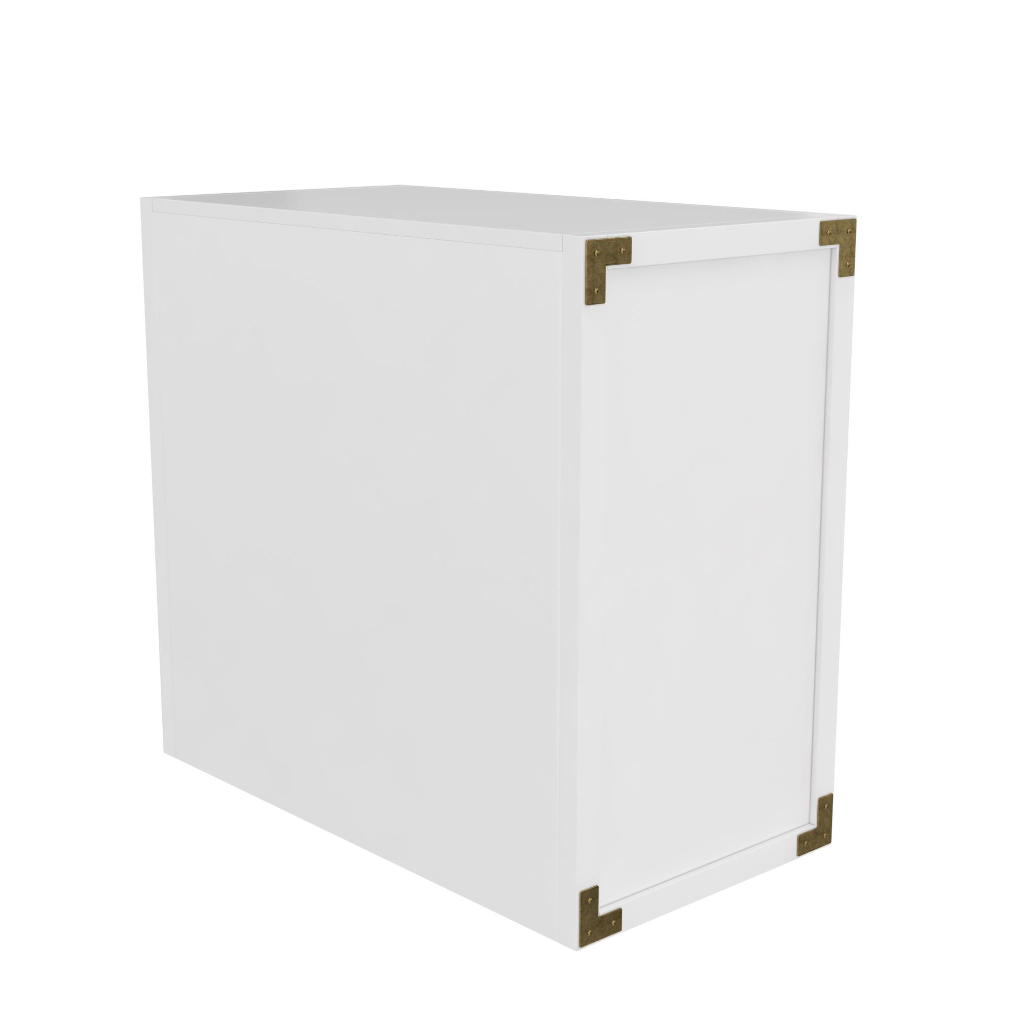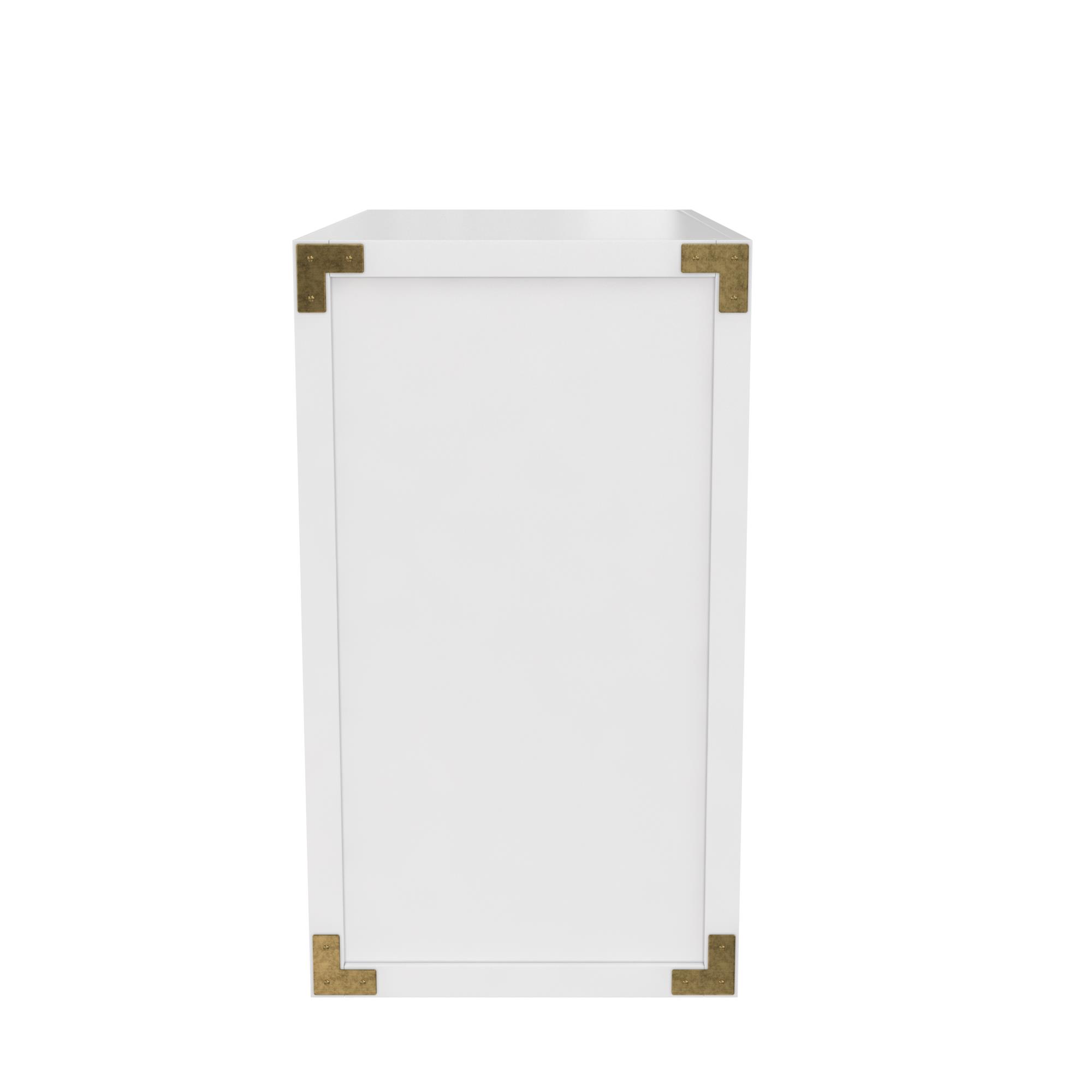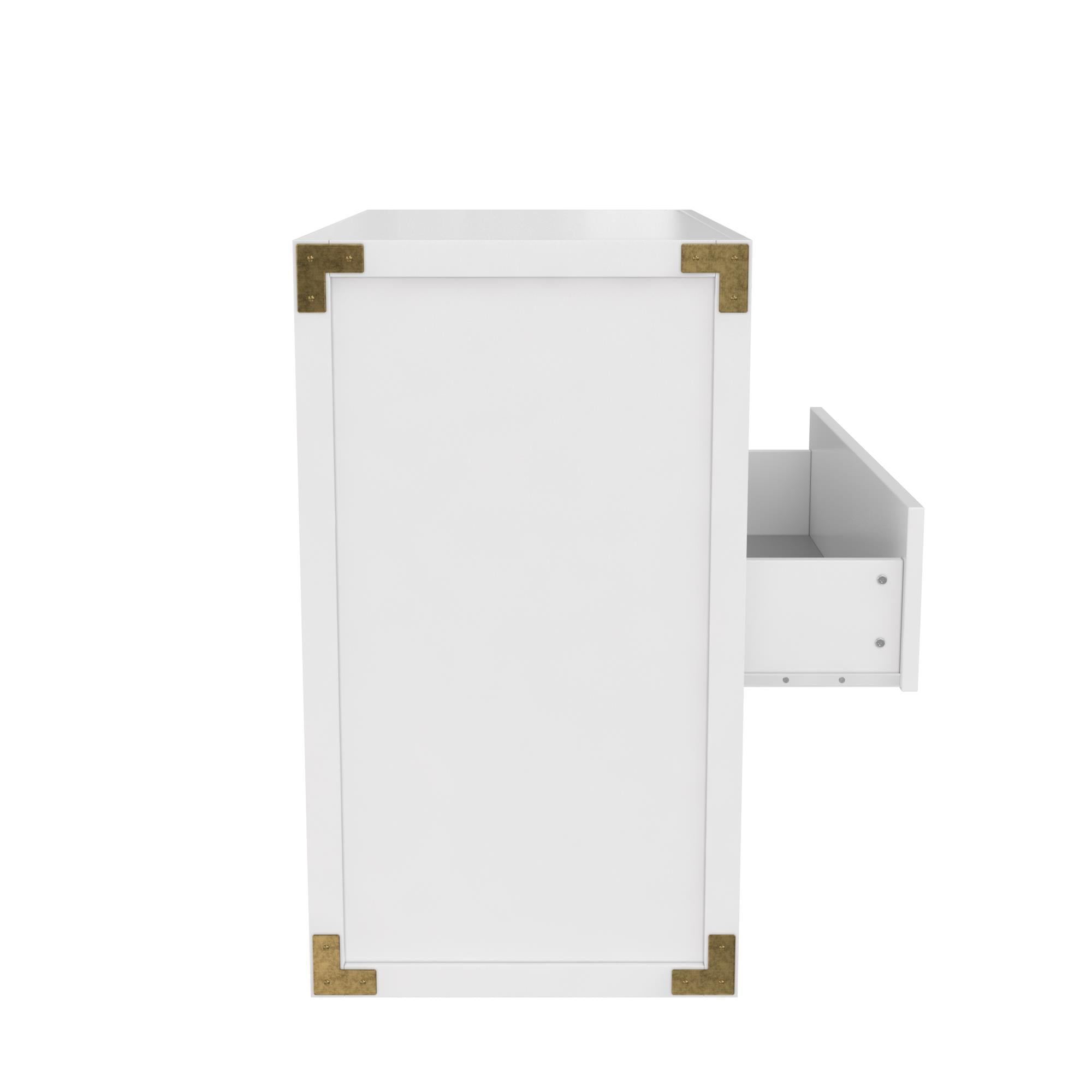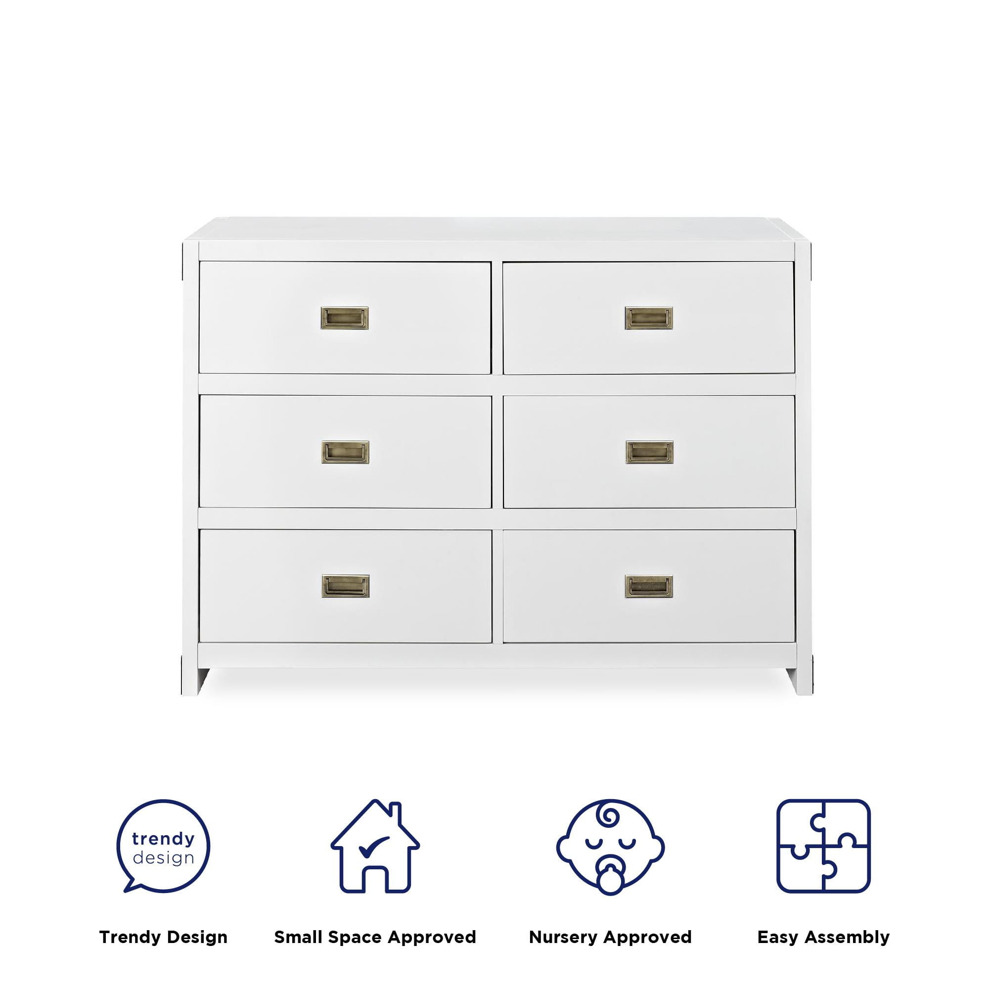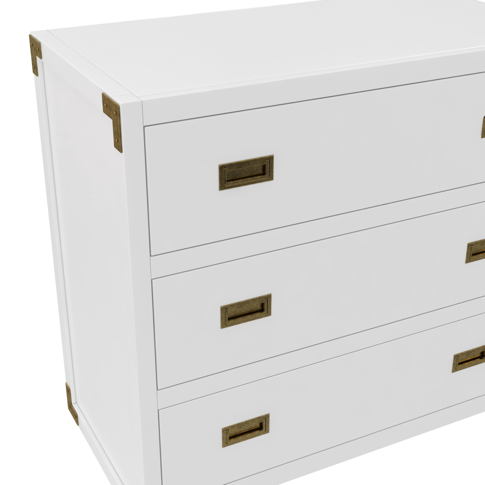 Modern campaign style nursery dresser with 3 sturdy wood drawers for storage and brass plated decor accents. Meets international ASTM and U.S. CPSC safety standards Brass metal hardware and drawer glides for easy opening and closing. Stop mechanisms on drawers for added security Includes an anti-tip kit with wall strap to ensure child safety. Finished in a non-toxic painting process Add the matching Dresser Topper (sold separately) to convert the 3-Drawer Dresser into a convenient changing station. Available in a variety of neutral colors. 1-year limited warranty Product dimensions: 35.5″L x 18.5″W x 33″H. Net weight: 79.5 lbs. Shipping dimensions: 37″L x 22″W x 9″H. Net weight: 87 lbs.