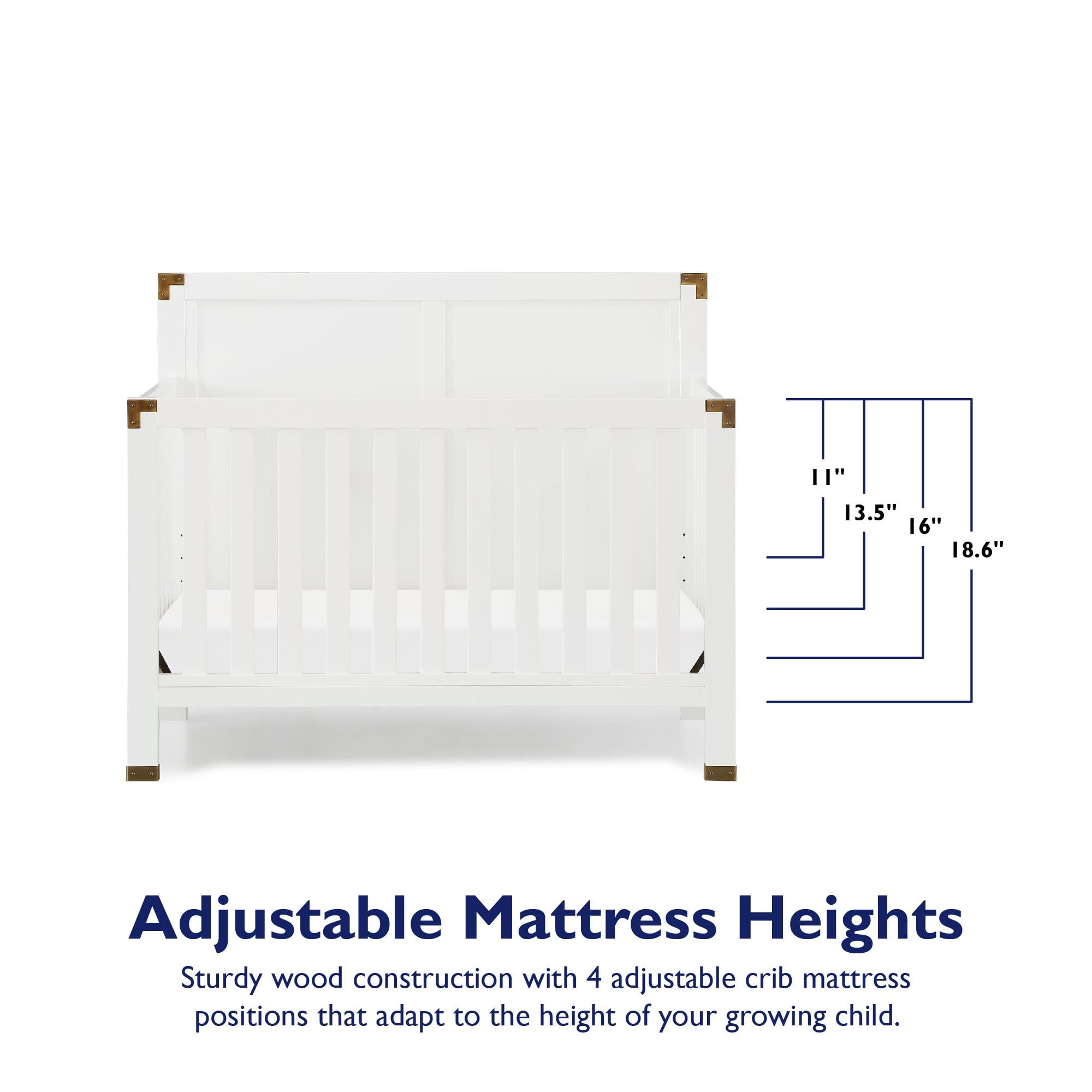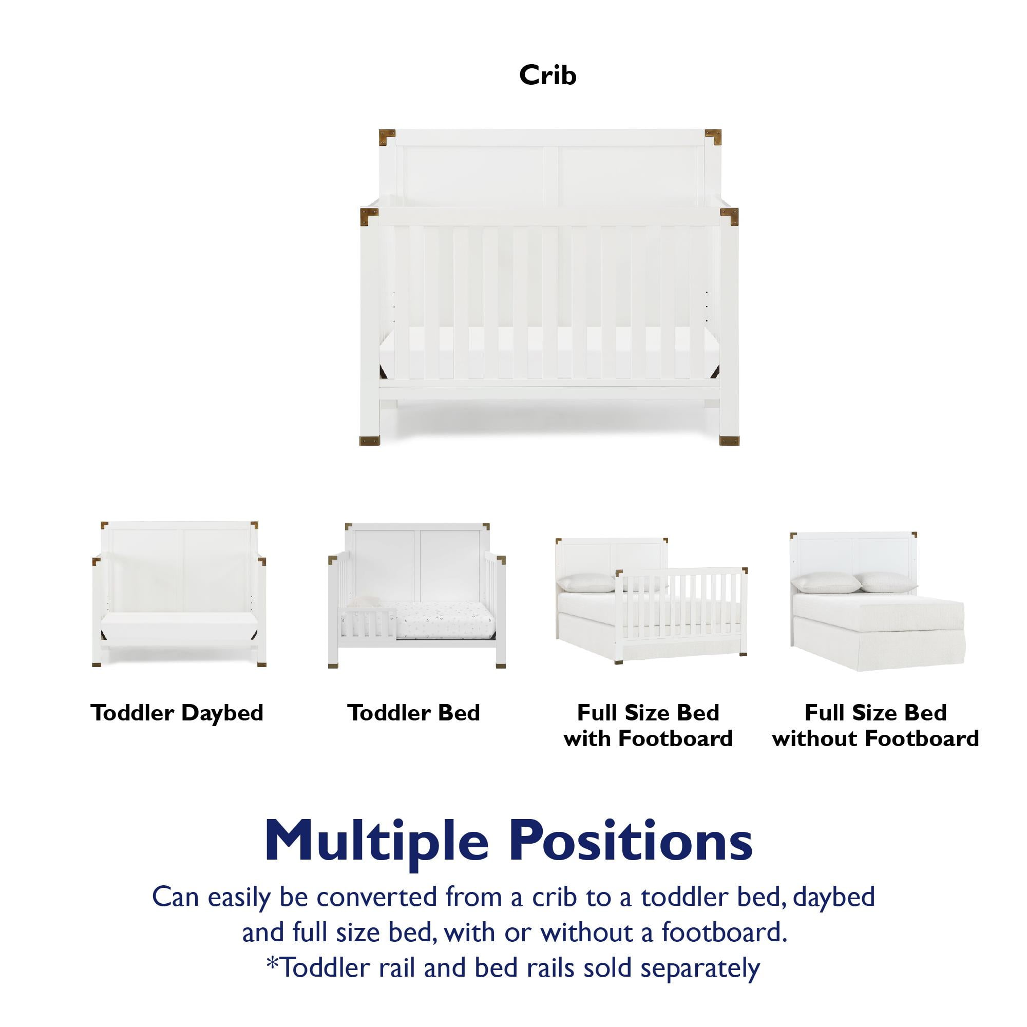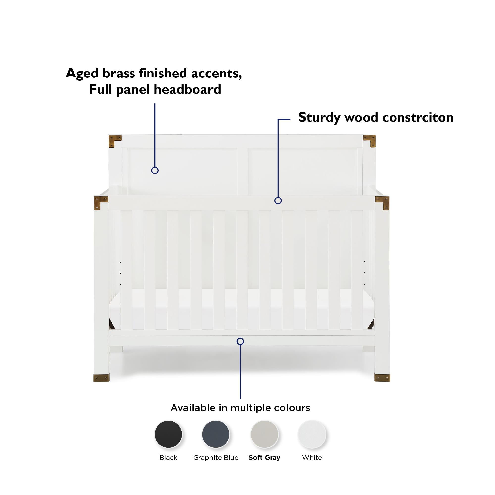 5-in-1 convertible crib: Can be used as a nursery crib, toddler daybed, toddler bed (separate purchase of the matching toddler guardrail required), and full-size bed with headboard only or with both headboard and footboard (bed frame not included) Watch your baby grow: Features 4 adjustable mattress heights that adapt to your child’s growth and development. Fits a standard size crib mattress (sold separately). Recommended for children no taller than 35-inches or weighing no more than 50 lbs. Modern crib design : Elevated back panel with brass metal plated corner and leg accents. Made from solid pine wood, its chic design provides a timeless backdrop to contemporary nursery decors fit for boys or girls Safe and sound: JPMA Certified to meet/exceed all applicable CPSC/ASTM standards for safety-minded sleep. Non-toxic finish is free of phthalates, latex, lead and BPA to ensure a healthy indoor space Assembled Crib Dimensions: 55.75″L x 29.75″W x 46″H. Net weight: 61.73 lbs. Ships in one easy to handle box with all parts, tools, and instructions included for fast assembly. 1-year limited warranty and reliable customer service support