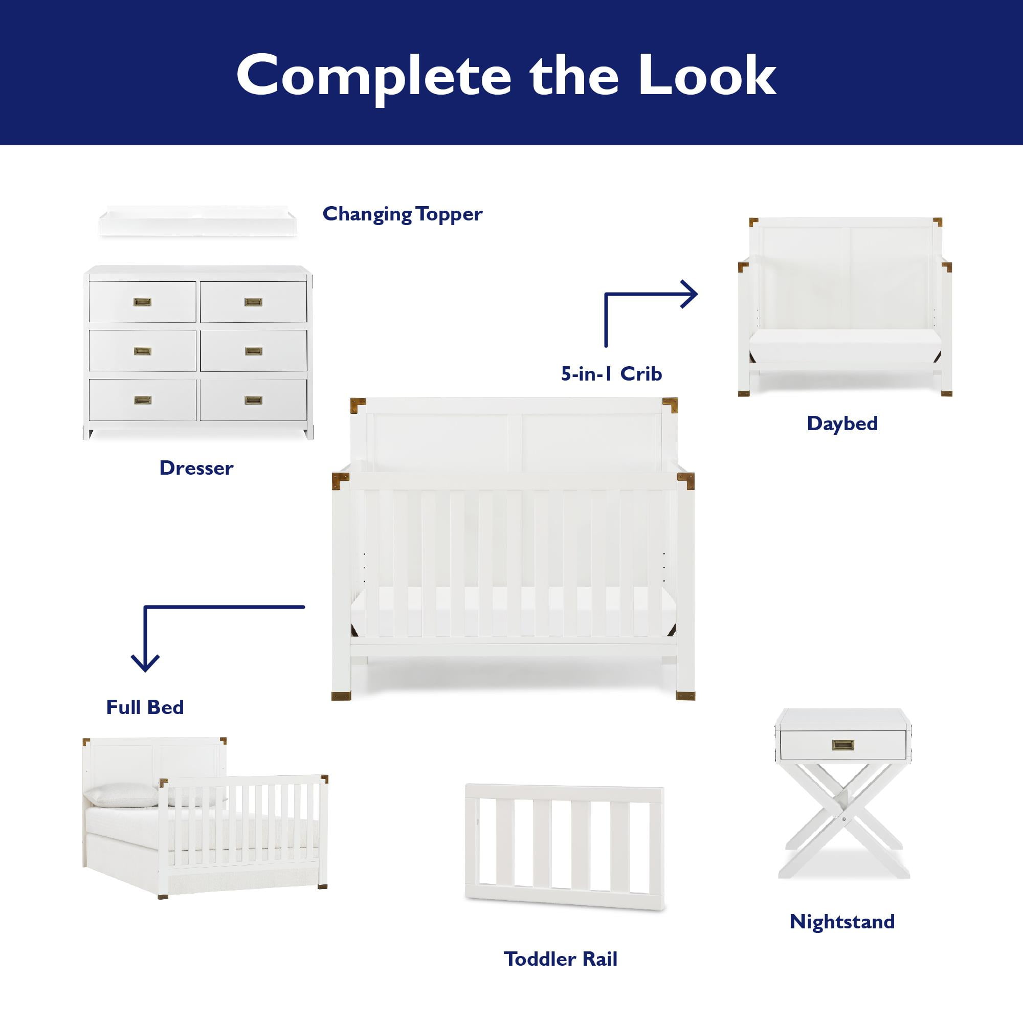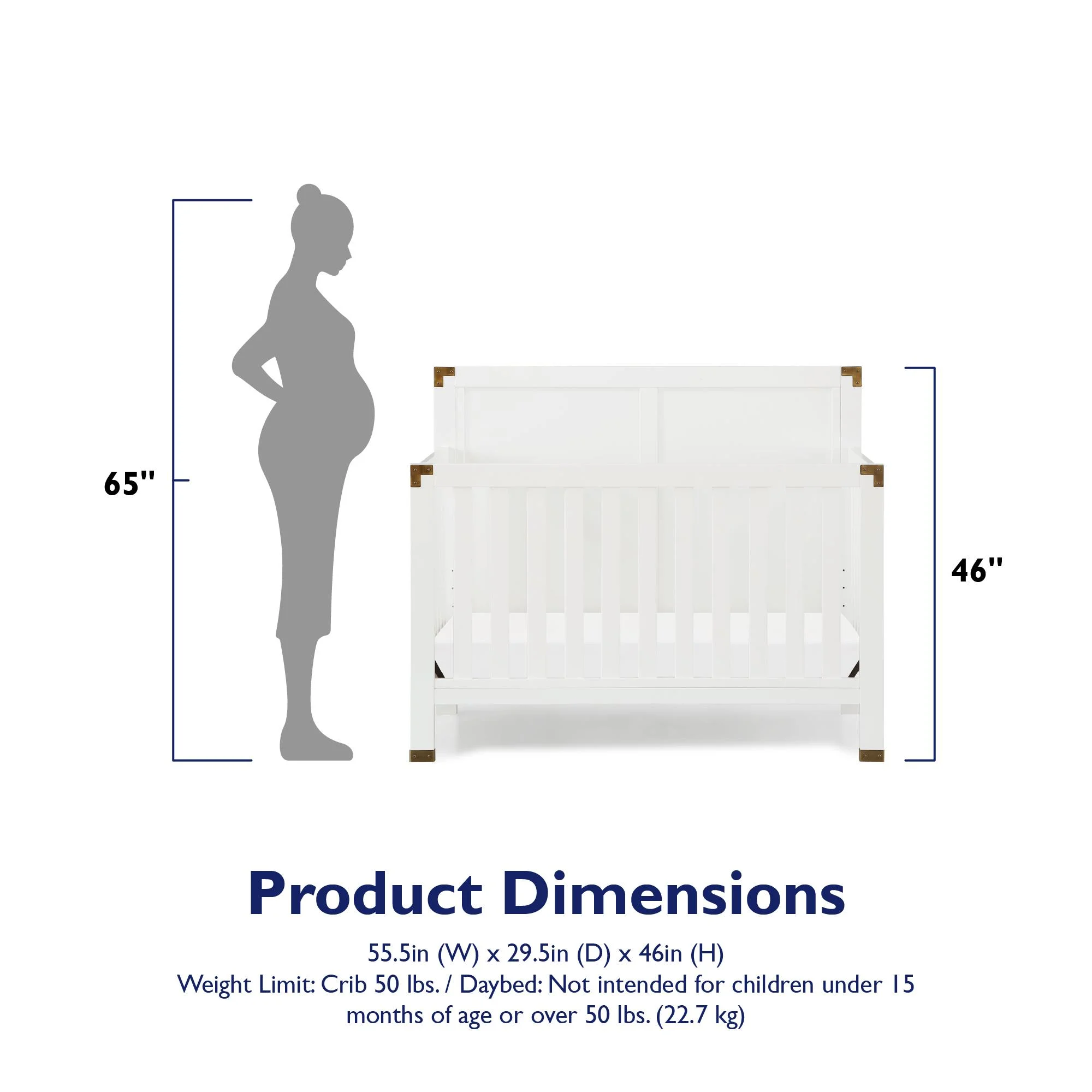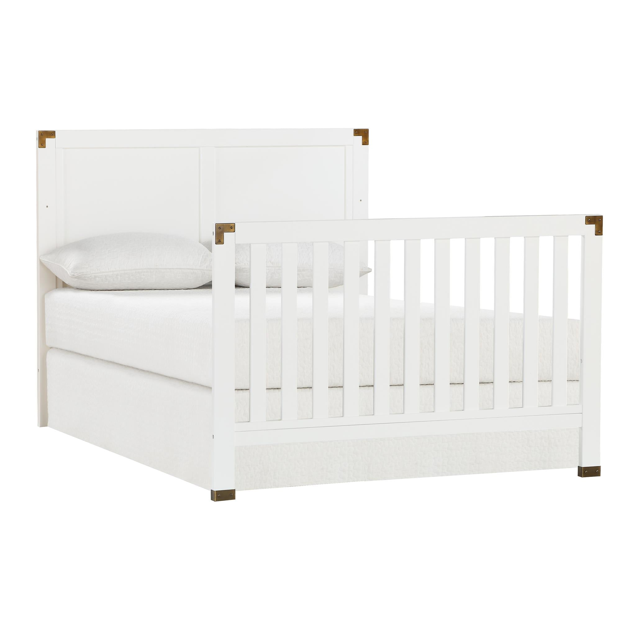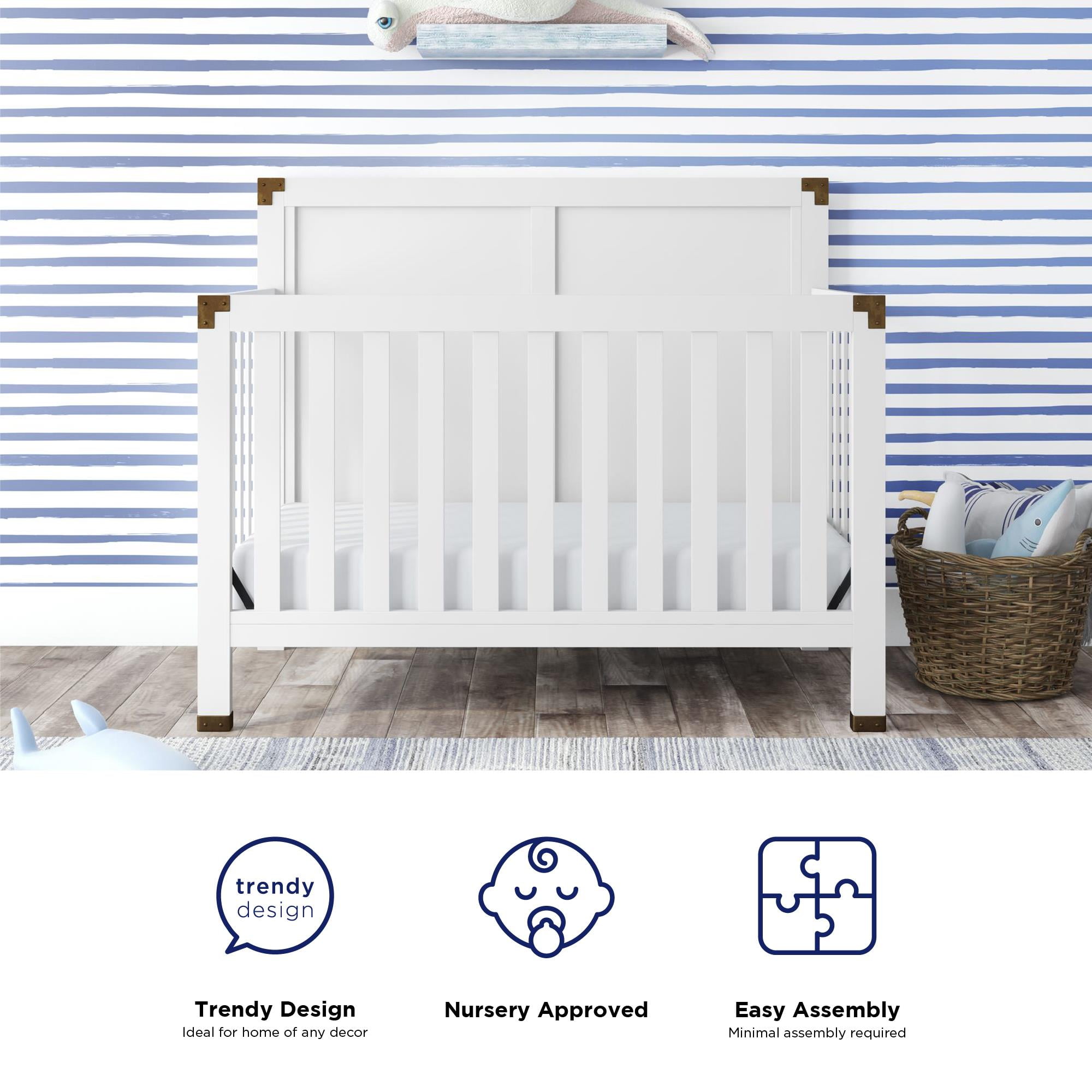 5-in-1 convertible crib: Can be used as a nursery crib, toddler daybed, toddler bed (separate purchase of the matching toddler guardrail required), and full-size bed with headboard only or with both headboard and footboard (bed frame not included) Watch your baby grow: Features 4 adjustable mattress heights that adapt to your child’s growth and development. Fits a standard size crib mattress (sold separately). Recommended for children no taller than 35-inches or weighing no more than 50 lbs. Modern crib design : Elevated back panel with brass metal plated corner and leg accents. Made from solid pine wood, its chic design provides a timeless backdrop to contemporary nursery decors fit for boys or girls Safe and sound: JPMA Certified to meet/exceed all applicable CPSC/ASTM standards for safety-minded sleep. Non-toxic finish is free of phthalates, latex, lead and BPA to ensure a healthy indoor space Assembled Crib Dimensions: 55.75″L x 29.75″W x 46″H. Net weight: 61.73 lbs. Ships in one easy to handle box with all parts, tools, and instructions included for fast assembly. 1-year limited warranty and reliable customer service support