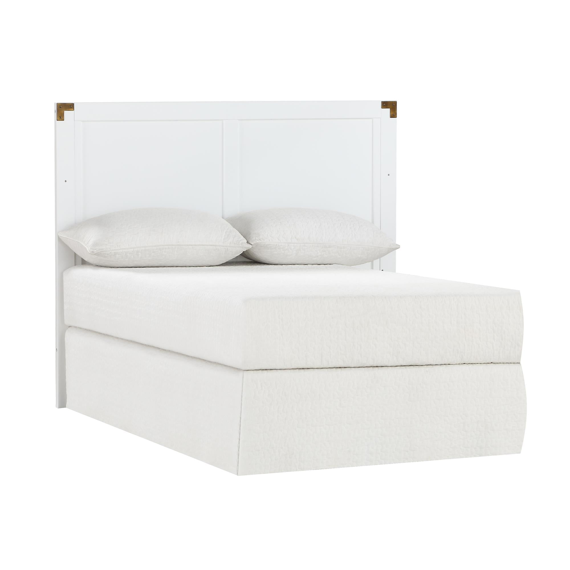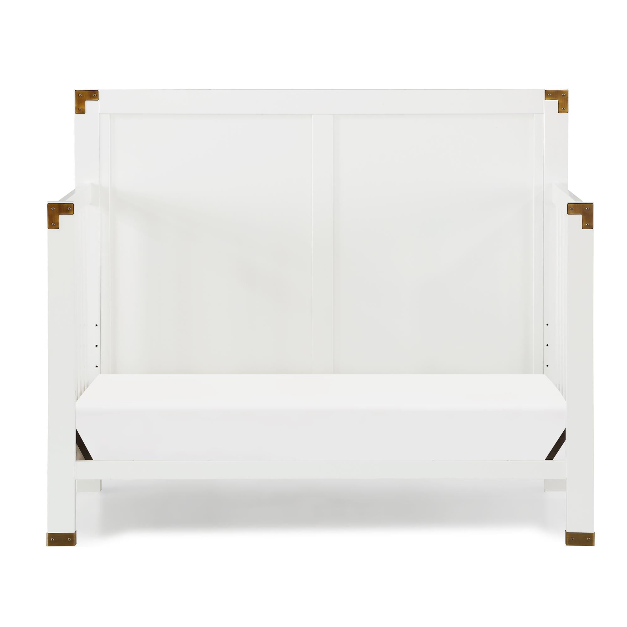 Create a space that is fun and sophisticated with the delightful Miles 5-in-1 Convertible Crib by Baby Relax. Combining campaign and modern style, this charismatic crib is crafted with a sturdy wood construction and features a full panel headboard, vertical slats footboard and simple post style legs. Sleek and safe, this crib comes equipped with four mattress positions that allow you to adjust the height of the platform as your child grows. When your child is ready, the Miles conveniently converts from a crib to a daybed, toddler bed (with the Baby Relax Miles Toddler Guardrail sold separately) and finally a full size bed (frame not included). From functionality also sprang great design with modern features such as clean lines, a fresh classic white finish, and campaign style inspired aged brass decor metal plates that accent the corners of both the headboard and footboard. Combine the Miles 5-in-1 Convertible Crib with the rest of the Baby Relax Miles collection to design a playfully sophisticated nursery room that will live, move and grow alongside your child.
