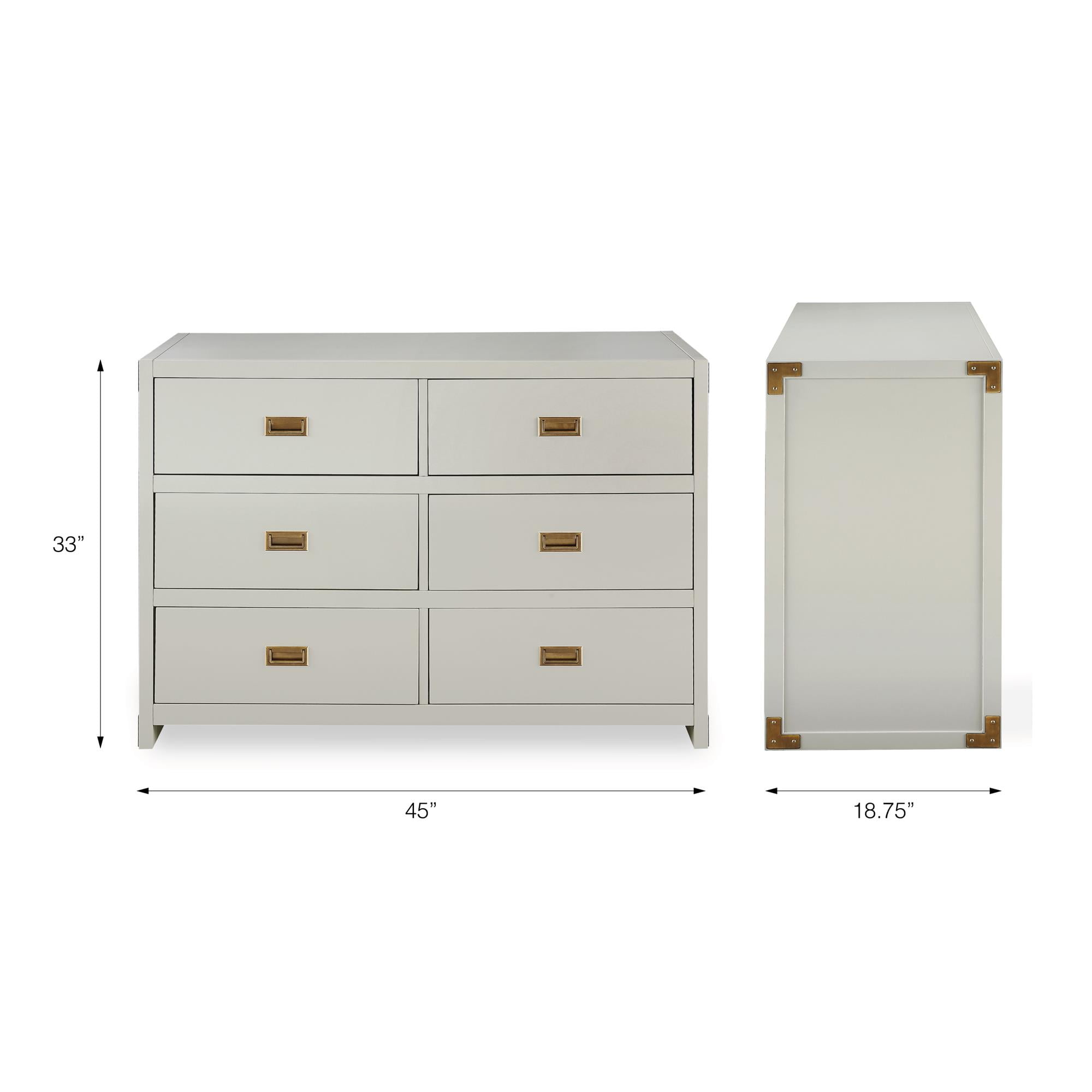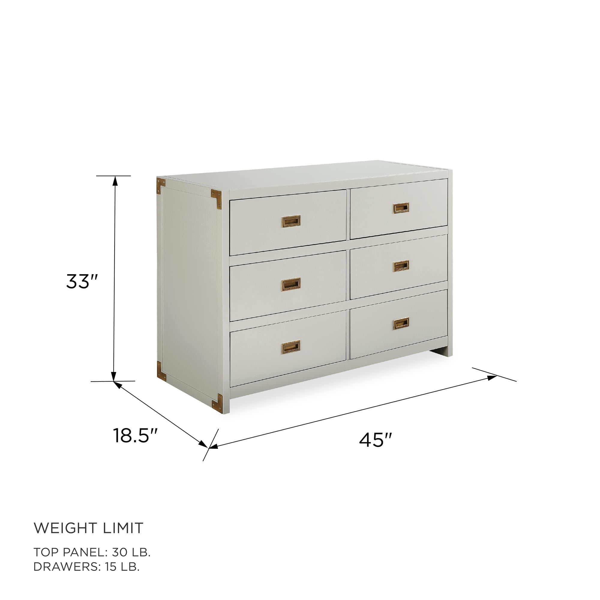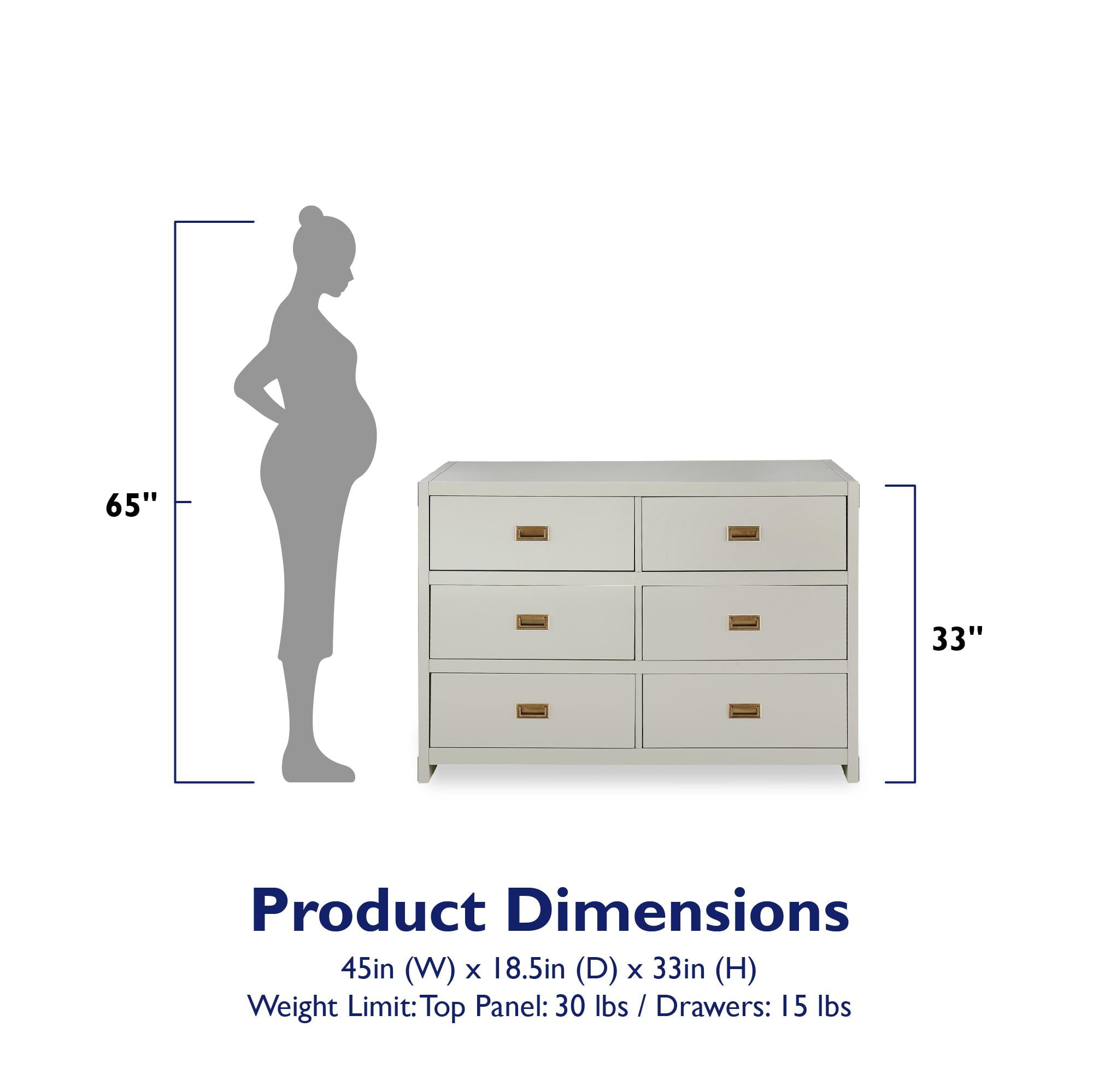 CAMPAIGN STYLE ELEGANCE: Complete your child’s nursery with the perfect storage furniture item. Our 6-drawer dresser with classic finish and sunken brass metal handles not only lets you store your baby’s belongings but also looks beautifully modern MULTIFUNCTIONAL EASE: The strong wood dresser easily fits into a kid’s bedroom and even turns into a diaper changing table with the addition of our removable Dresser Topper (sold separately). Plus, roller glide mechanisms allow smooth drawer access SAFETY MINDED: Parents can stay rest assured knowing that our dresser has met U.S. STURDY Act requirements and includes a tip restraint device to help prevent any injuries caused by accidental tipping and create a protected nursery space for children GUIDED ASSEMBLY: Step by step instructions along with all necessary parts, tools, and hardware are contained in box to simplify the assembly process. Wall anchor strap is included. Discover our entire nursery collection to get a playfully posh look SOPHISTICATED PROFILE: Dresser dimensions: 45″L x 18.75″W x 33″H. Net weight: 110.23 lbs. Top panel weight limit: 30 lbs. Drawer weight limit (each): 15 lbs. Enjoy a 1-year limited warranty against manufacturer defects. Available in multiple colors