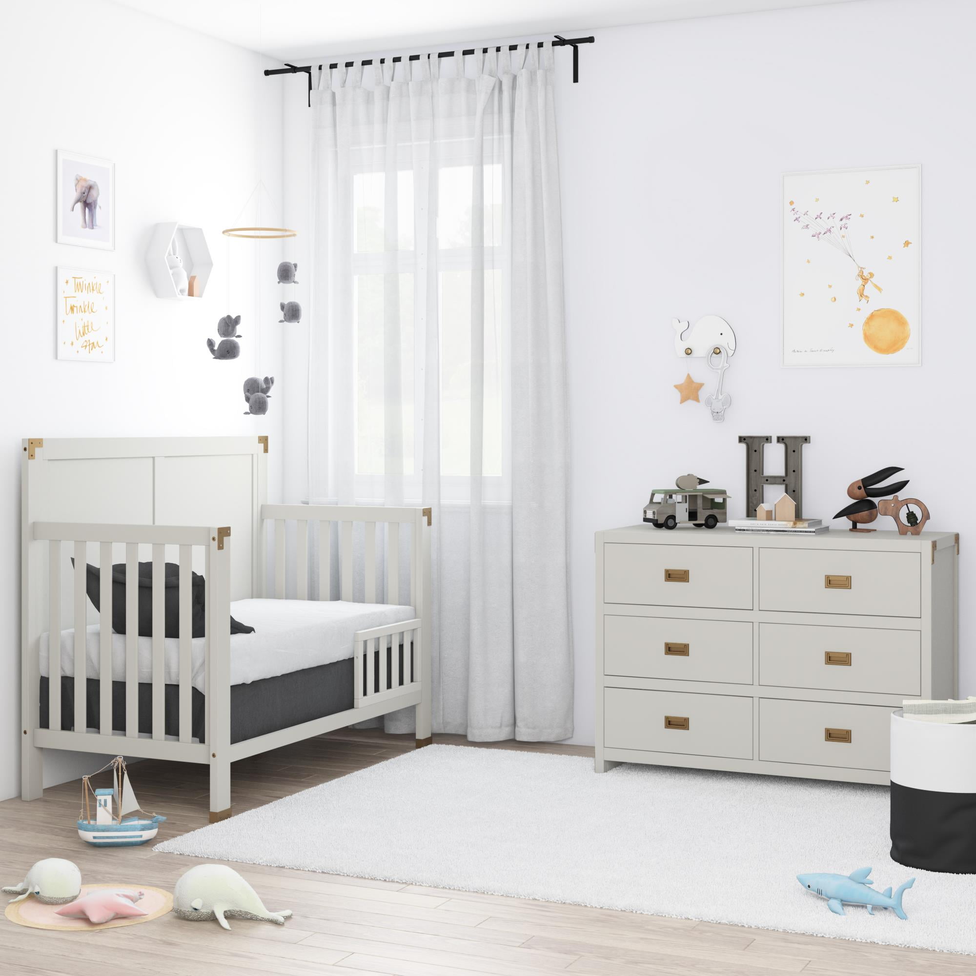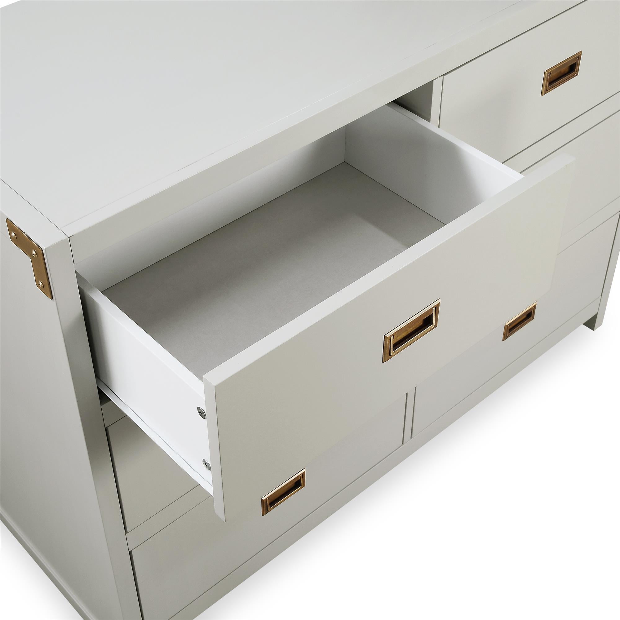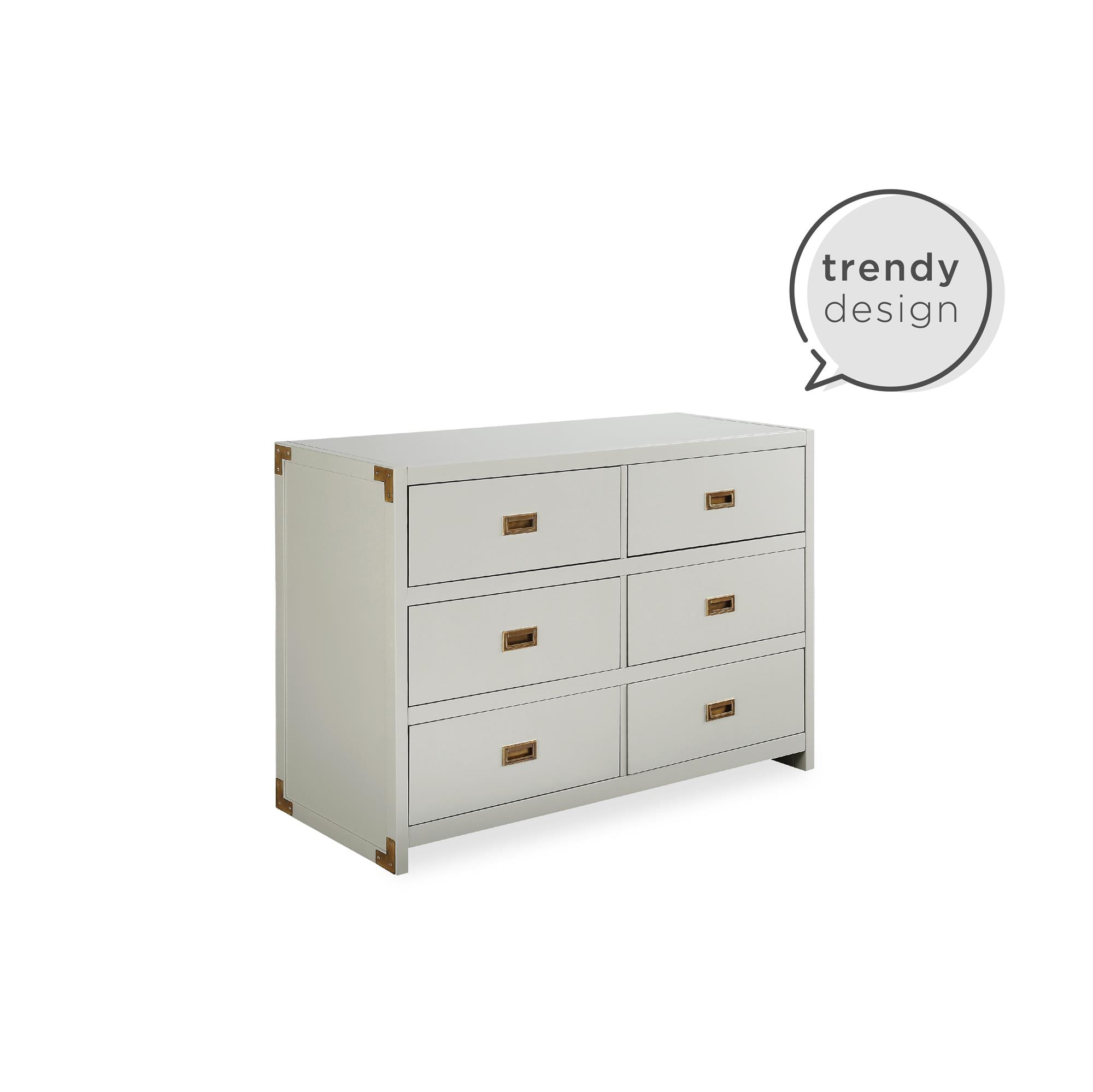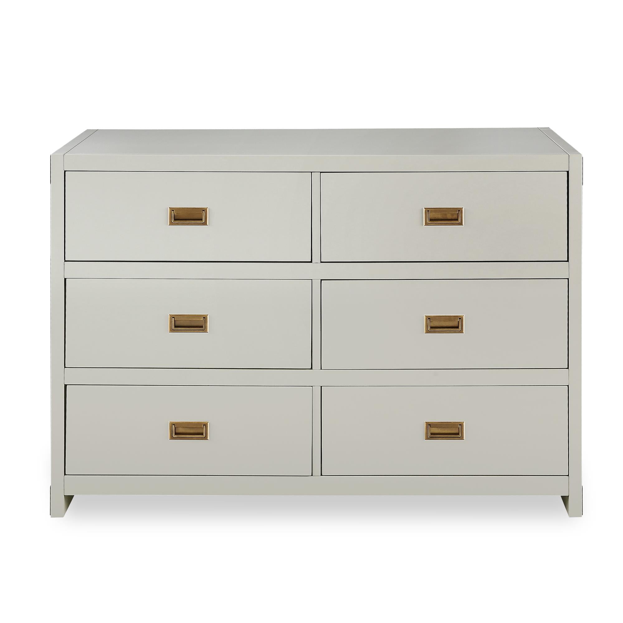 CAMPAIGN STYLE ELEGANCE: Complete your child’s nursery with the perfect storage furniture item. Our 6-drawer dresser with classic finish and sunken brass metal handles not only lets you store your baby’s belongings but also looks beautifully modern MULTIFUNCTIONAL EASE: The strong wood dresser easily fits into a kid’s bedroom and even turns into a diaper changing table with the addition of our removable Dresser Topper (sold separately). Plus, roller glide mechanisms allow smooth drawer access SAFETY MINDED: Parents can stay rest assured knowing that our dresser has met U.S. STURDY Act requirements and includes a tip restraint device to help prevent any injuries caused by accidental tipping and create a protected nursery space for children GUIDED ASSEMBLY: Step by step instructions along with all necessary parts, tools, and hardware are contained in box to simplify the assembly process. Wall anchor strap is included. Discover our entire nursery collection to get a playfully posh look SOPHISTICATED PROFILE: Dresser dimensions: 45″L x 18.75″W x 33″H. Net weight: 110.23 lbs. Top panel weight limit: 30 lbs. Drawer weight limit (each): 15 lbs. Enjoy a 1-year limited warranty against manufacturer defects. Available in multiple colors