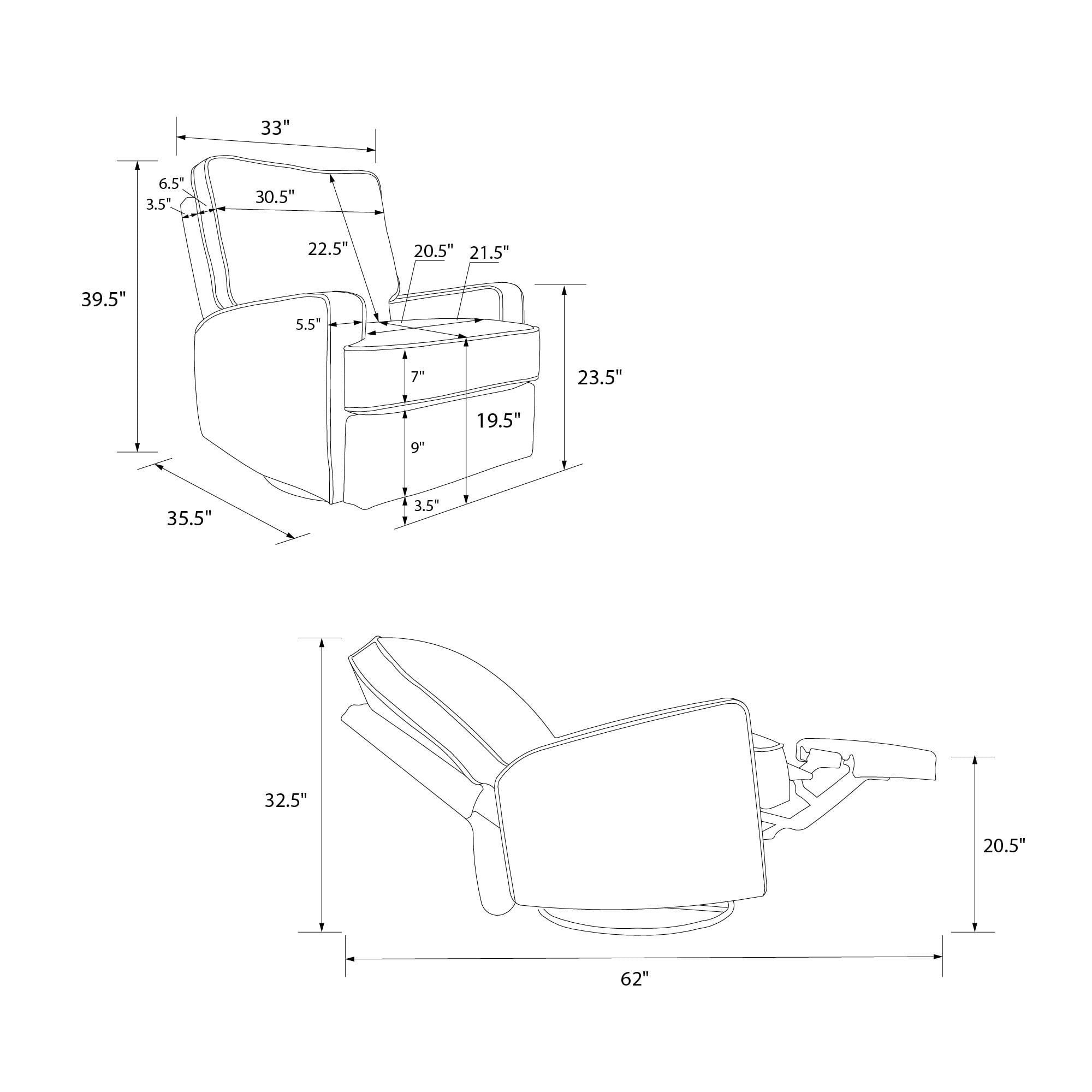 Transitional nursery style with a smooth-edged square shape, our modern upholstered 4-in-1 swivel glider rocker recliner gives your infant simply the best sleep experience with rhythmic rocking, gliding, reclining, and 360-degree swivel chair moves Helping moms and dads everywhere, our comfort focused design includes a cushioned backrest, padded track armrests, and a pocketed coil foam filled T-cushion seat with a hidden lever that prompts pushback recline action and lift up footrest function Lucky to grace any baby room and kids space, living room, or bedroom, this well-built chair utilizes a brawny plywood frame, no-sag spring foundation, steel recline mechanism, and heavy-duty metal base construction to offer continuous support Ships in one easy to handle box with all parts, tools, and instructions included for fast and hassle-free assembly in under 15 minutes. Easy to clean 100% polyester linen look fabric is resilient and wipes free of spills and stains with a damp cloth Recliner dimensions: 35.5″L x 32.5″W x 39.5″H. Weight limit: 250 lbs. Net weight: 81.5 lbs. 1-year limited warranty. Rigorously tested to meet safety standards and flammability requirements. Does not contain flame retardant chemicals. TSCA Certified for formaldehyde