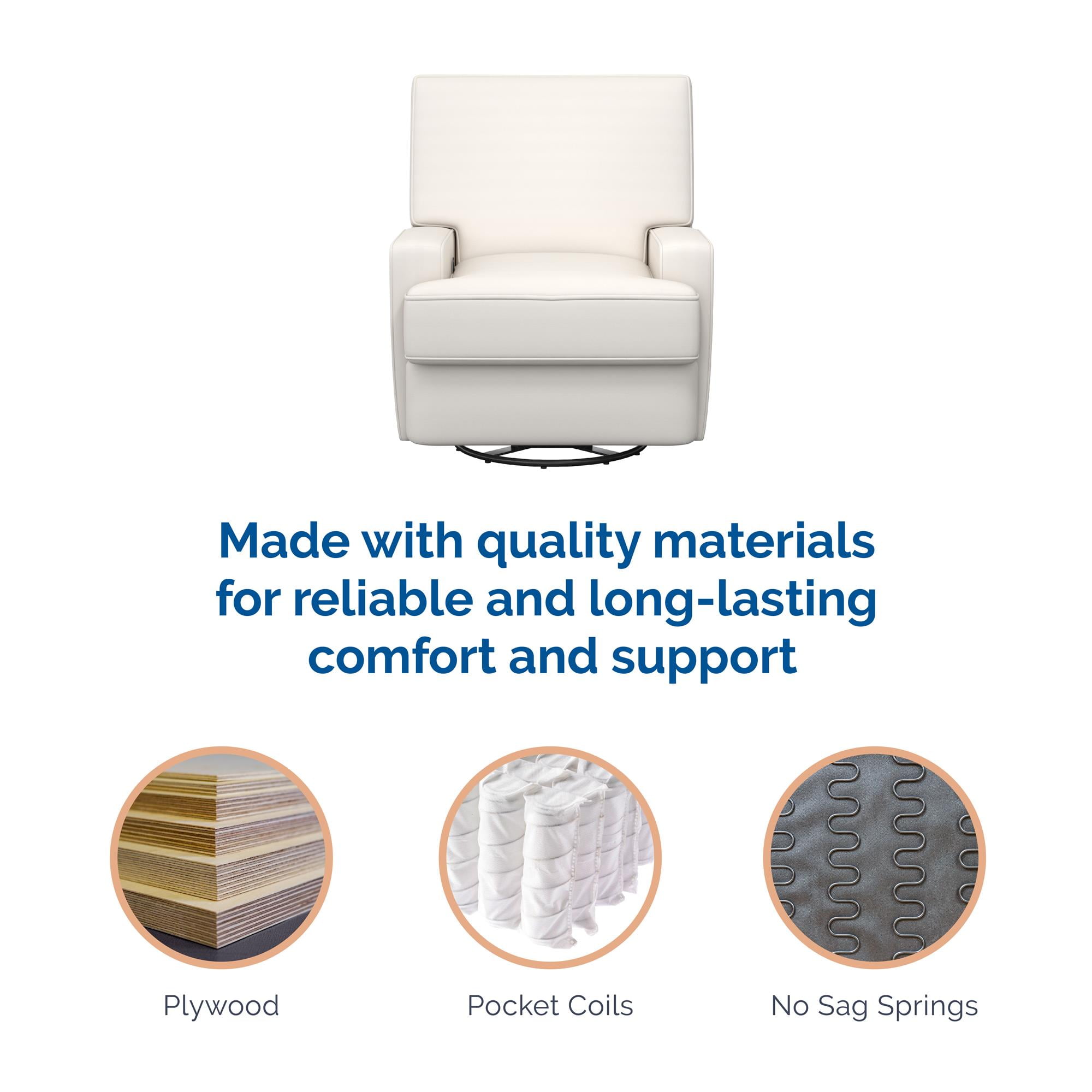 Rest up buttercup, our 4-in-1 Baby Relax Rylan Swivel Glider Rocker Recliner will let your infant doze off comfortably with its sleep-inducing rocking, gliding, reclining, and 360-degree swivel chair motions. A modern nursery must-have, parents need a break and the Rylan’s plushy cushioned backrest, padded track armrests, and pocketed coil foam layered T-cushion seat offer just the right amount of comfort to make late night feedings less stressful. Tucked in between the seat and inner arm, you’ll find an easy pull lever that moves you into a relaxed pushback recline position with a lift up footrest for achy legs. Smooth-edged with classic square lines and soft easy-clean upholstery, our chair can be placed in any living room and bedroom without skipping a style beat. Crafted for durability and expertly tested for safety, the Rylan’s secure plywood frame, no-sag spring foundation, steel recline mechanism, and heavy-duty metal base build are thoroughly supportive and flame-retardant chemical free. Saving you time and effort, allot only 15 minutes for assembly.
