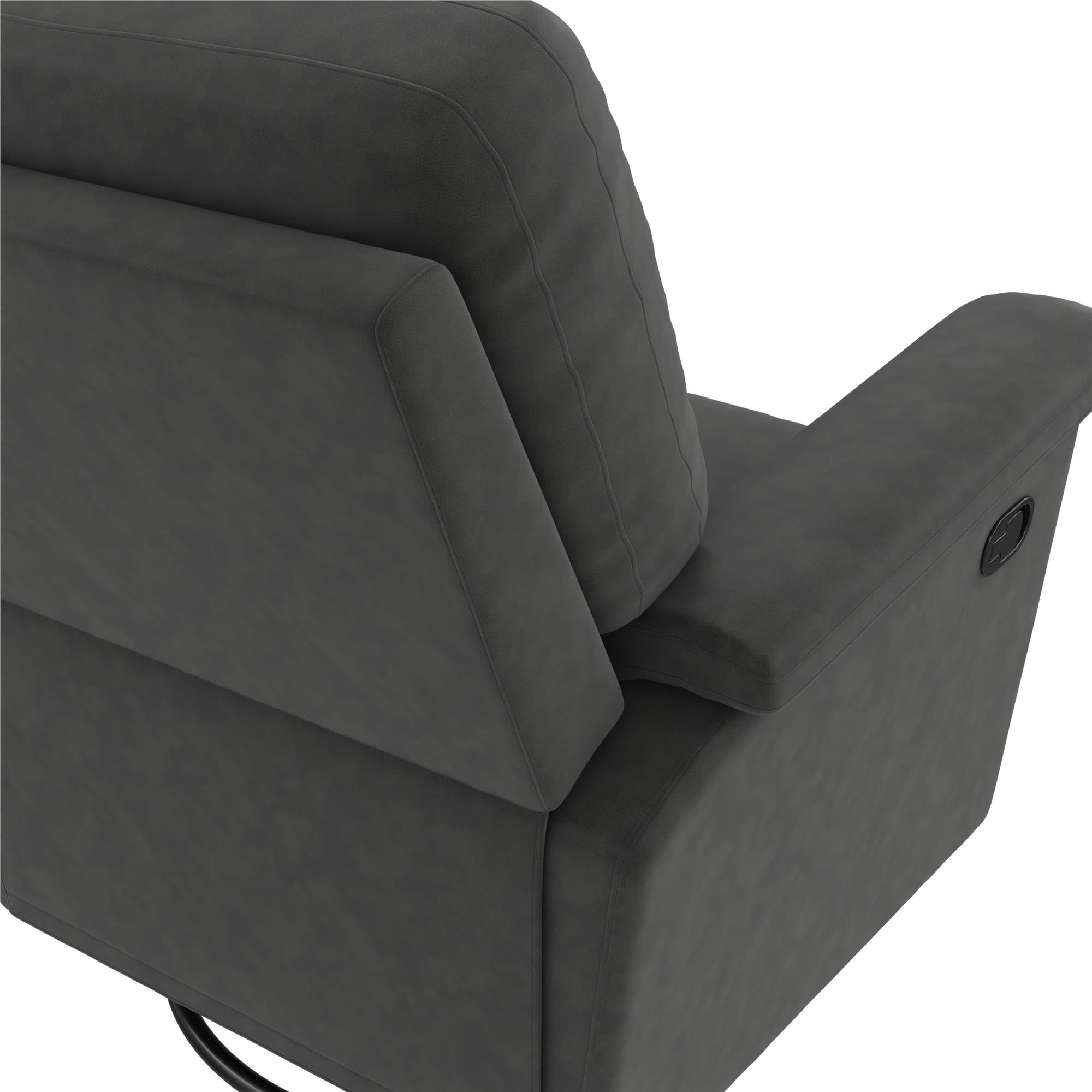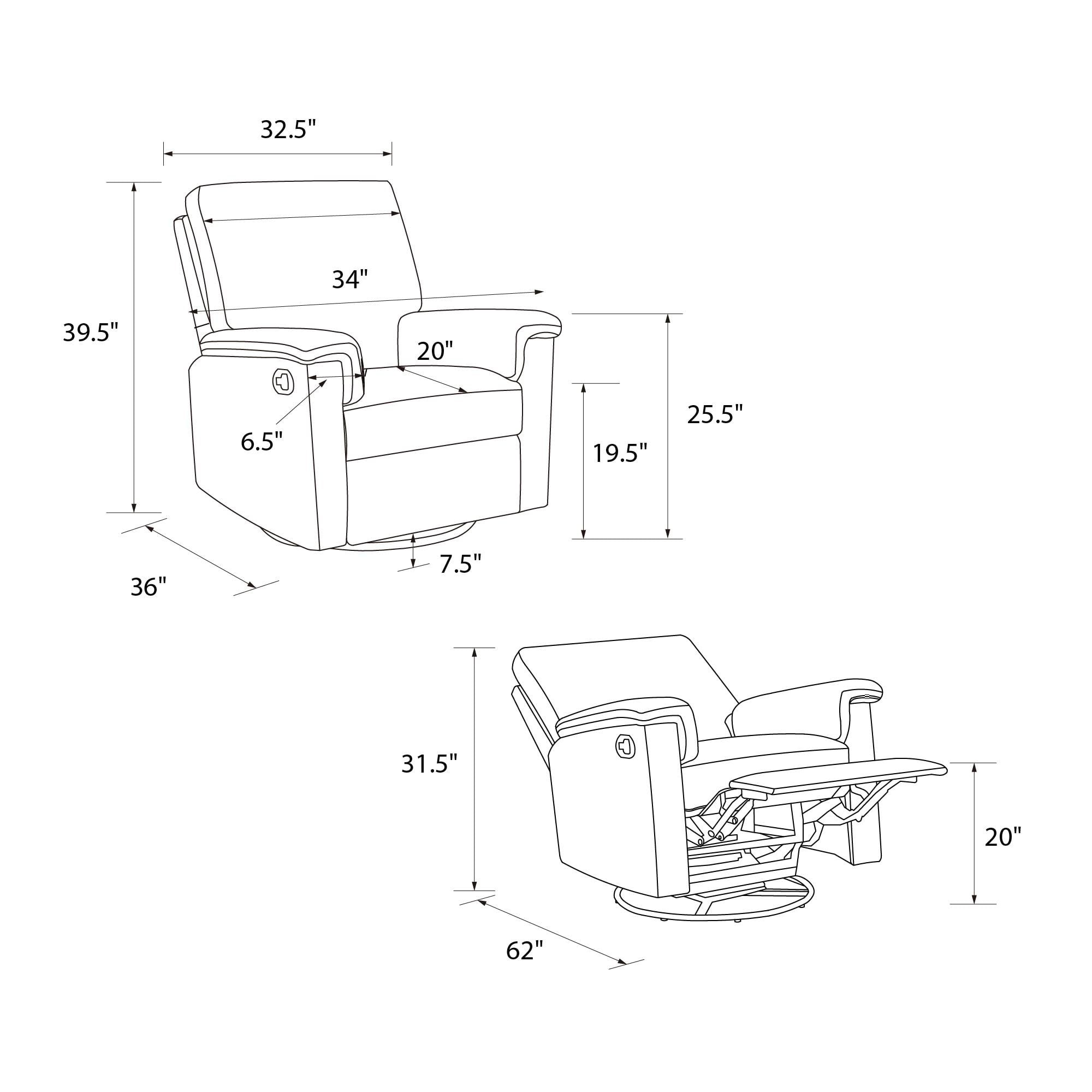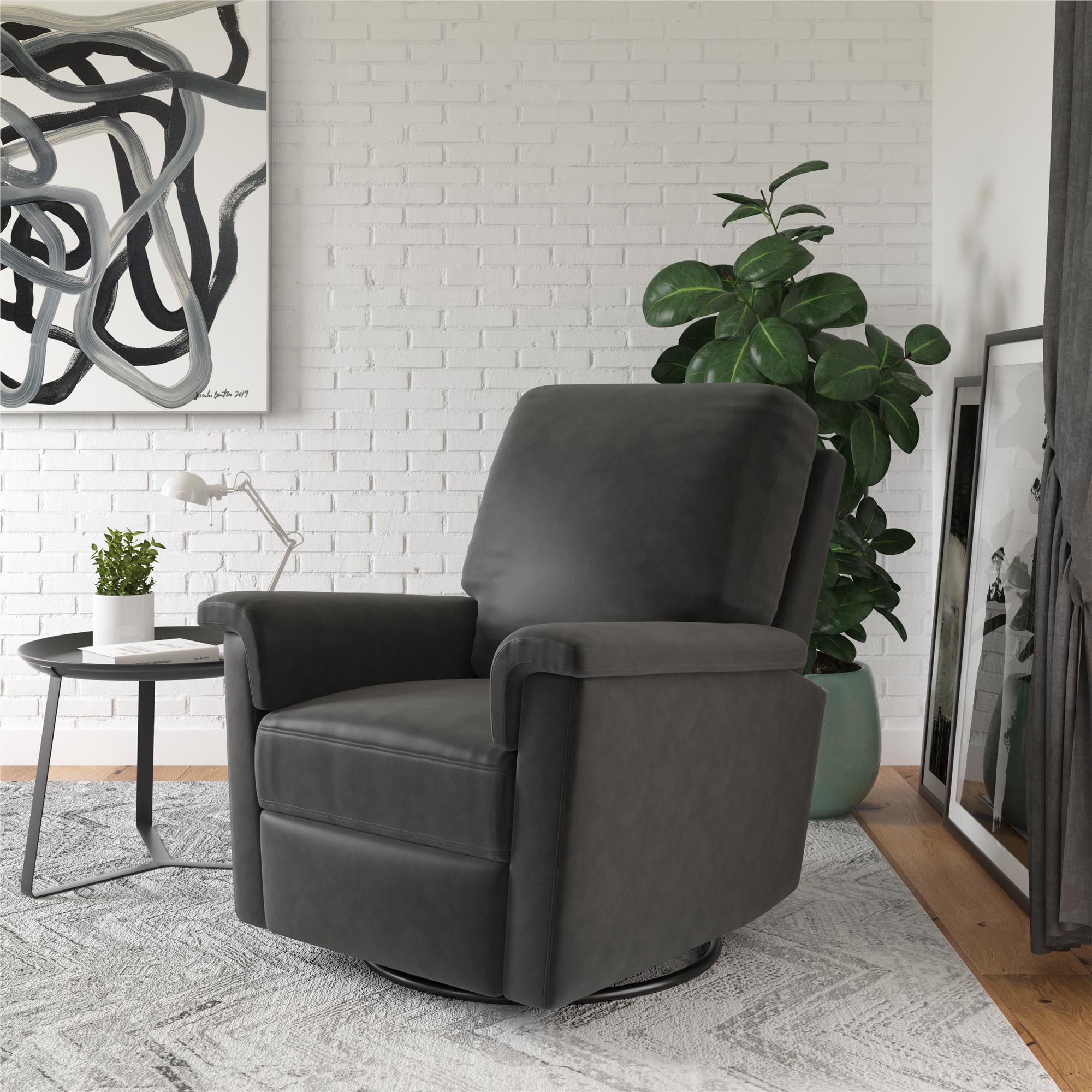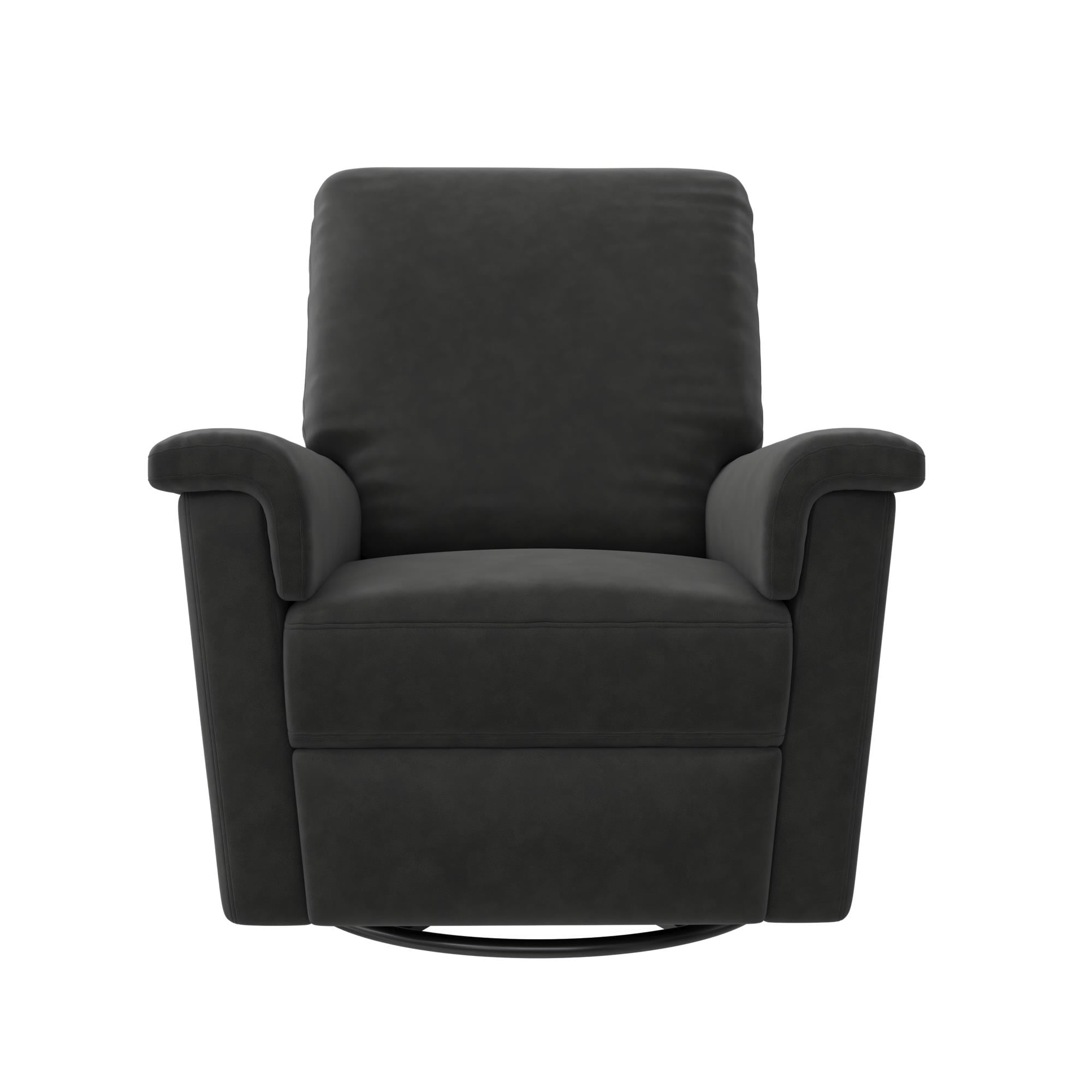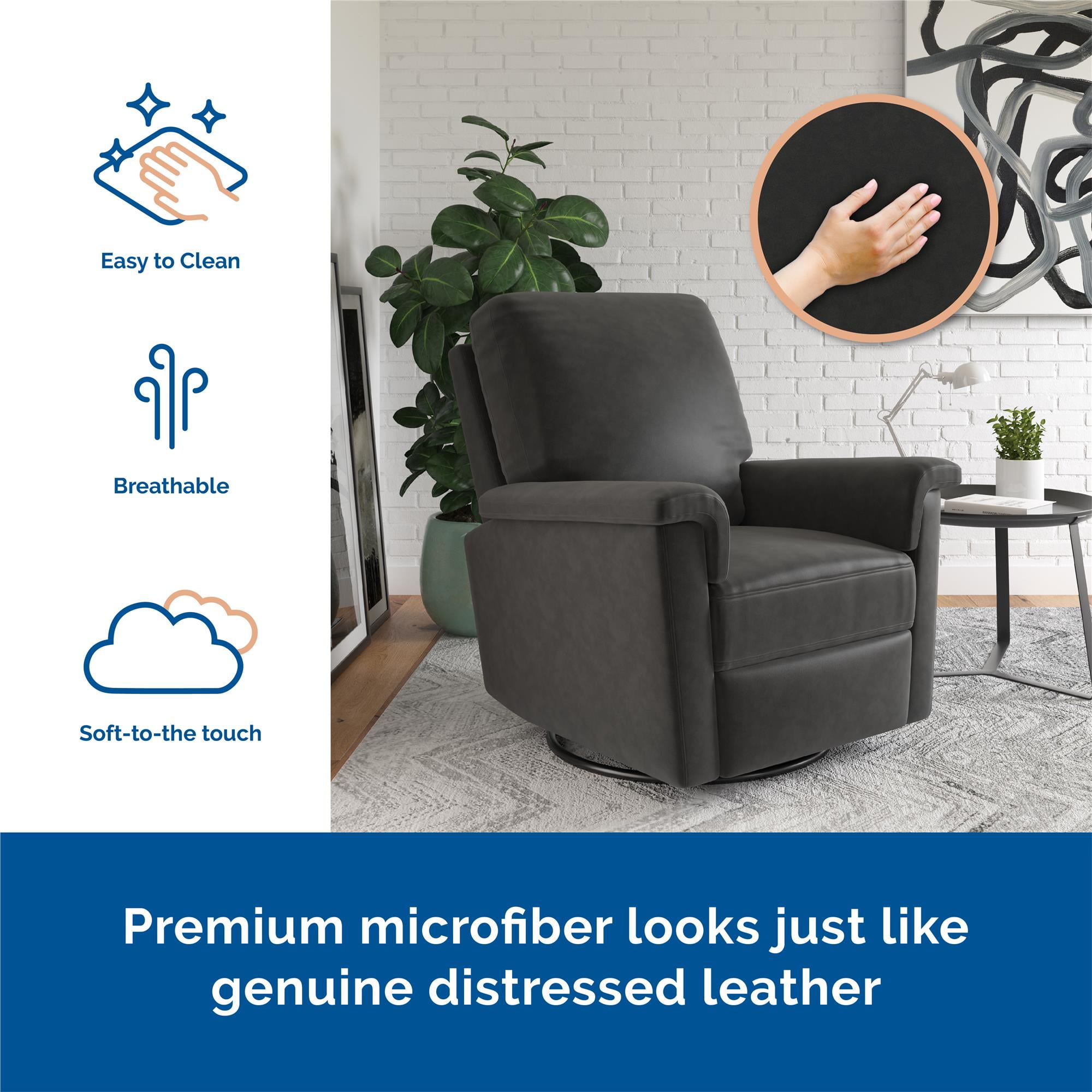 MULTIUSE 3-IN-1 DESIGN: Upholstered in buttery-soft distressed microfiber, the ruggedly handsome modern glider, recliner, and 360-degree swivel chair permits fluid gliding, swiveling, and reclining motion to cajole any cranky infant to sleep easily PARENT & BABY APPROVED: Tailored for moms and dads needing solace, the chair presents a high cushioned backrest, pillowed padded arms, plush foam and pocket spring seating, and a handle-operated pull-out footrest with pushback recline flexibility FROM THE NURSERY TO BEYOND: Not baby room exclusive, our accent chair melds with any living room decor and offers prime support with solid construction elements like a plywood frame, no-sag spring foundation, steel recline mechanism, and metal base RAPID BUILD: All parts, tools, and instructions are included in box for simple assembly in under 15 minutes. Resistant to overcooling and overheating, the easy to clean distressed microfiber fabric does not leave handprints or track marks behind SAFE & SOUND: Dimensions: 32.5″L x 36″W x 39.5″H. Weight limit: 300 lbs. Net weight: 86 lbs. 1-year limited warranty. Rigorously tested to meet safety standards and flammability requirements. Does not contain flame retardant chemicals. TSCA Certified for formaldehyde