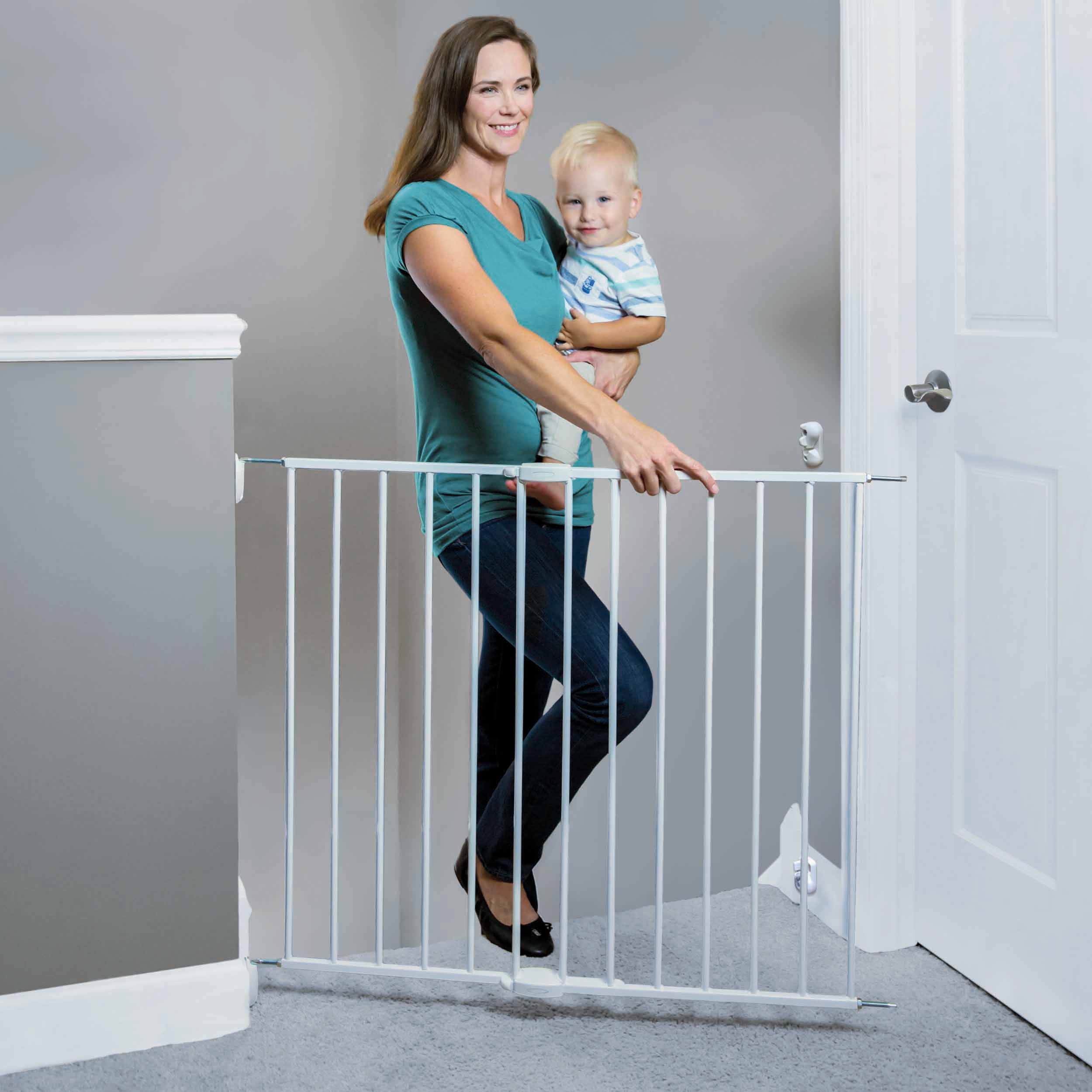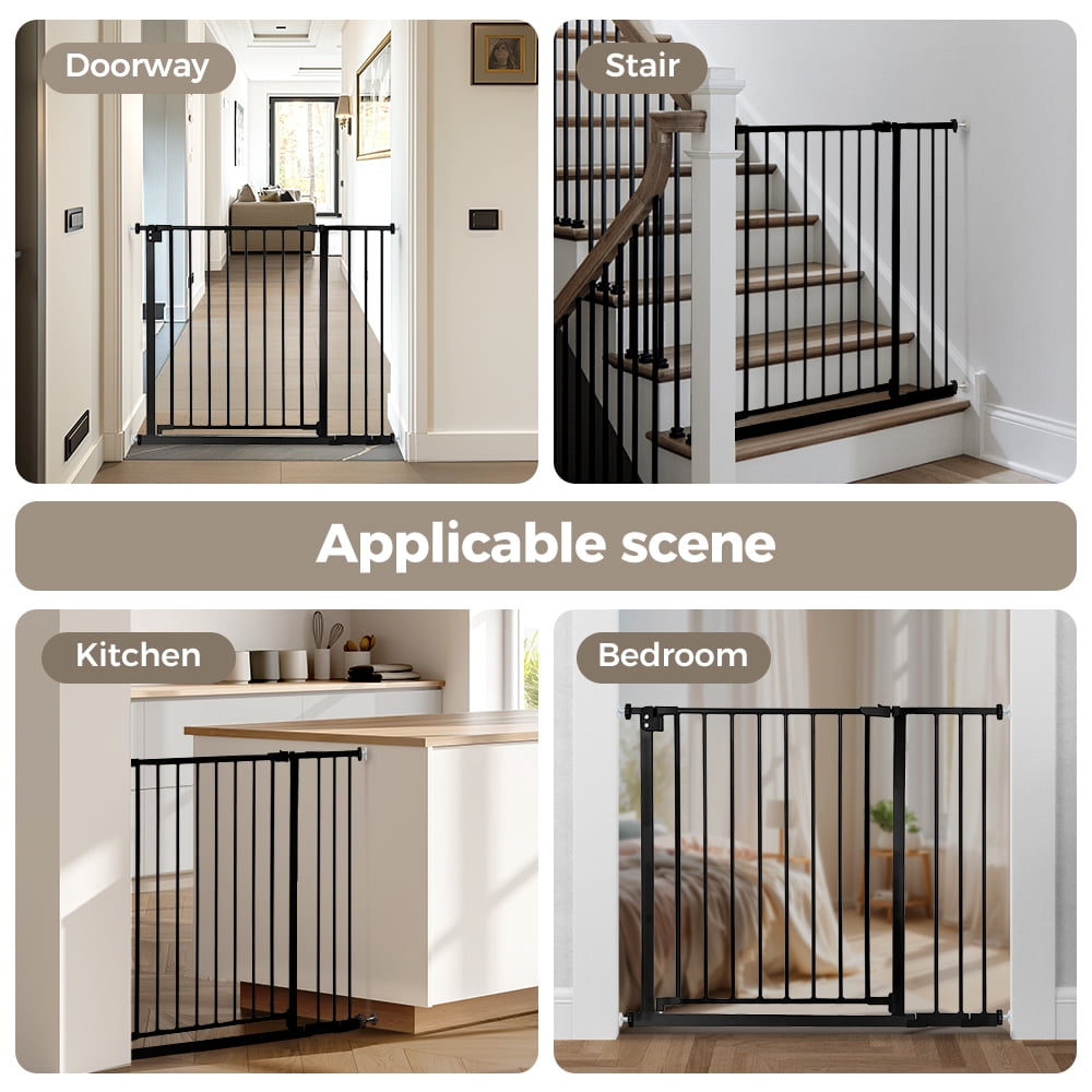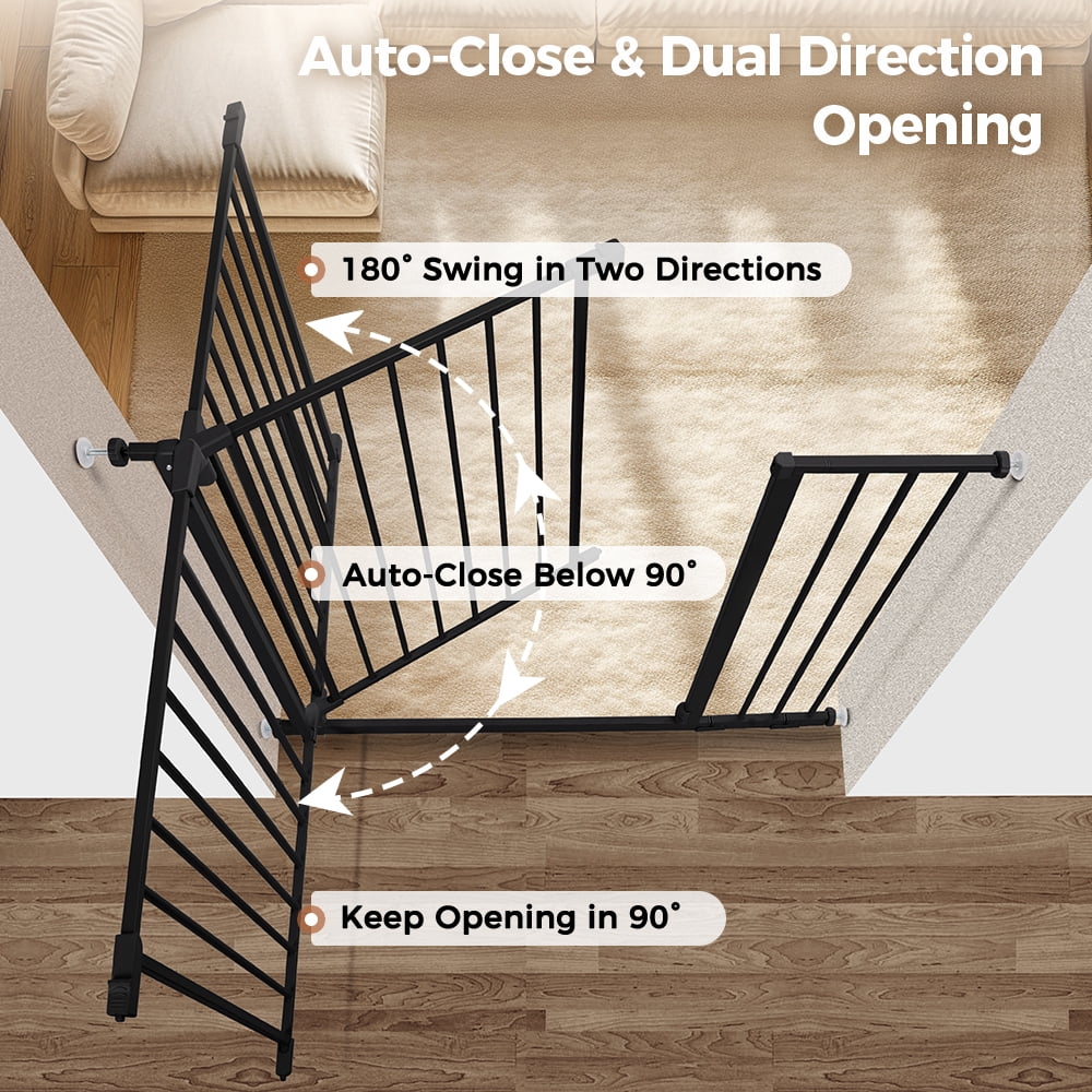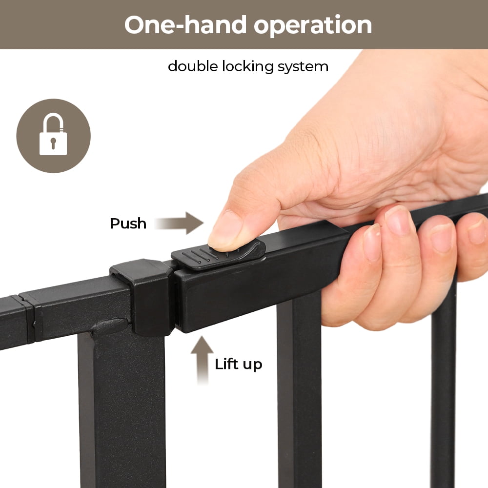 Caveen Extra Tall 30″ Wide 29.5”- 40.5″ Auto Close Baby Gate with Swing Door Small Pet Door for Cat Dog Doorway Stairs-Black/White An essential tool for homes with pets, the Caveen Gate is Extra Wide providing a convenient, chew-proof way to contain and protect both your pet and home. It’s made of heavy-duty, non-corrosive steel with a neutral white or black finish to complement most decors. The extra-wide walk-through pet gate includes a lever-style handle with a one-touch release safety lock that lets you open and close it easily, allowing for convenient and frequent use. It’s also expandable accommodating openings between 29.5″ to 40.5″ and features a pressure mount system that eliminates the need for drilling holes into walls. In addition, the Carlson Pet Gate, Extra Wide, features an 7.6″ x 10.1″ door that lets smaller animals pass through while keeping everyone else out. It’s also lead-free and non-toxic making it a safe and effective way to restrict pets, and even children from entering certain areas of the home. Some assembly is required.
