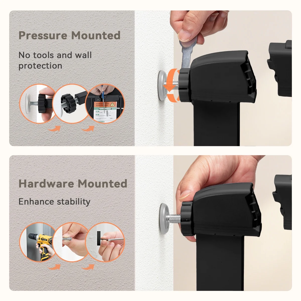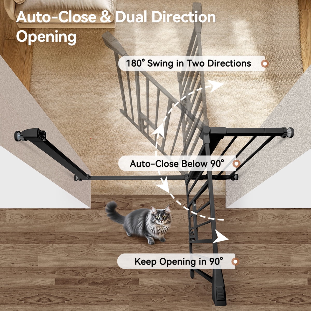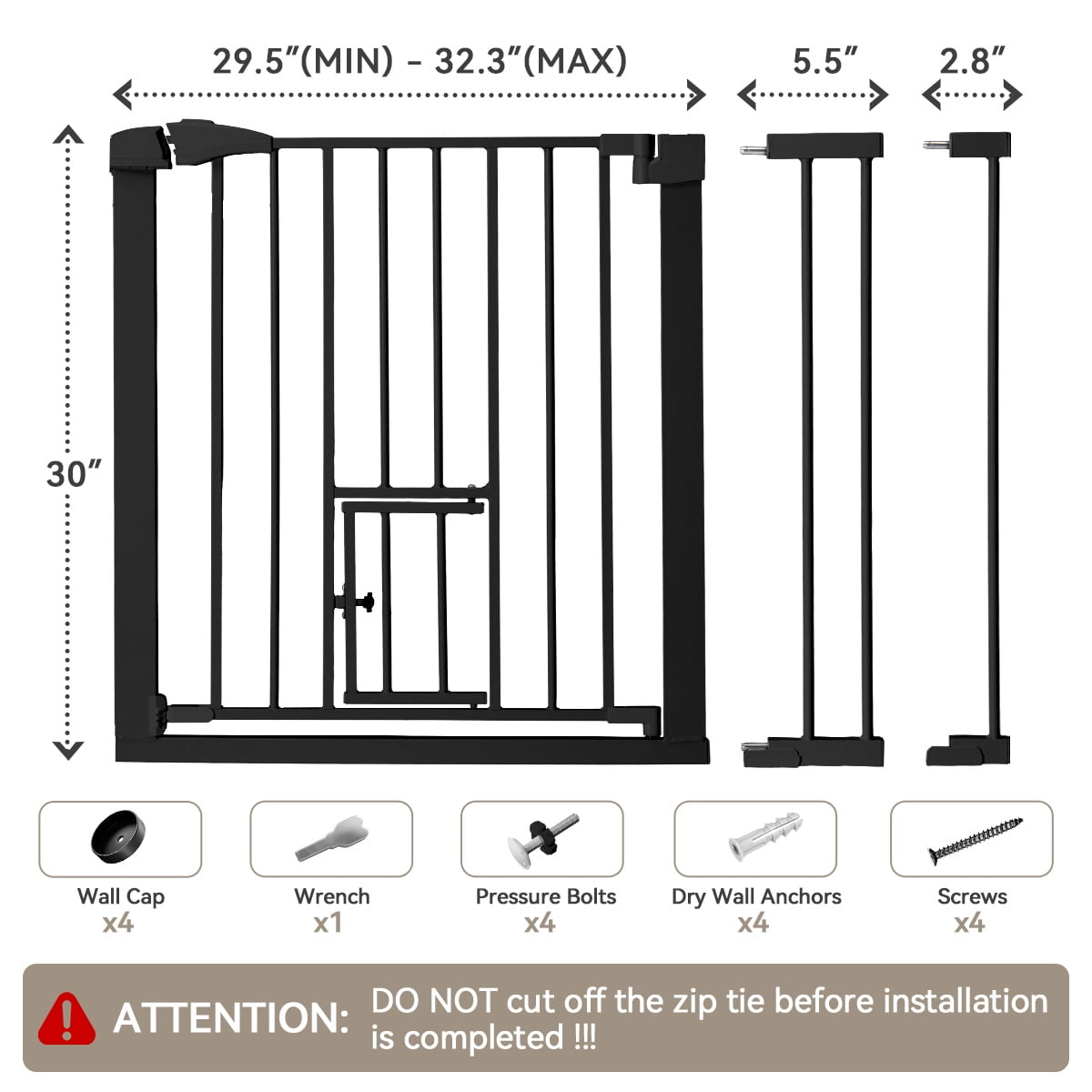 【Convenient Lockable Pet Door】Featuring a lockable pet door measuring 7.63 x 10.28 inches, this gate provides easy access for your pets while ensuring the safety of your family members. The pet door can be opened or locked as needed, making it perfect for managing pet routines and preventing disputes between pets or between pets and family members. 【Baby Safety Gate & Pet Gate】With a width adjustable from 29.5 to 40.5 inches using the included extensions, this pet gate doubles as a baby gate and fits various openings in your home. It’s suitable for doorways, hallways, stairs, and outdoor access points. This gate is ideal for restricting access to areas with pet supplies, litter boxes, or other spaces you want to keep off-limits to children or pets. 【One-Hand Operation】The gate is designed with a simple buckle mechanism that allows for easy, one-handed operation—perfect for when you’re carrying groceries, holding your baby, or managing multiple tasks. The auto-closing feature activates when the gate’s opening angle is less than 90°, ensuring the gate closes securely behind you for continuous confinement and safety. 【Double Locking System】Equipped with a two-tiered lock that requires an upward lift to unlock, this gate deters curious toddlers and clever pets from opening it. The anti-pinch hinge design ensures safe exploration, preventing little fingers and paws from getting caught. This makes it a reliable baby gate and pet gate, providing peace of mind as your loved ones explore their environment. 【Pressure-Mounted Installation】Choose between pressure mounting for a drill-free setup or a sturdier drill-mounted option. With easy installation and removal, this gate is perfect for novice users.
