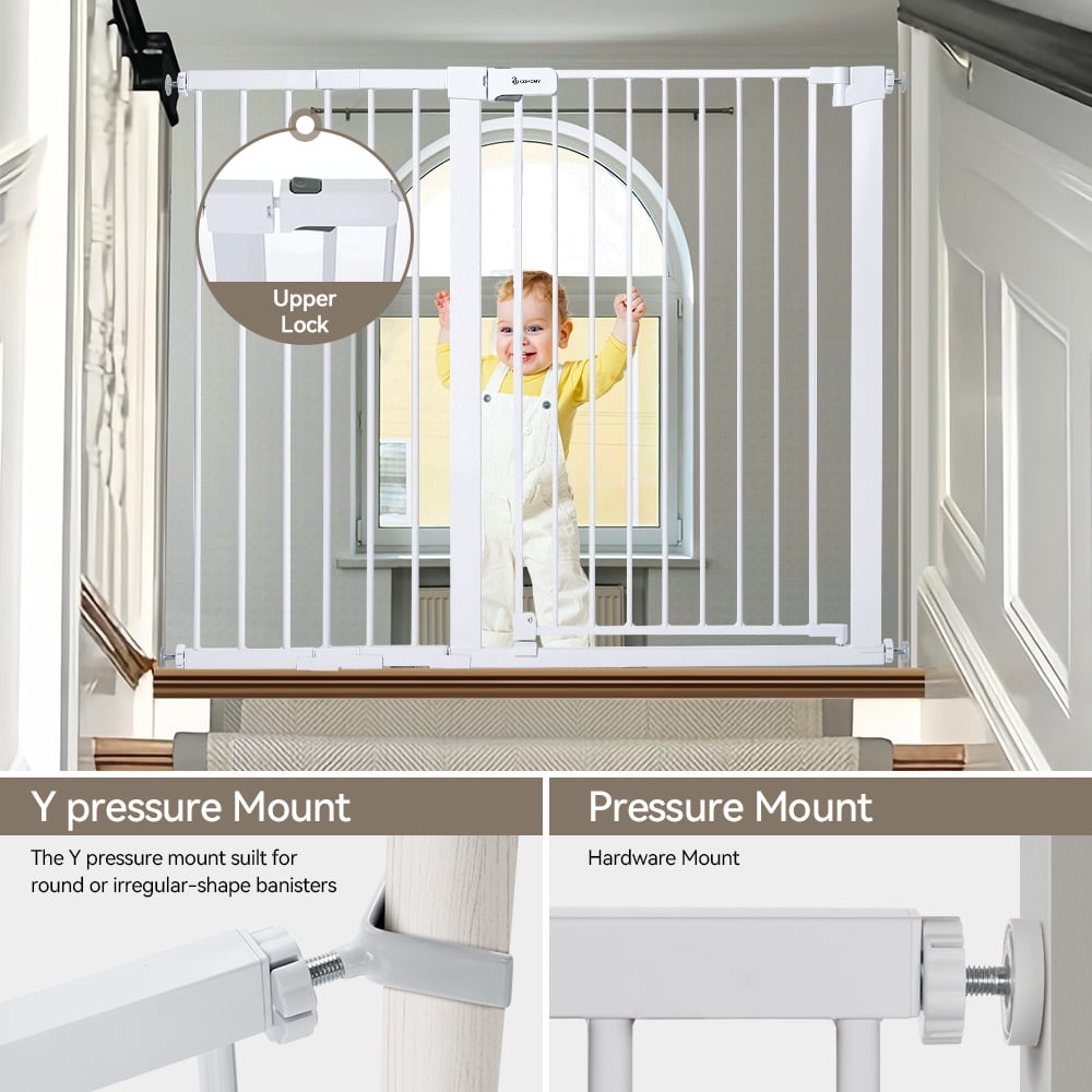 This baby gate for stairs and entryways is 36 inches tall and adjusts from 29.5 to 48.8 inches wide; ideal for keeping larger toddlers, puppies, or dogs from accessing off-limit areas in your home. This pressure-installed baby gate does not require any tools and will not damage the wall, suitable for stairs, corridors. Even if you are holding a baby, it can be opened with one hand, so you don’t have to worry about forgetting to lock the safety door. No worries about forgetting to lock the dog fence, it will close automatically, easy one-hand operation. The kid gate bar has a double safety door lock system, adults can open it easily but babies can’t open it easily, for 6-24 monthskids. Made of steel that can withstand high impacts of up to 100 lb, maintaining safety and durability. Designed for doorways, hallways, the bottom of stairs, kitchens, laundry rooms, bedrooms, and playrooms.