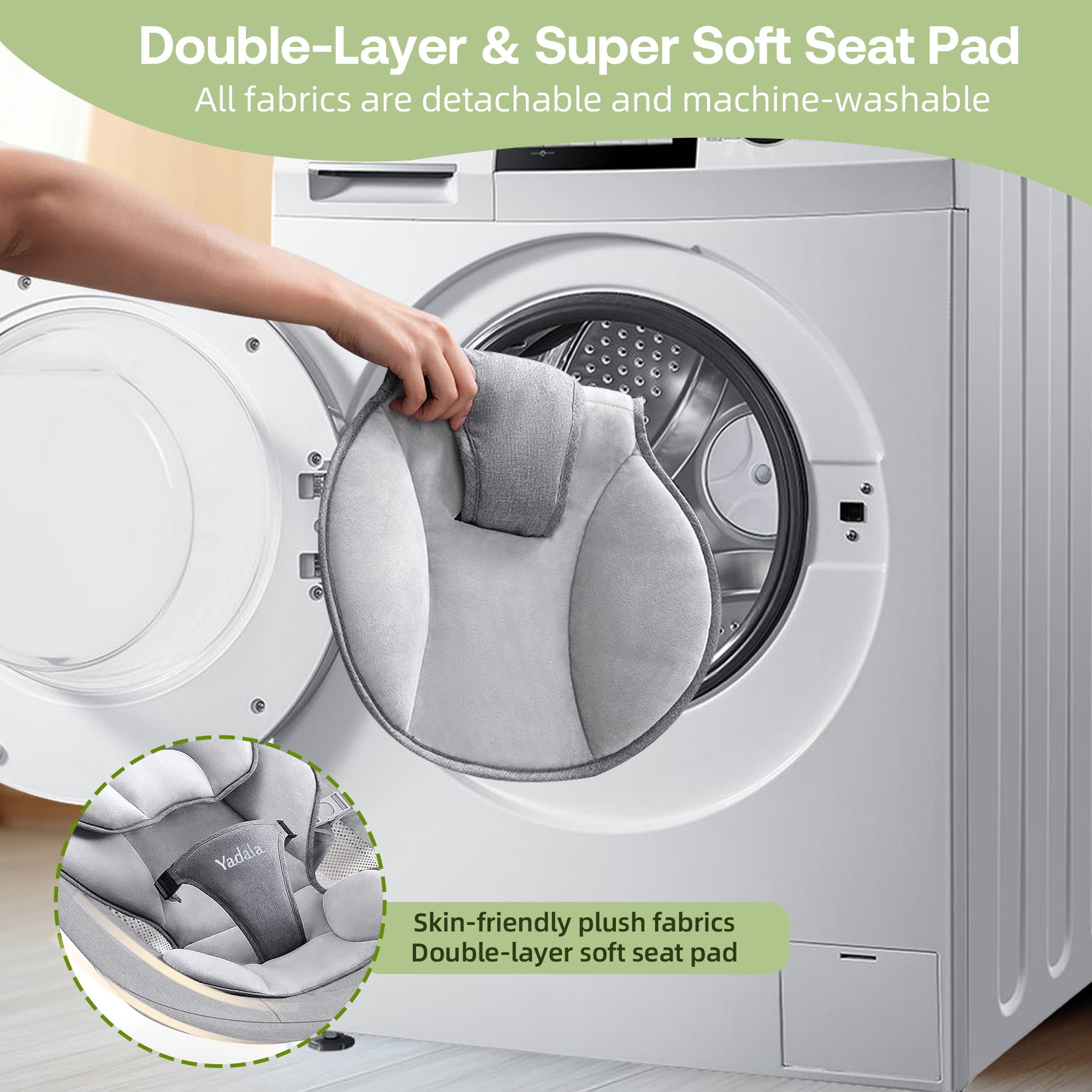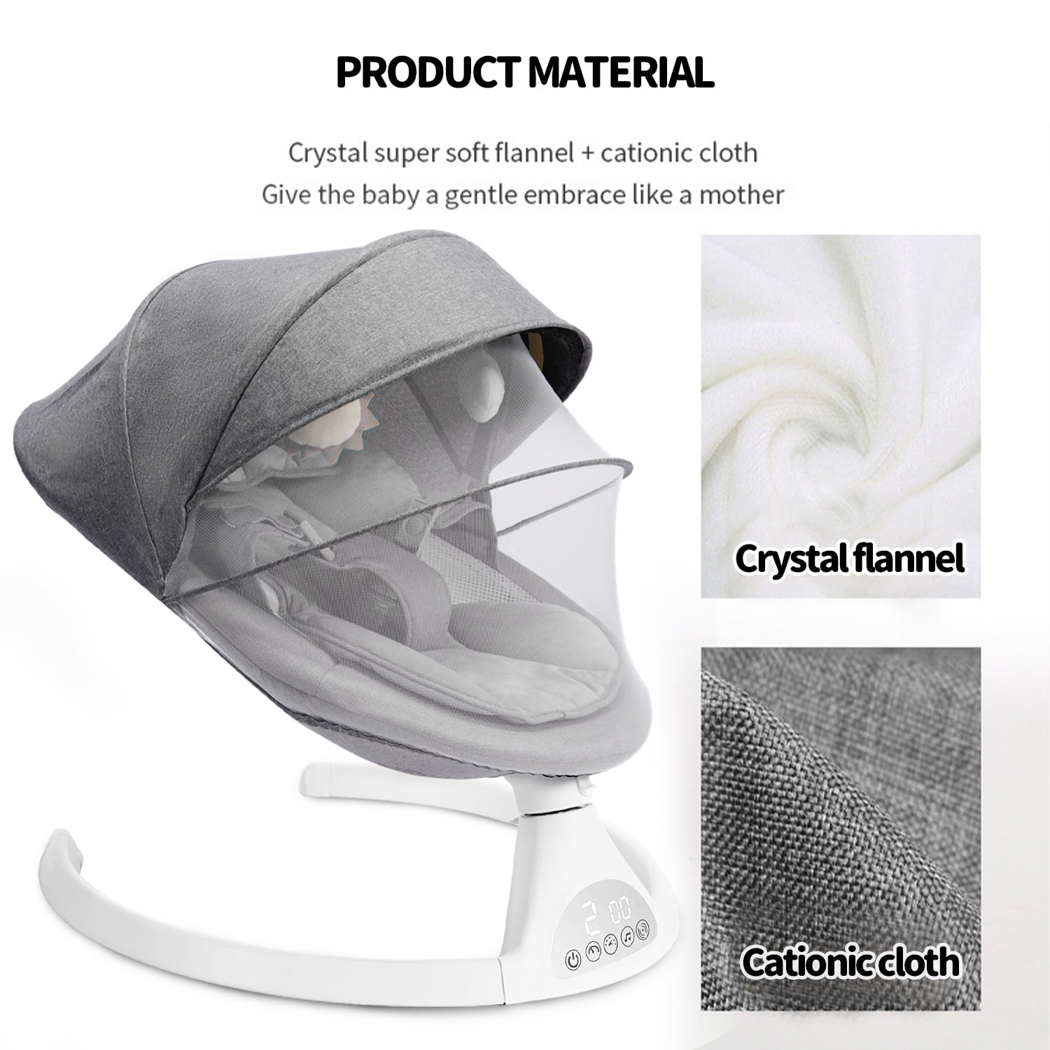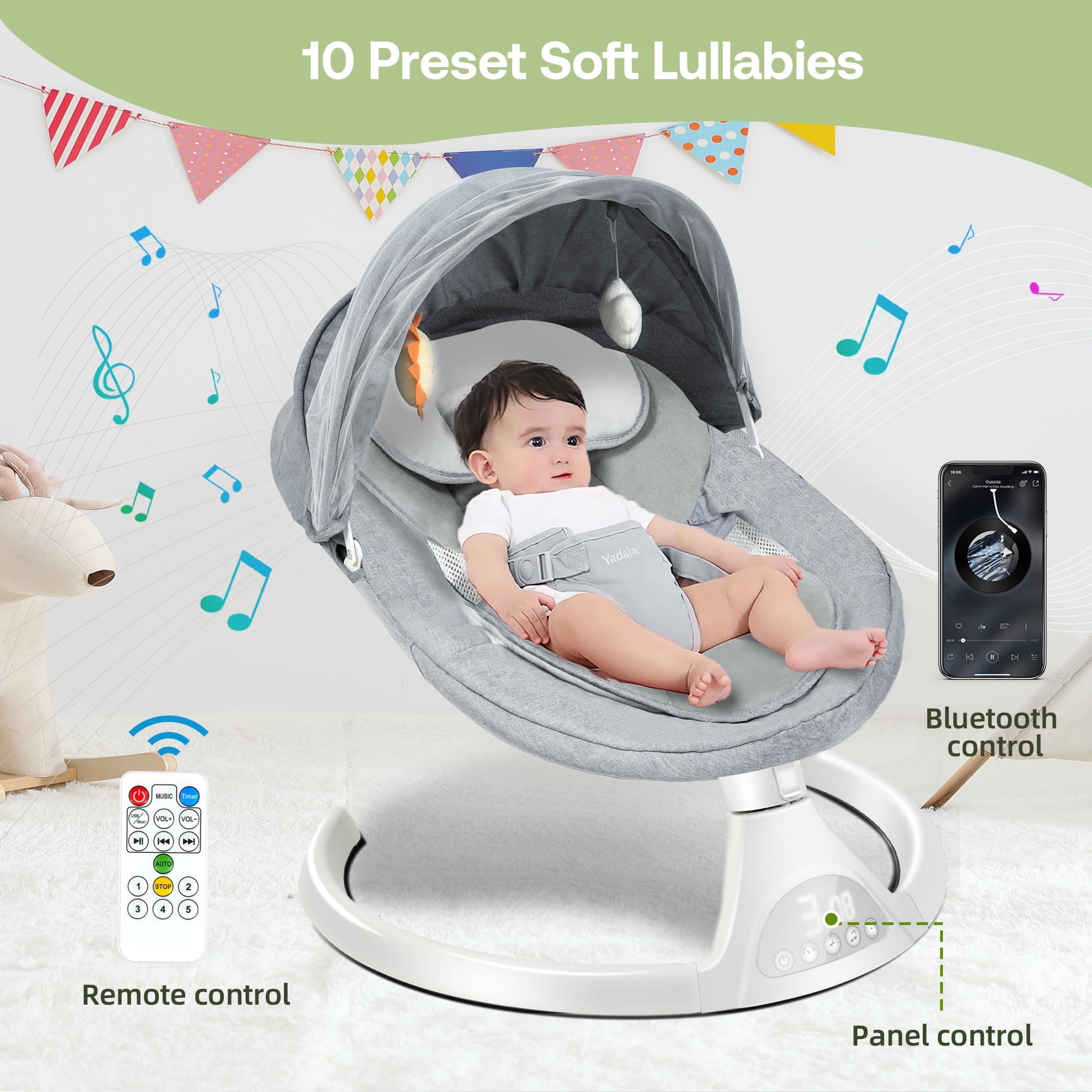 The firm headrest is specially designed to support the baby‘s head and prevent the baby’s head from tilting to one side. The adjustable five-point safety harness can prevent the baby from sliding off to ensure the baby’s safety very well. The high-quality metal aluminum base and anti-skid grips provide stability for the baby bouncer seat for babies 0-12 months or up to 26 lbs. The double-layer seat pad is made of high-quality soft fabrics for ultimate comfort at home, and they are machine washable and reversible for convenience. Not only do babies feel comfortable, but the parents also feel more worry-free. A breathable mosquito net and 2 plush toys are included. The Yadala swing for babies replicates the natural motion of parents, and sways from side to side to comfort your babies. Our infant swing comes with 5 different swing speeds, so you can find the right soothing pace to quickly calm and relax your baby. You are convenient to set the time to 15, 30, 45 minutes to save your time and energy. This baby rocker for infants has 10 preset lullabies. It also allows you to play your baby’s favorite soothing songs or nursery rhymes from your phone, offering peaceful or joyful moments for your little one. The touch panel and remote control make operating the swing baby more flexible and easier. You just need about 3 minutes to quickly install. The lightweight design and quick fold make this outdoor baby swing an ideal choice for travel. The swing for baby can be plugged in for use indoors and powered by a power bank when outdoors. Whether going to the grandparents’ house or on a weekend picnic, the portable baby swings for infants can ensure babies always have a familiar and comfortable resting space.