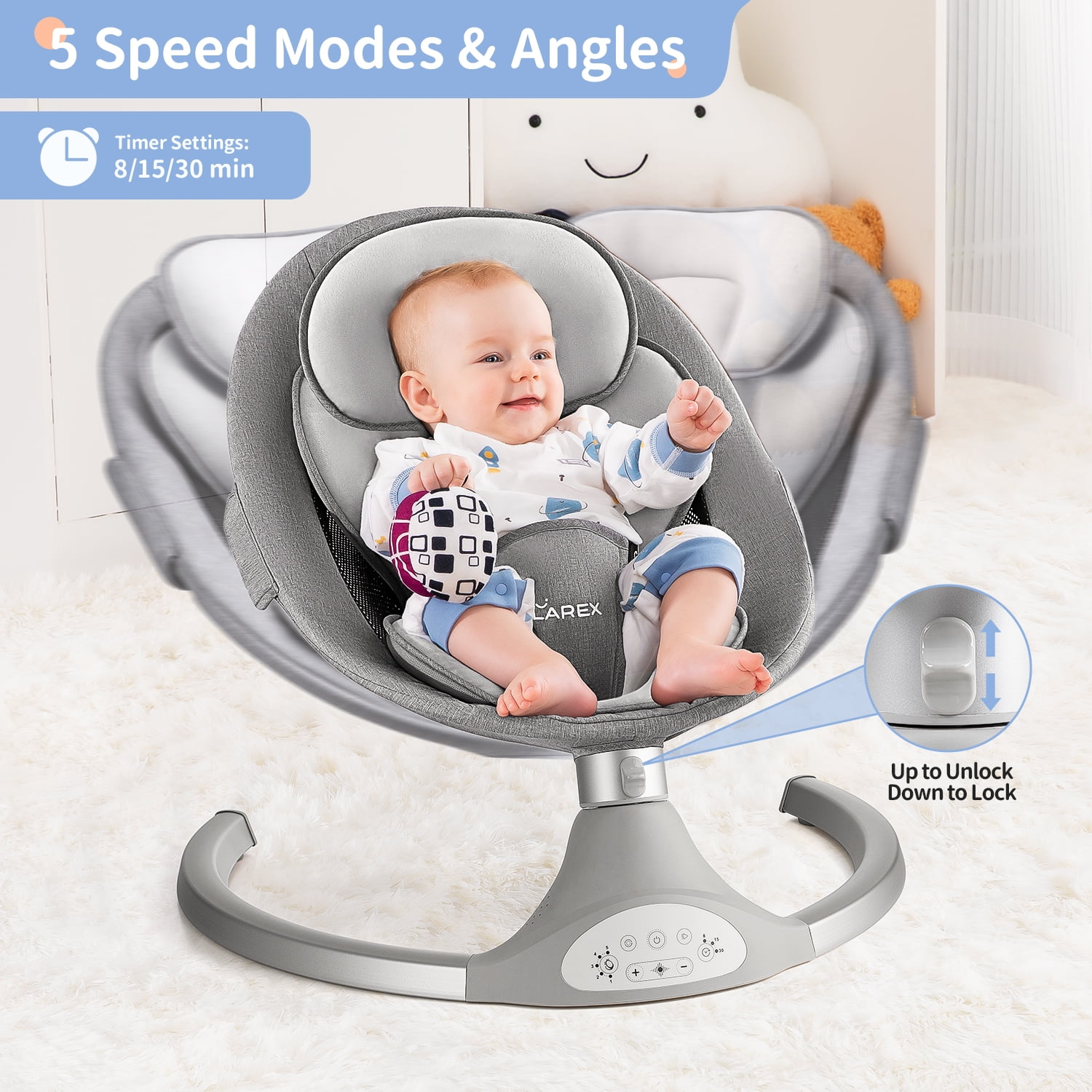 [5 Natural Swing Speeds] Our infant swing come with 5 different swing speeds,so you could find the right soothing pace to quickly calm and relax your baby [Touch Panel&Remote Contol]2 Way Control makes operating the baby swing flexible and easy.Parents can select the desired preset lullabies and timer setting of 8,15 or 30 minutes [Bluetooth Music Player]:This baby rocker for infants has 10 preset lullabies.It also allows you to play your baby’s favorite soothing songs or nursery rhymes from your phone,offering peaceful or joy moments for your little one [Ultra-Soft Removable Seat Pad&headrest]:Made of high quality soft fabrics for ultimate comfort on at home,and they are machine washable and reversible for convinience.2 plush toys included [Great for Any Newborn]:This newborn swing is featured with 3-Point Safety Harness,3 Seat positions,plug-in power | For babies 0-12 months or up to 20lbs