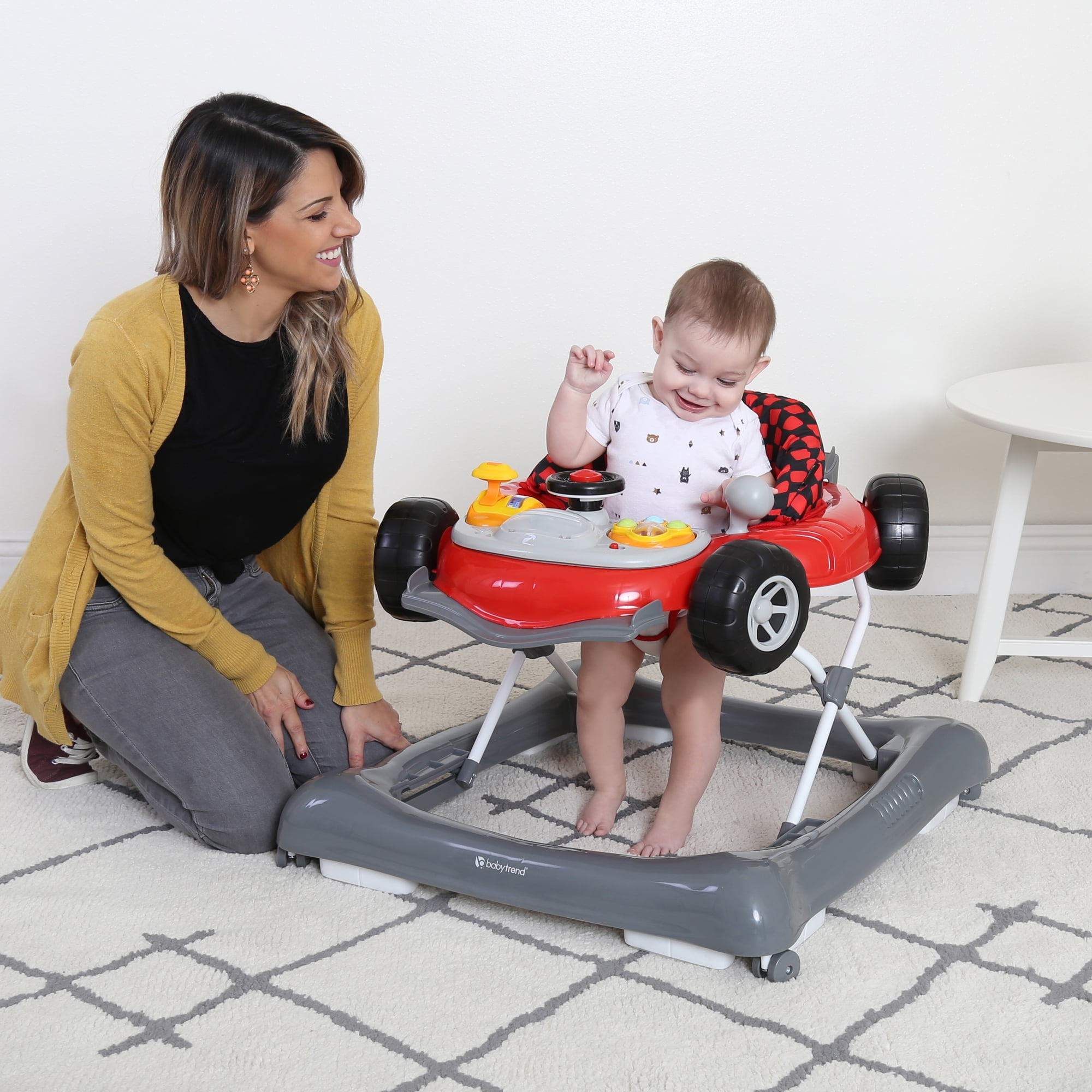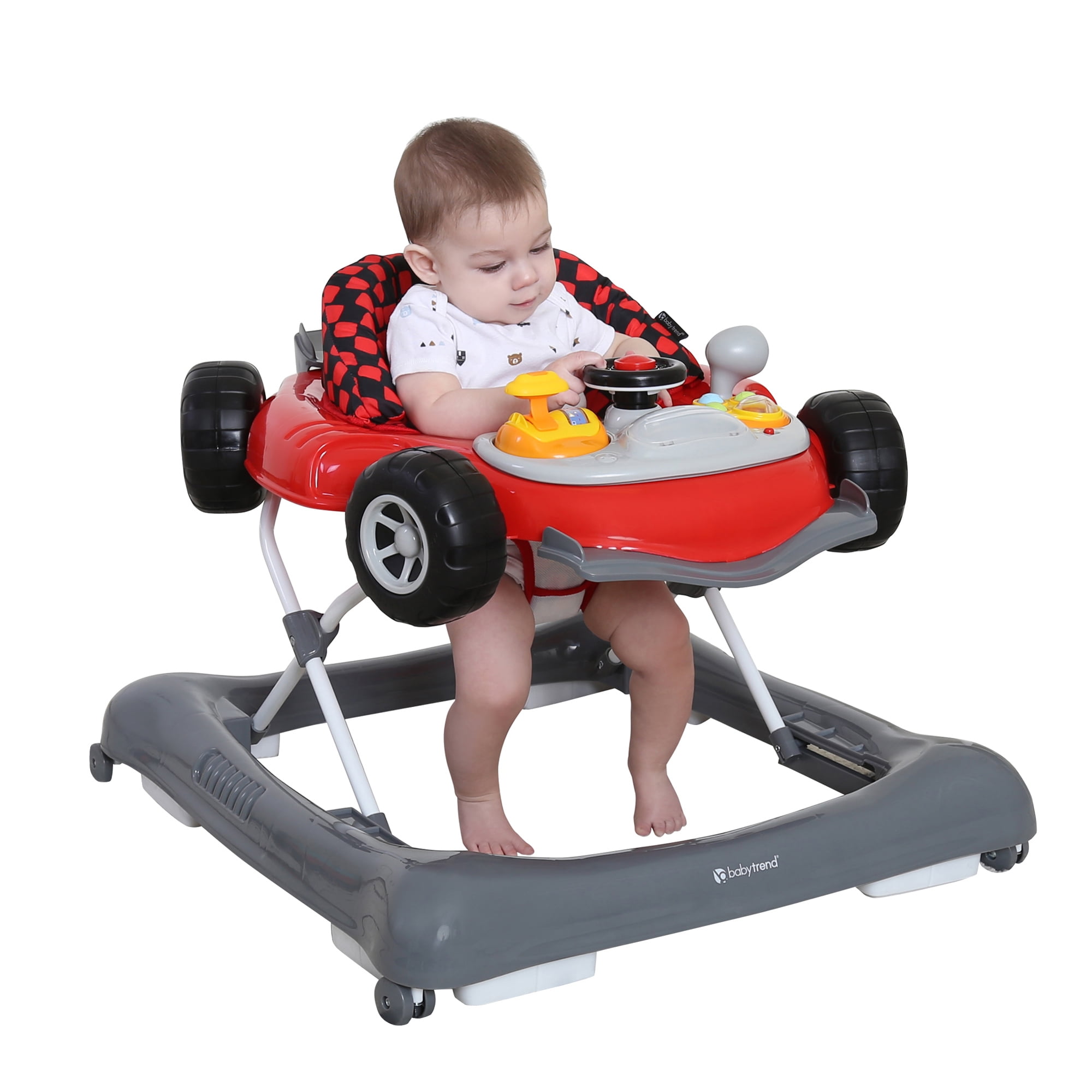 6 melodies, lights and car sound effect Removable toy bar with toys Large tray for food or toys Extra wide base provides superior support and stability High-back padded seat 3-position height adjustable Folds flat for easy transport or storage Fun Baby Trend Speedster Red design