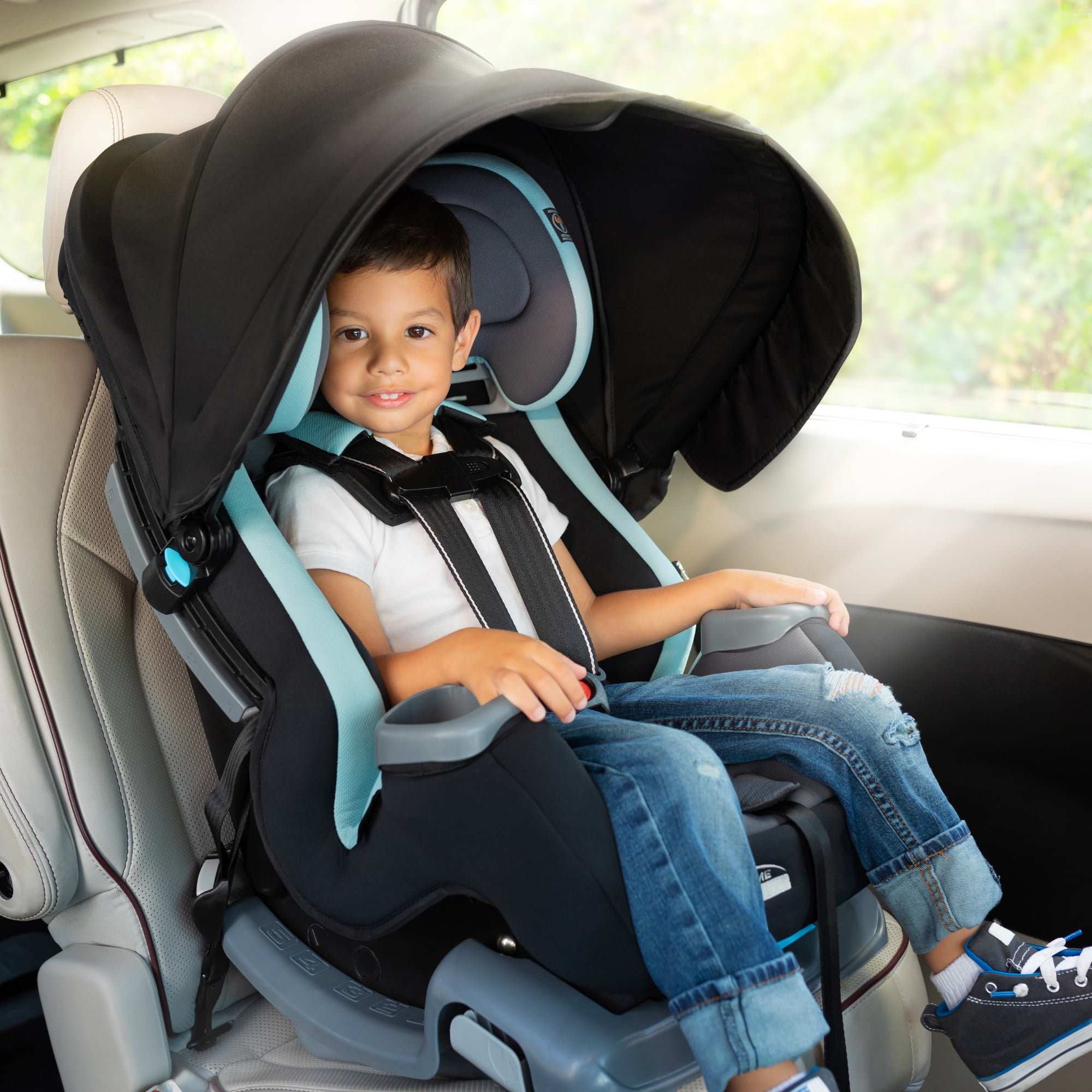 Integrated Adjustable Canopy for UV Protection: Integrated height and angle adjustable canopy for in-car UV protection. Flip-out side visors provide additional shade protection for either side of the car seat. 4-in-1 Seating System: Built for extended use including 1) Rear Facing Infant mode from 4 to 18lbs 2) Rear Facing Toddler mode from 18 to 40lbs 3) Forward Facing with Harness mode from 22 to 65 lbs 4) Belt Positioning Booster mode from 40 to 100lbs Comfort & Convenience for Kiddos: Child can quickly adjust the canopy when car is in motion and sun is coming from multiple directions. The CoverMe’s exclusive Comfort Cabin offers extra padding to keep child comfortable on long rides. Easy To Use, Recline Ready: Includes an integrated headrest with no rethread harness. The base has a zero recline radius that adjusts to three positions and allows front seat passengers to have extra legroom, while an integrated recline flip foot offers dual adjustment and gives the right angle with ease. There are also two front facing recline positions. Fits Three Across in Most Vehicles: At its widest. the Baby Trend CoverMe™ 4-in-1 Convertible Car Seat is 18.25”, which allows it to fit three children across in most vehicles. Side Impact Protection: Super deep side wings for better side impact protection. Quality Exceeds U.S. Safety Requirement: All Baby Trend convertible car seats, infant car seats, strollers and other gear collections are designed and engineered to meet and exceed high quality, ASTM standards.