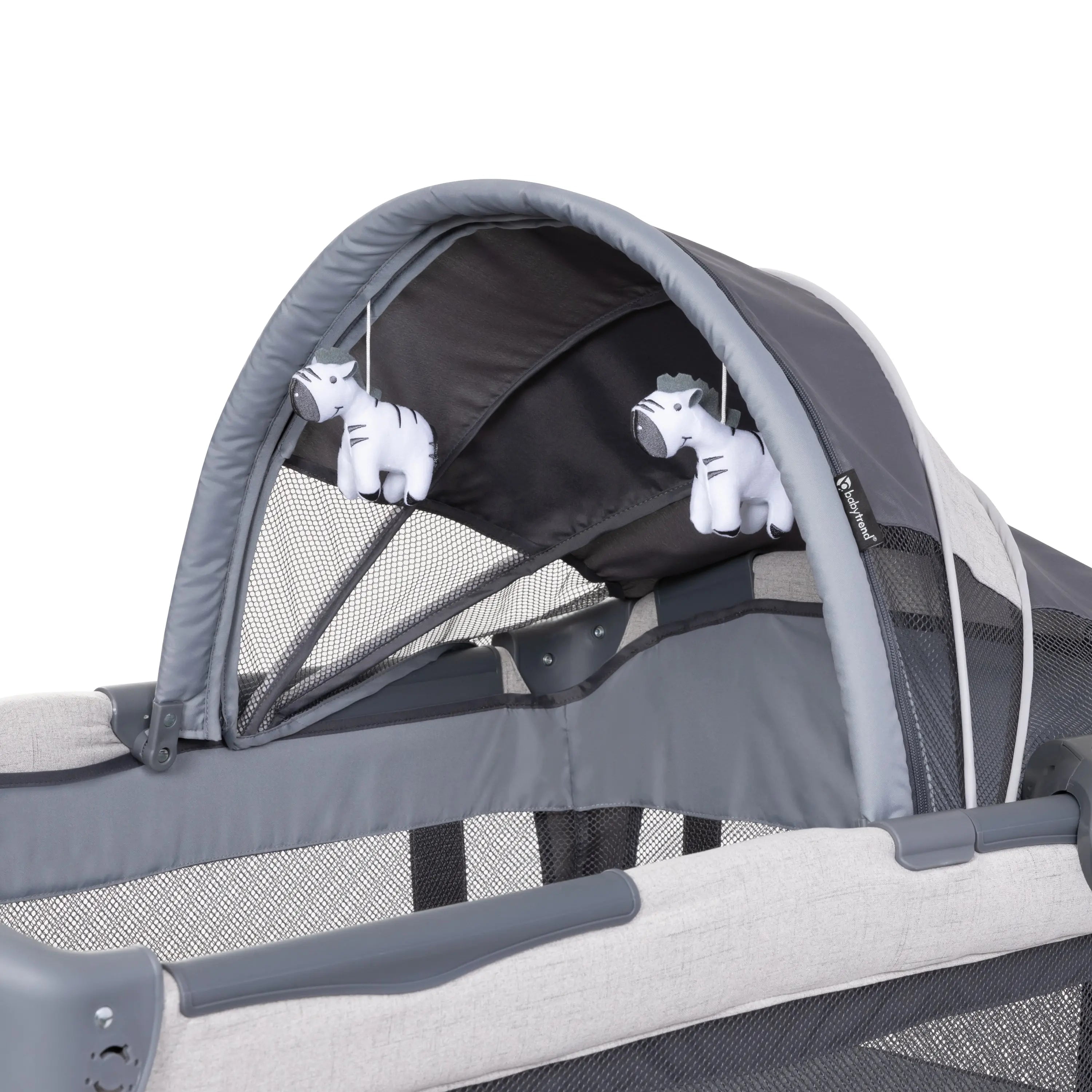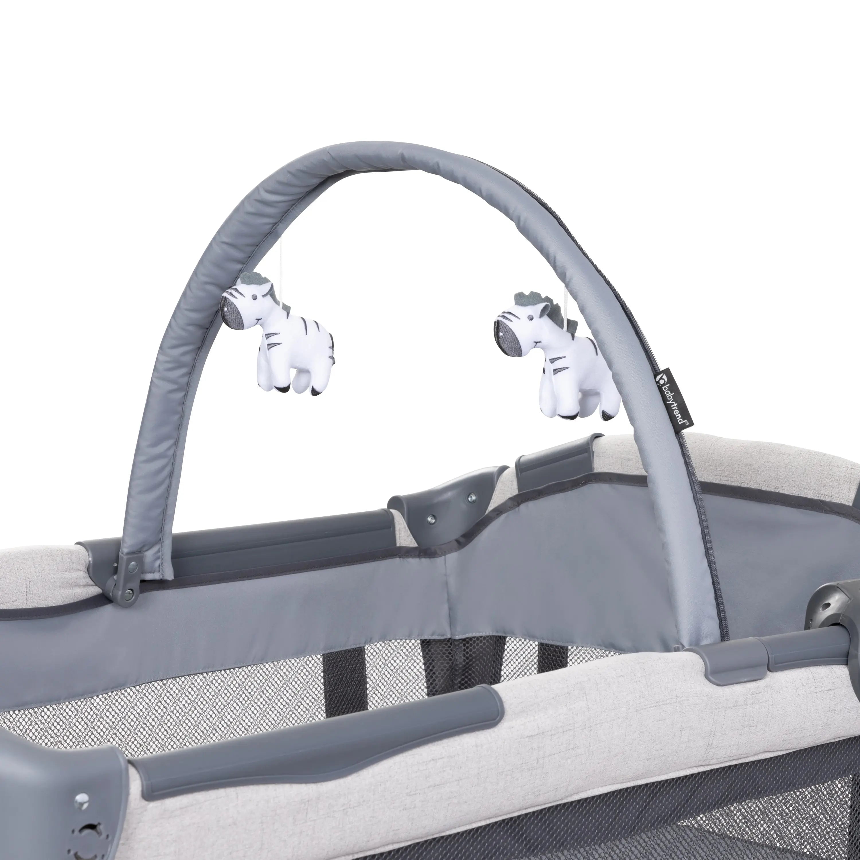 Canopy converts to a toy bar with a simple zip! Deluxe parent organizer with premium side storage Flip away changing table Removable full size bassinet Sleeping surface has zero incline