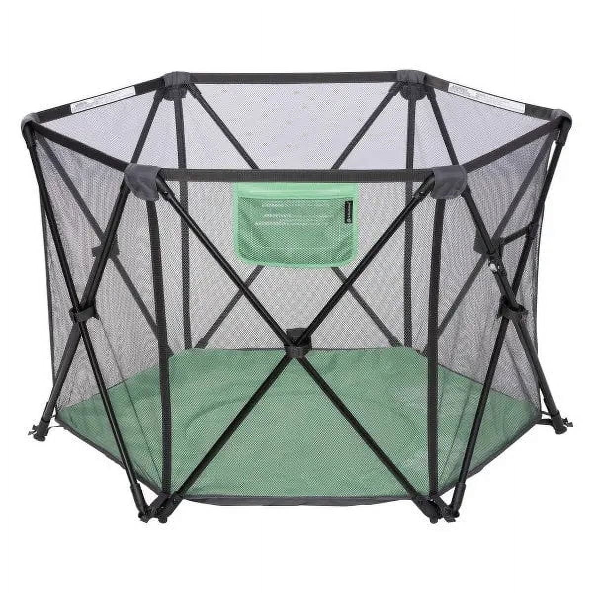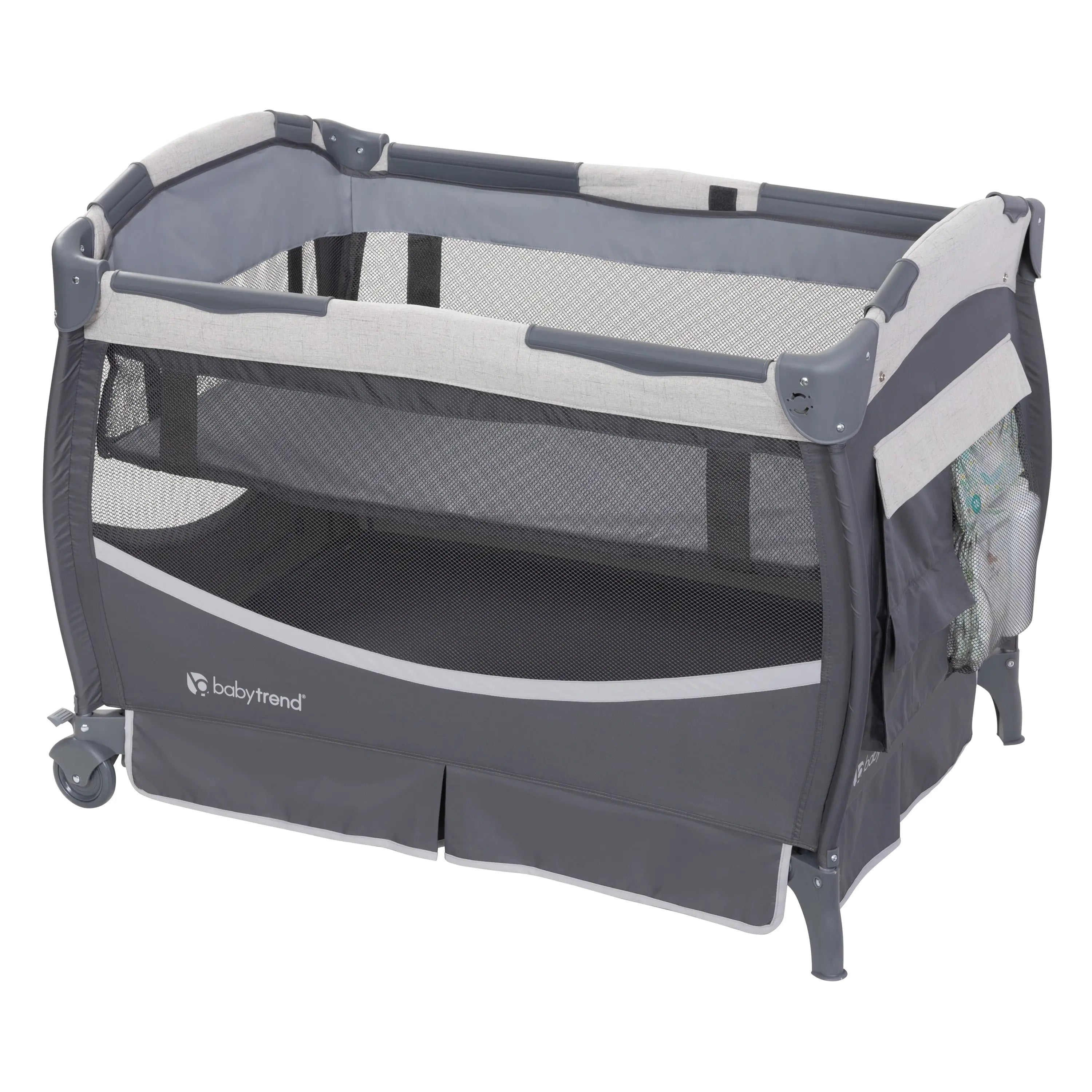 The Baby Trend® Deluxe II Nursery Center is the perfect all-in-one solution for sleeping in a flat position, diaper changing and playtime! Your newborn will nap in a flat position peacefully under the shaded canopy after being soothed to sleep in a flat position by the calming vibrations, night light and peaceful music from the electronic music center. When your little one is awake, simply unzip the canopy to convert it into a toy bar with two plush toys. Diaper changes become a breeze with the changing station, deluxe 3-pocket parent organizer and built-in diaper stacker. The changing table with secure belt conveniently flips over when not in use. As your little one grows, simply remove the bassinet feature and the nursery center is transformed into a safe environment for your child to play. The dual wheels with brakes provide easy mobility and added security. When it’s time to travel, simply fold and store the nursery center in the carry tote.