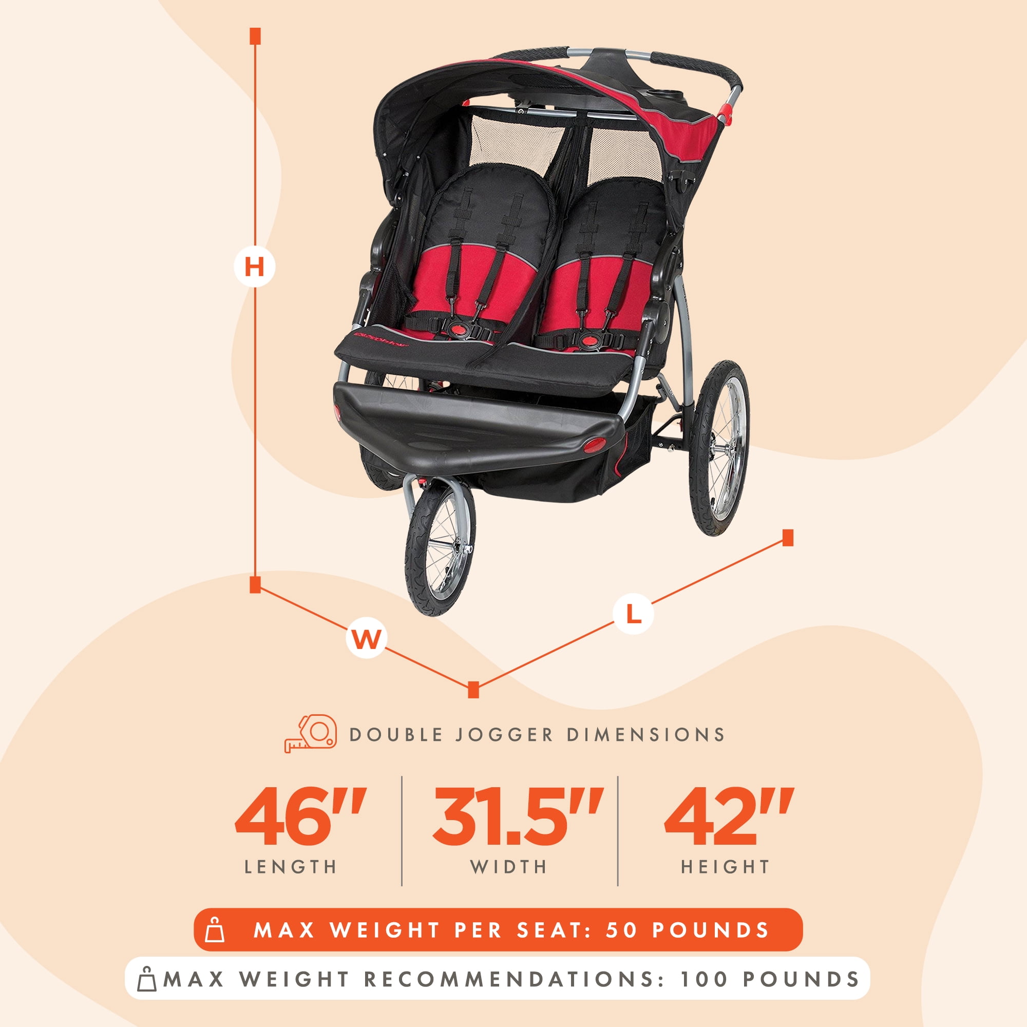 Explore the outdoors together with the Expedition Double Jogger. Made for two children, it features large bicycle tires and a locking front swivel wheel that allows you to keep the front wheel in place while jogging. If you’re out for a leisurely stroll, simply unlock the front wheel for greater maneuverability. For your convenience, the parent tray includes two cup holders and covered compartment storage. For your children’s comfort and safety, the double jogger features a ratcheting shade canopy, multi-position reclining seats and adjustable five-point safty harnesses. Store your children’s necessities in the large storage basket and you’re ready to roll. Know you’re traveling safely in this sturdy, lightweight double jogger that’s certified by the Juvenile Products Manufacturers Association. At the end of your trip, the jogger folds quickly and easily for transport or storage.