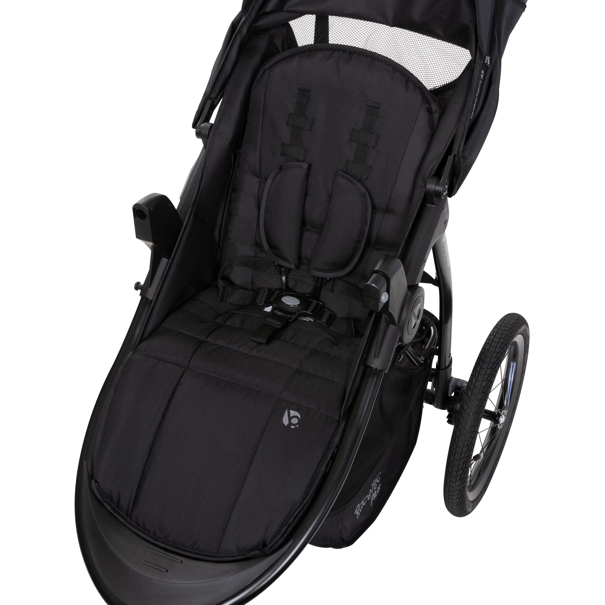 Innovative rotational handle: 4-position rotational angled rubber flex-grip handles combined with height adjustability for personalized premium jogging experiences Tires: All-terrain tires, 12″ front wheel and 16″ rear wheels, 2 year wheel guarantee Comfort Cabin: Plush padded stroller seat with multiple reclining positions for comfortable ride Adjustable 5-point safety harness with padded covers, child’s tray for snacks and drinks Stroller Seat Adjustments: Crotch buckle adjustment, Height adjustable harness, Reclining backrest Includes: Stroller, Stroller 2-panel UV canopy, Parent tray with phone positioner and 2 cup holders, Child’s tray with 2 cup holders, Storage basket Also includes the lightweight EZ Lift 35 Plus Infant Car Seat, with the built-in ergonomic grip for an easy lifting technique recommended by chiropractors