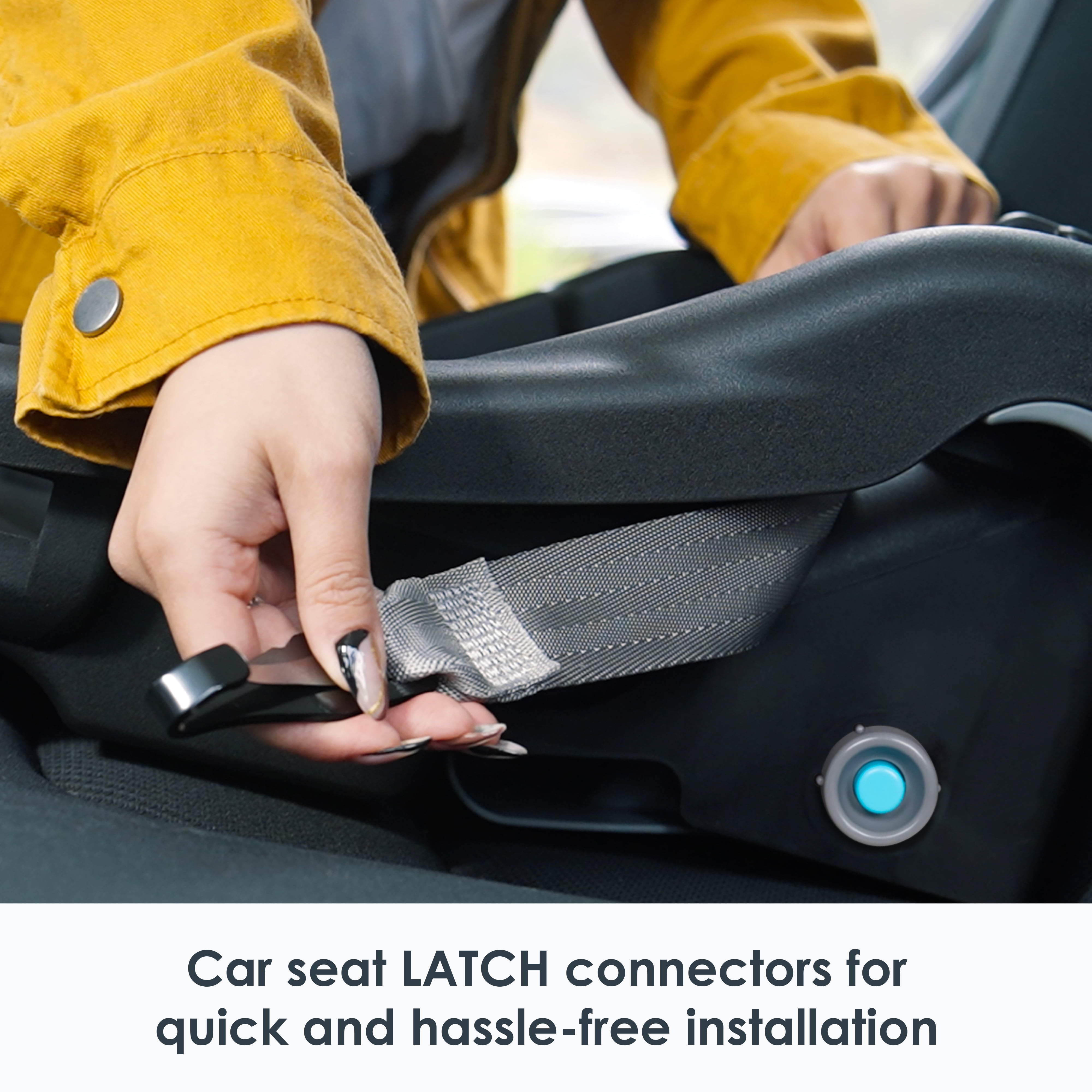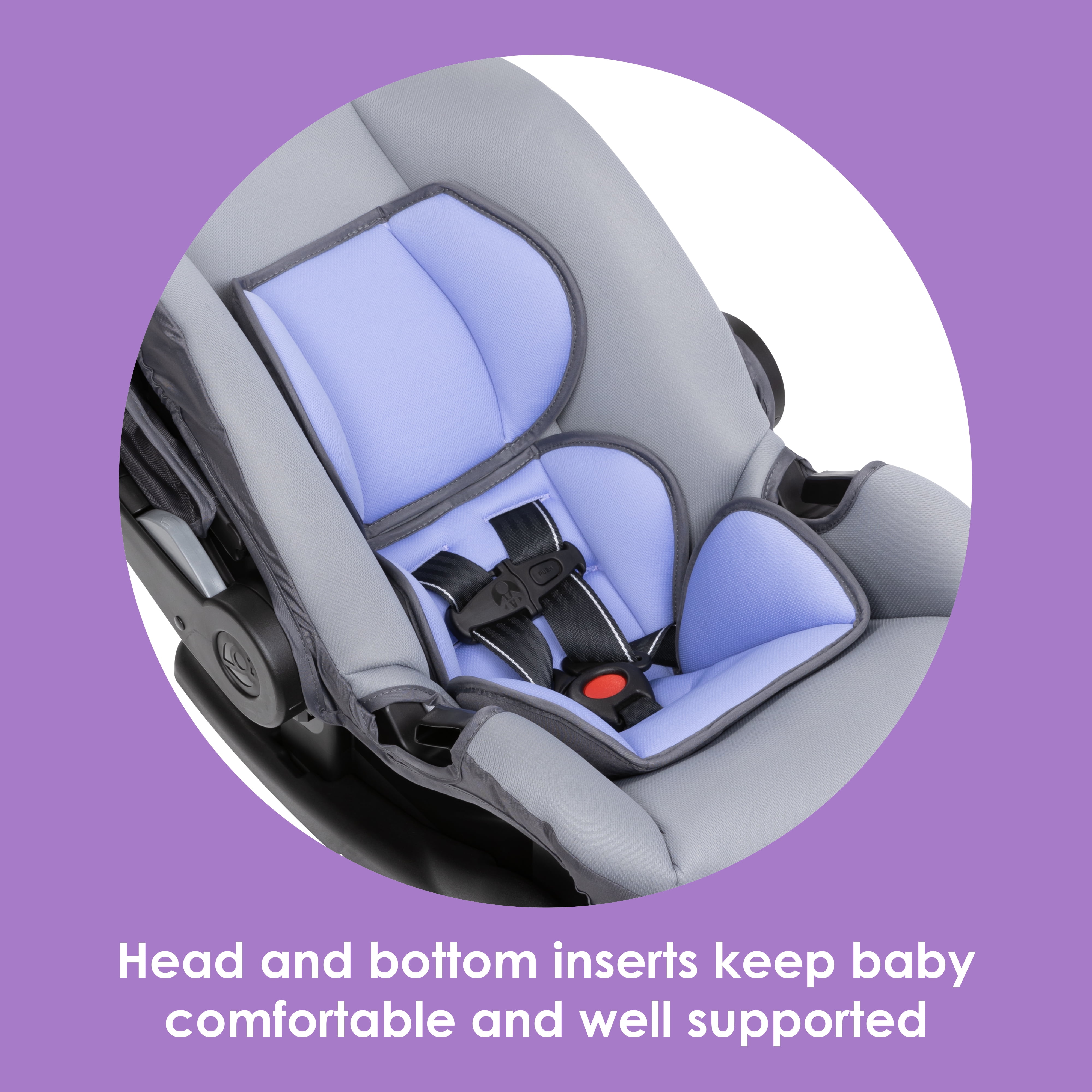 This car seat is lightweight and offers easy mobility The car seat is equipped with deep side wings for advanced protection The no-twist indicators located on the harness adds easy, no fuss safety The head and bottom inserts keep baby comfortable and well supported The adjustable canopy with a visor for sun protection and coverage Certified for aircraft travel to always keep your baby safe and secure! Meets and exceeds all federal safety standards The base includes a flip-foot recline and bubble level indicator for an angle that is just right for your little one