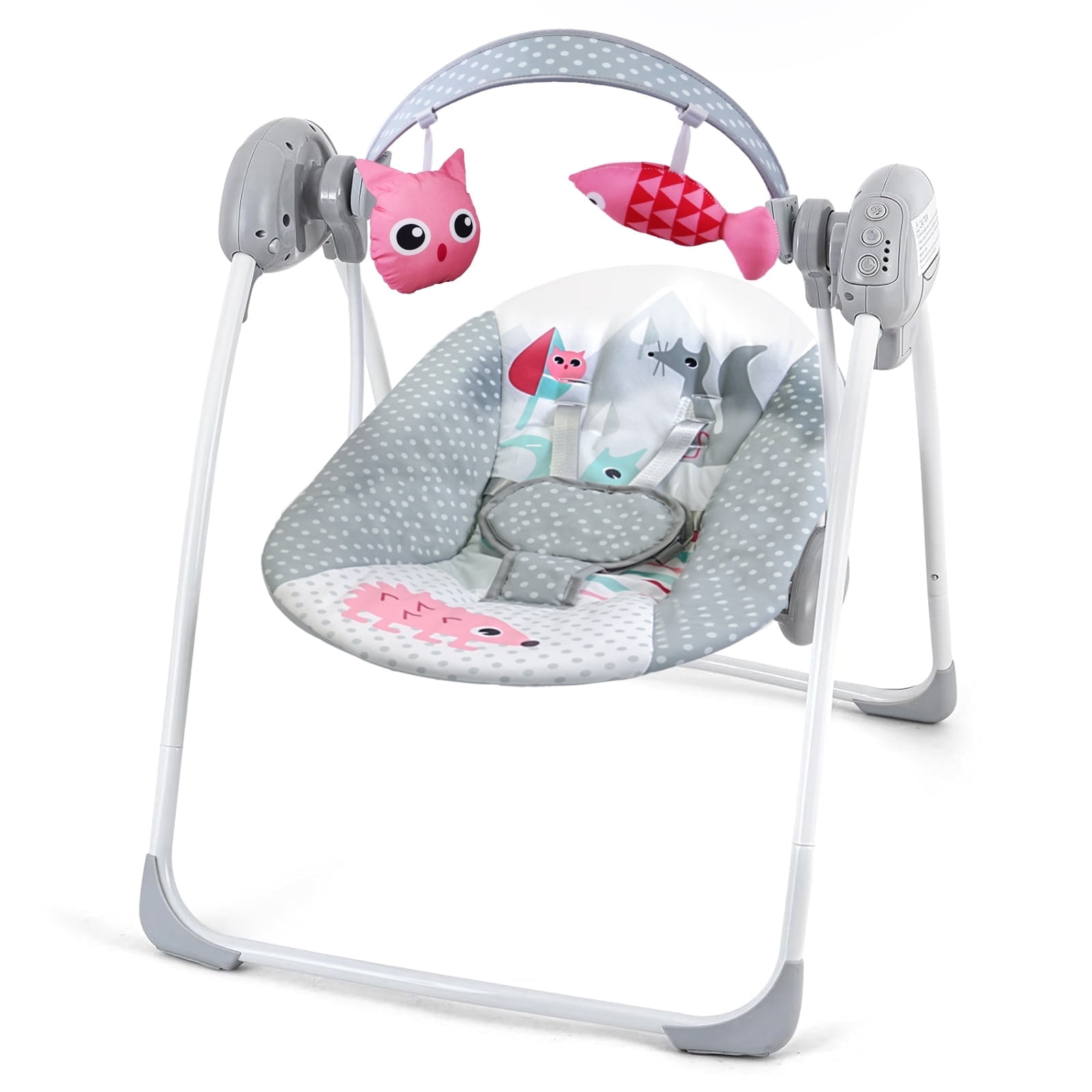 A full-size bassinet with airflow mesh sides provides comfort and breathability for your baby This standalone bassinet allows your baby to easily be with you at all times A removable and washable mattress allows for easy and hassle-free cleaning Thick, steel legs provide sturdiness and stability to ensure there will be no bumps in the night for your little one The narrow frame fits through doorways for easy portability around the house Quick and easy assembly for hassle-free set up whether at home or on the go! The canopy with hanging plush toys will encourage movement from your baby until they are able to fall asleep IC unit offers vibration, a nightlight, and a variety of melodies to gently soothe your baby to sleep Included travel bag makes on the go plans a breeze!