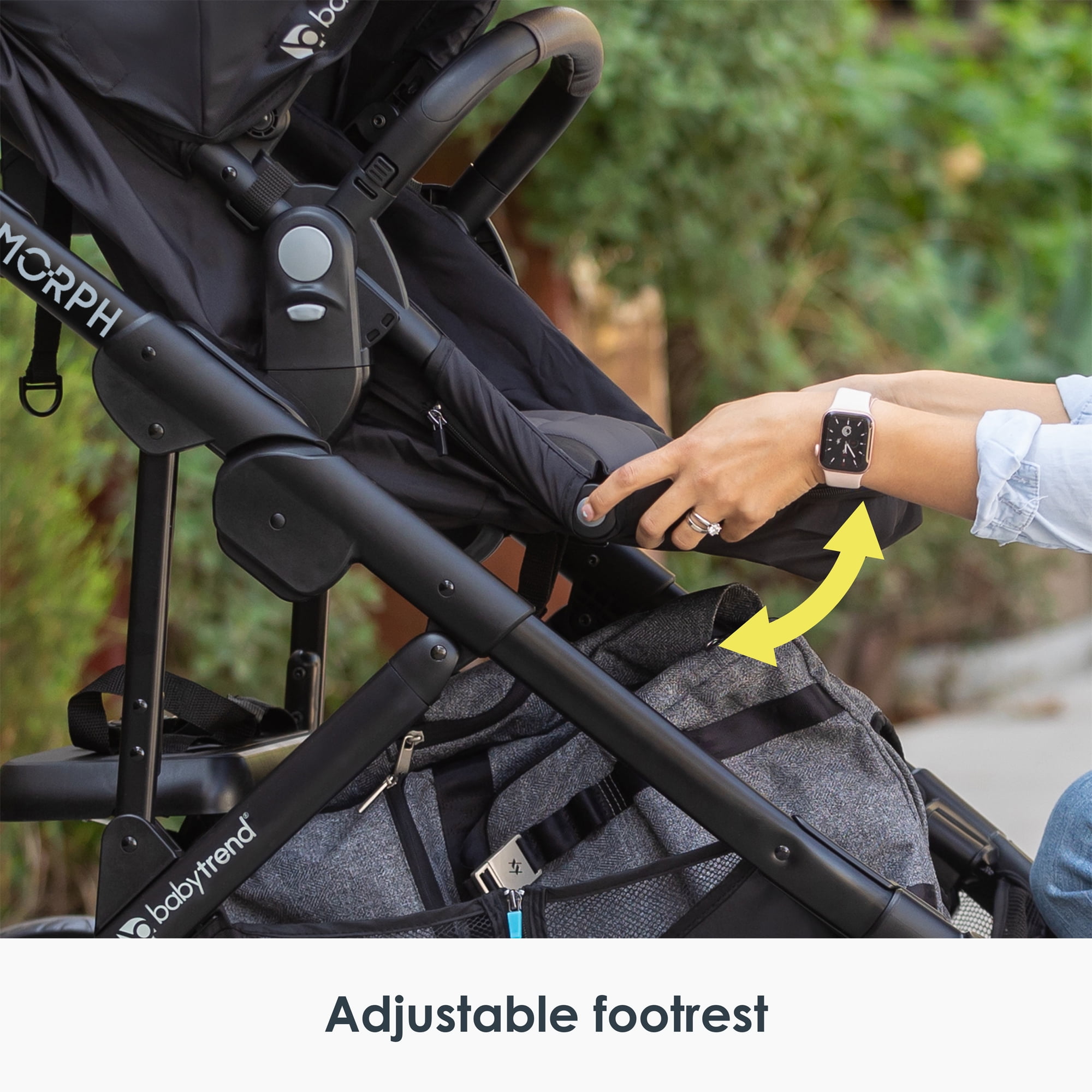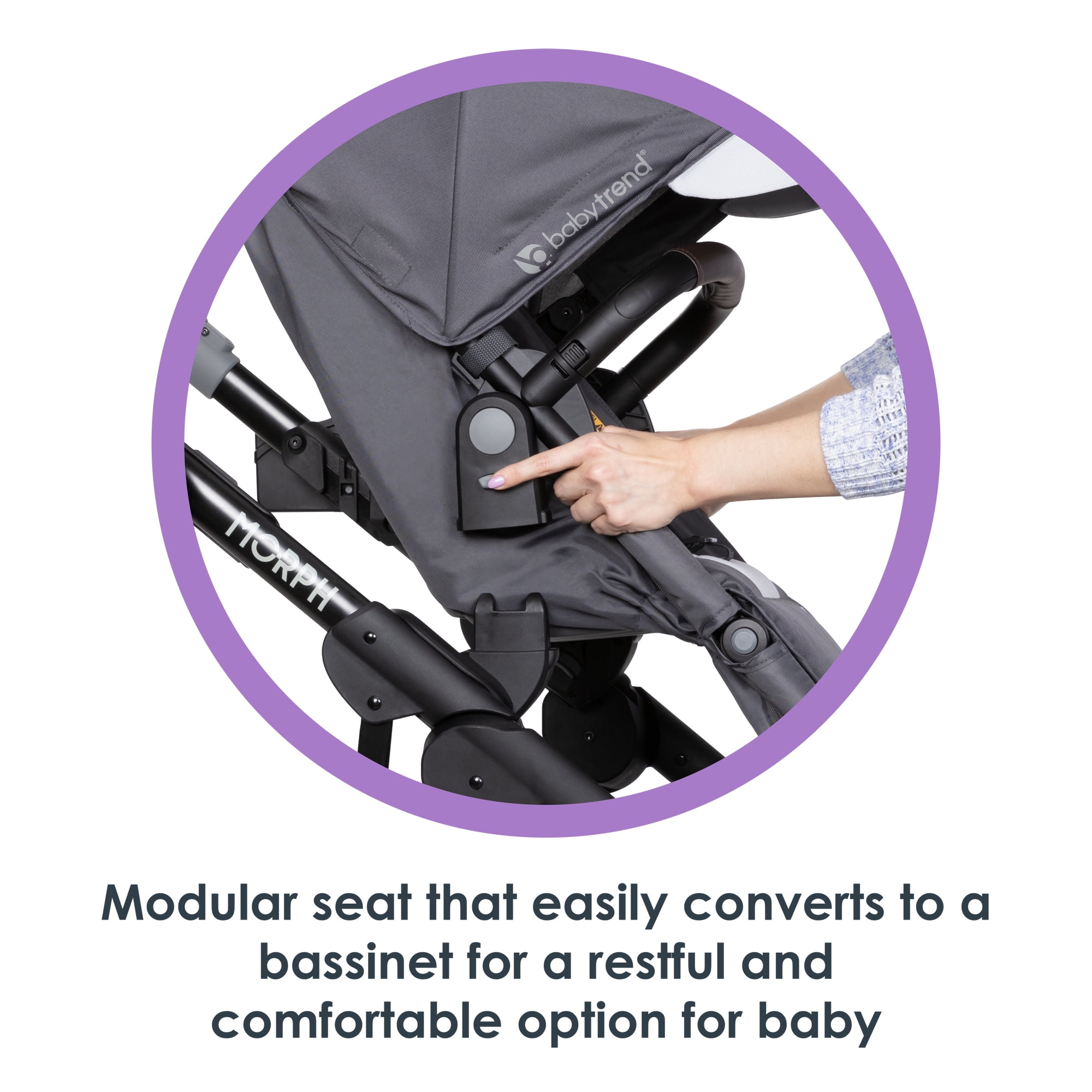 A versatile Single-to-Double Modular Stroller Travel system with multiple Forward and Rear facing configurations for a personalized strolling experience! Over 25 unique riding modes! The stroller frame includes a built-in standing board and seat bench, allowing two children to ride at the same time Includes a modular stroller seat that easily converts to a bassinet for a restful and comfortable option for baby The footrest on the stroller seat adjusts for your growing child to ensure extended use Integrated adapters allow the Morph to easily convert to a double stroller with many riding possibilities for your growing family The handlebar is height adjustable for a comfortable strolling experience The parent tray includes a cup holder and cell phone holder for hands free access to your on-the-go essentials The extra-large storage basket allows for easy accessibility to your strolling necessities This travel system includes the lightweight EZ-Lift PLUS Infant Car Seat that weighs 7.5lbs The car seat includes an innovative Side Grip carry handle for ergonomic lifting and carrying The handle bar of the EZ-Lift can be used as an anti-rebound bar in forward position, which helps prevent rotation in the event of a rear collision for added safety and stability The car seat includes a base with recline flip foot and a bubble level indicator for the perfect angle The car seat is certified for air travel and meets and exceeds federal safety standards Second Stroller Seat and Modular Storage Basket available as accessories Winner of The National Parenting Center’s Fall 2023 Seal of Approval award!