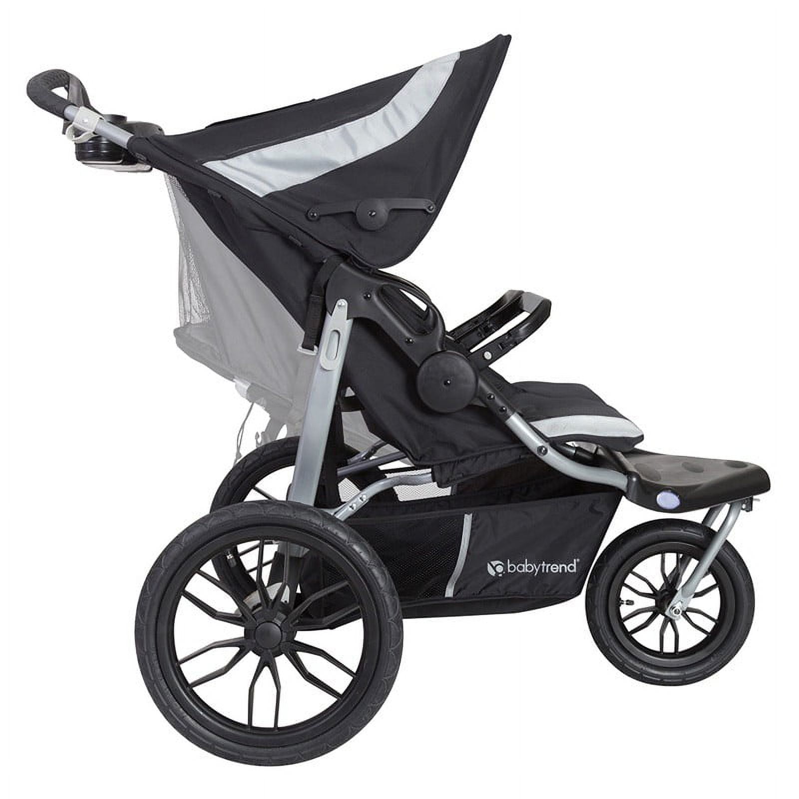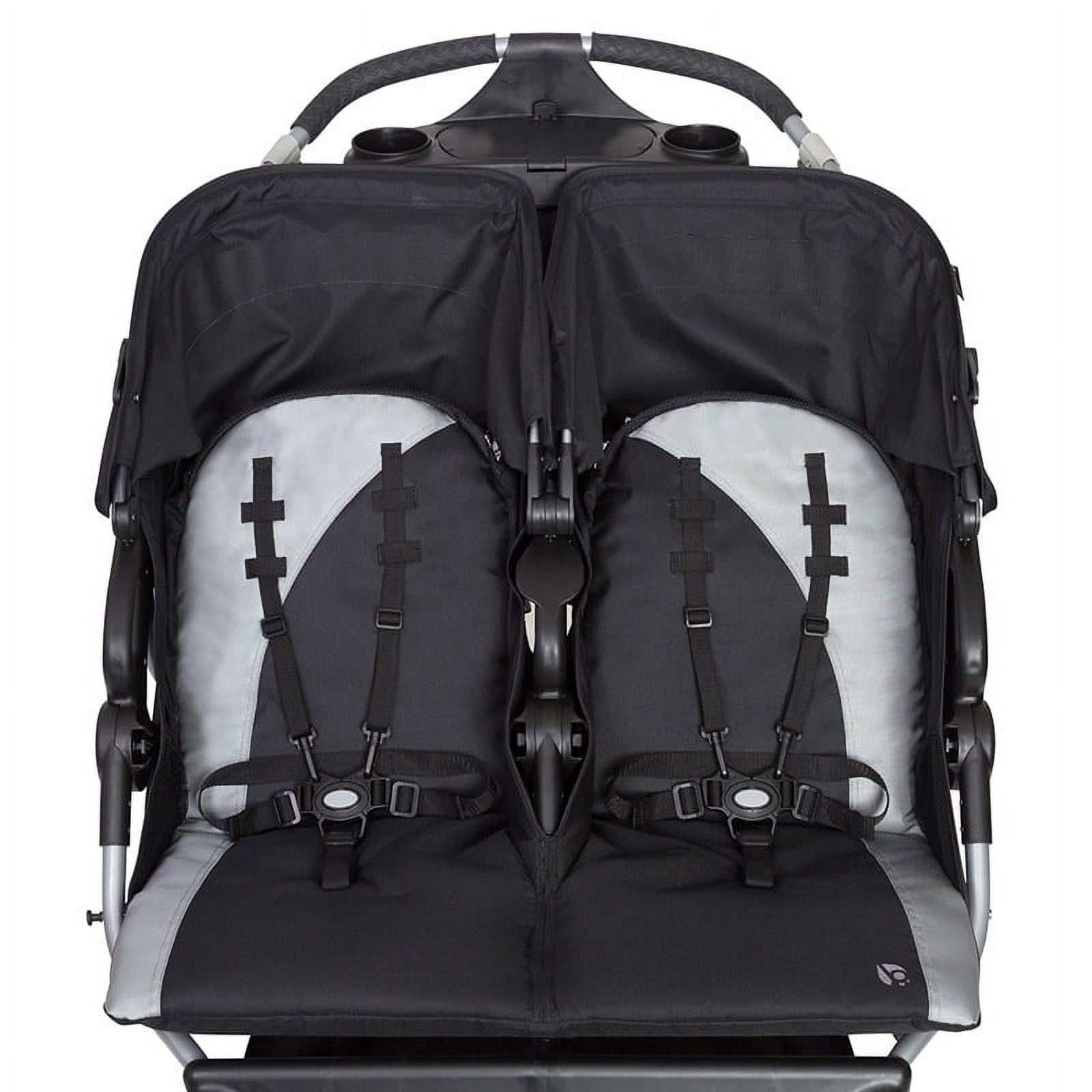Take your little ones jogging with the Baby Trend® Navigator® Lite Double Jogger. Made for two children and can accept two Baby Trend® Infant Car Seats (sold separately), this jogger features composite tires and a locking front swivel wheel that allows you to keep the front wheel in place while you’re out for a run. For leisurely strolls, simply unlock the front wheel for greater maneuverability. For your convenience, the parent tray includes two cup holders and covered compartment storage. For your children’s comfort and safety, the double jogger features individual ratcheting shade canopies, multi-position reclining seats and two adjustable 5-point safety harnesses. Store your children’s necessities in the large storage basket, and you’re ready to roll. Know you’re traveling safely in this sturdy, lightweight double jogger that’s certified by the Juvenile Products Manufacturers Association. At the end of your trip, quickly and easily fold the stroller into a compact unit.