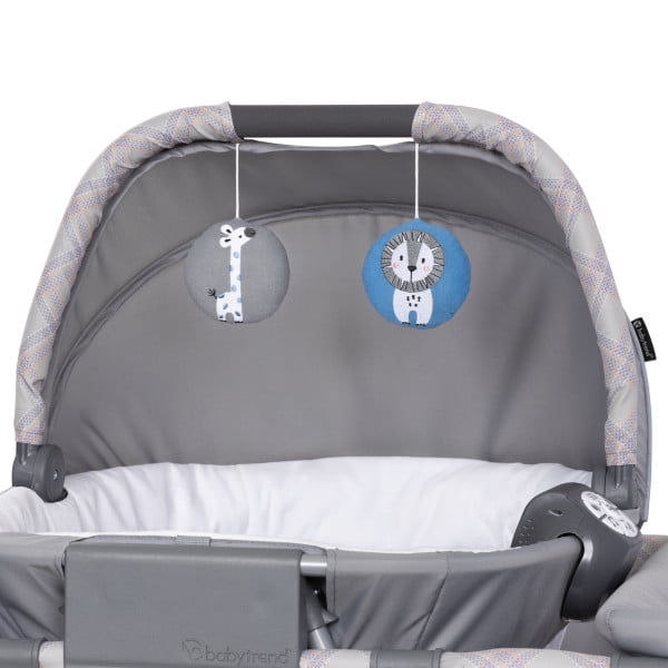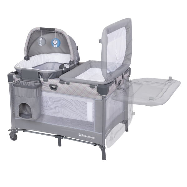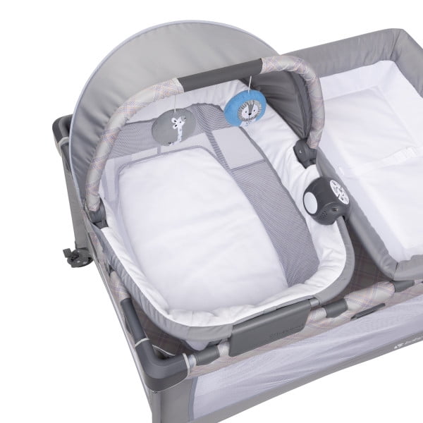 Includes removable and spacious portable cradle with rocking and stationary modes Portable rocking cradle comes with canopy and carry handle, plush fabric and mesh sides for proper ventilation, and two plush hanging toys to encourage grasping and reaching Full size bassinet can be removed to convert to playard mode Convenient, flip over changing table and diaper stacker organizer for quick and easy changing