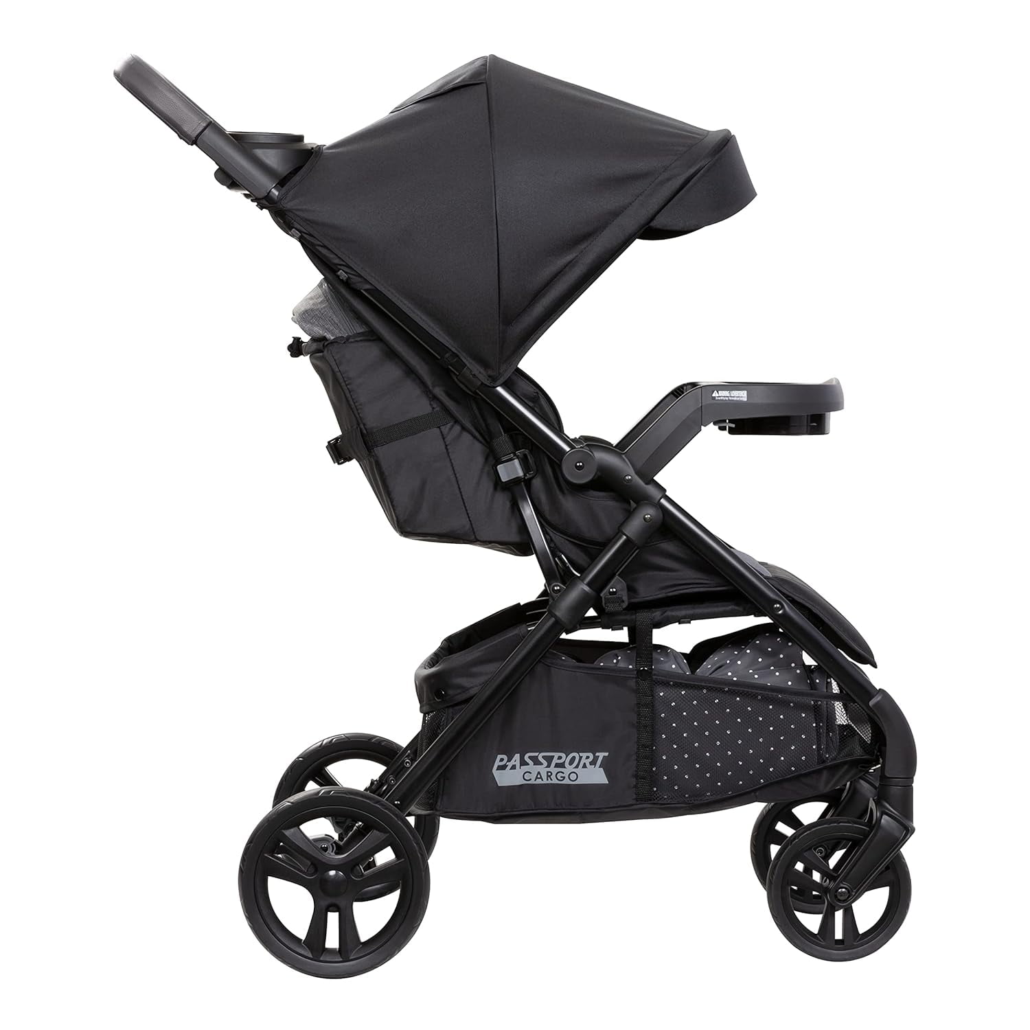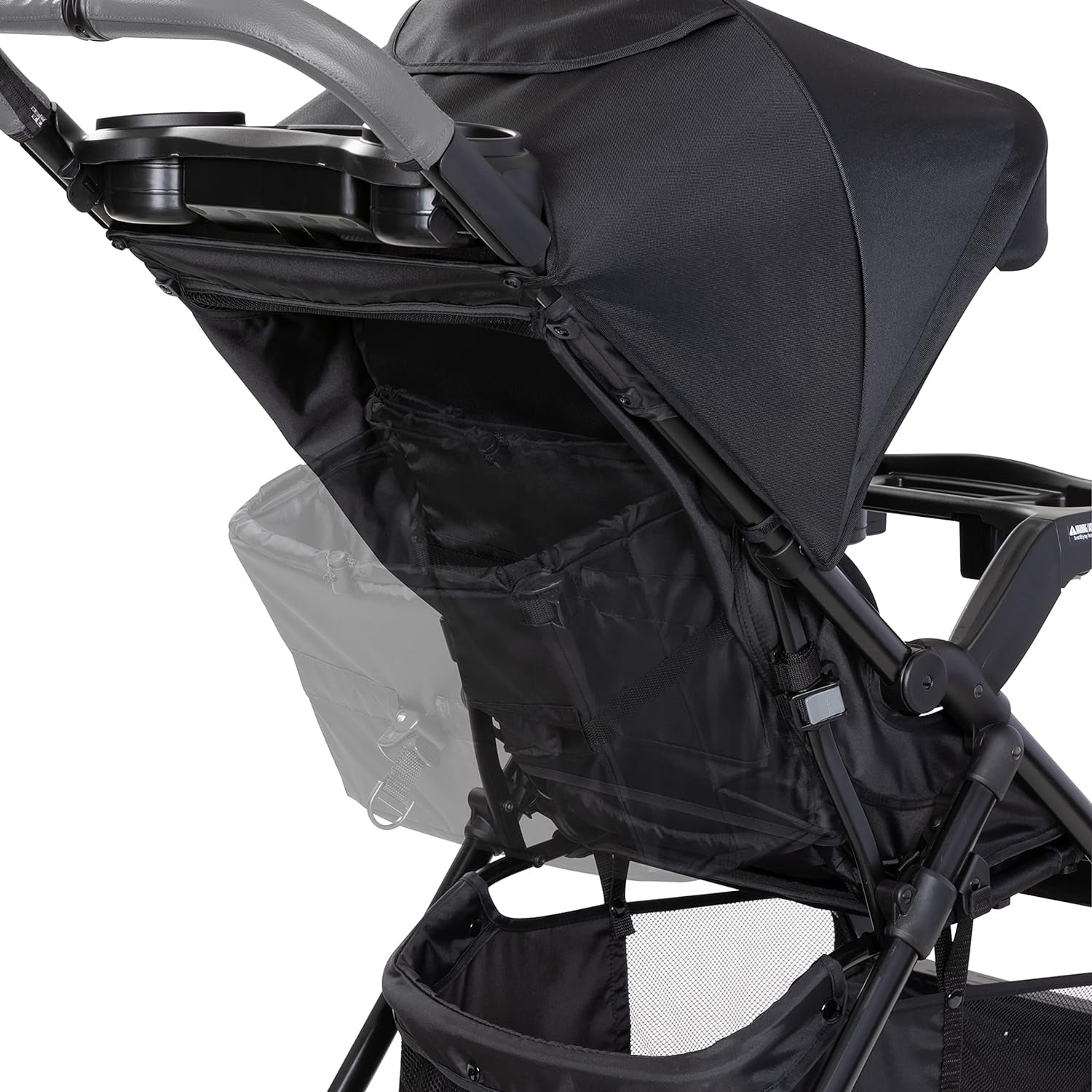 Optimal storage solutions with a large storage pouch integrated on the back of seat Comfort Cabin with UPF 50+ sun protection canopy, plush fabrics and padding Handle with removable leatherette cover for comfort and differing grip options Parent’s tray equipped with two cupholders and center compartment Spacious basket with rear and front access Quick, easy and compact one-hand center fold