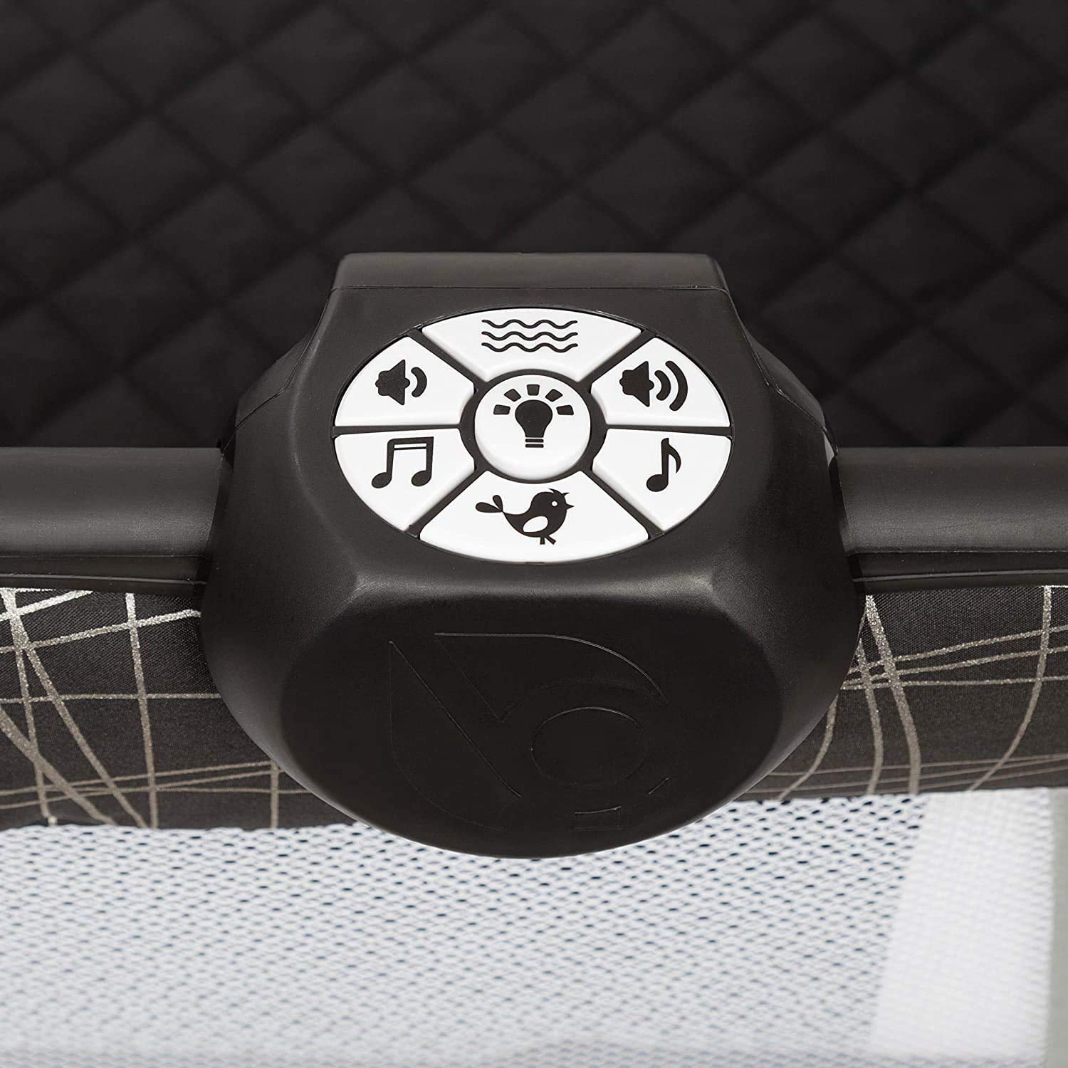 Removable full bassinet with zero incline for easy portability around the house Roomy and spacious, perfect for a sleepy baby or toddler Easy and compact fold with carrying bag for on-the-go use Wheels with breaks allow playard to move from room to room with ease A gray fashion that is gender neutral and will compliment any room One-hand twist locking mechanism for a secure open and close Included travel bag allows for easy travel and storage Gender neutral fashion is soft and will compliment any room Removable padded floorboard Removable changing table and diaper organizer for quick and easy changing Electronic units is equipped with music, sounds, and vibration to soothe your little one Blue fashion is gender neutral and will brighten up any room Recommended usage is from birth to 30lbs or 35″