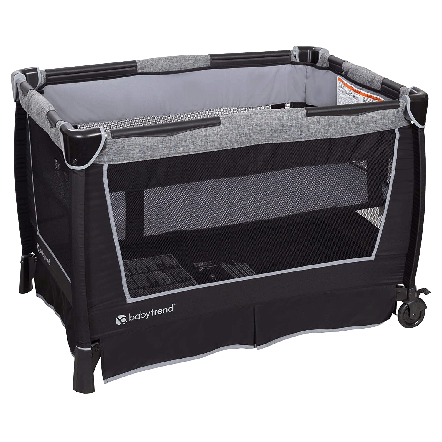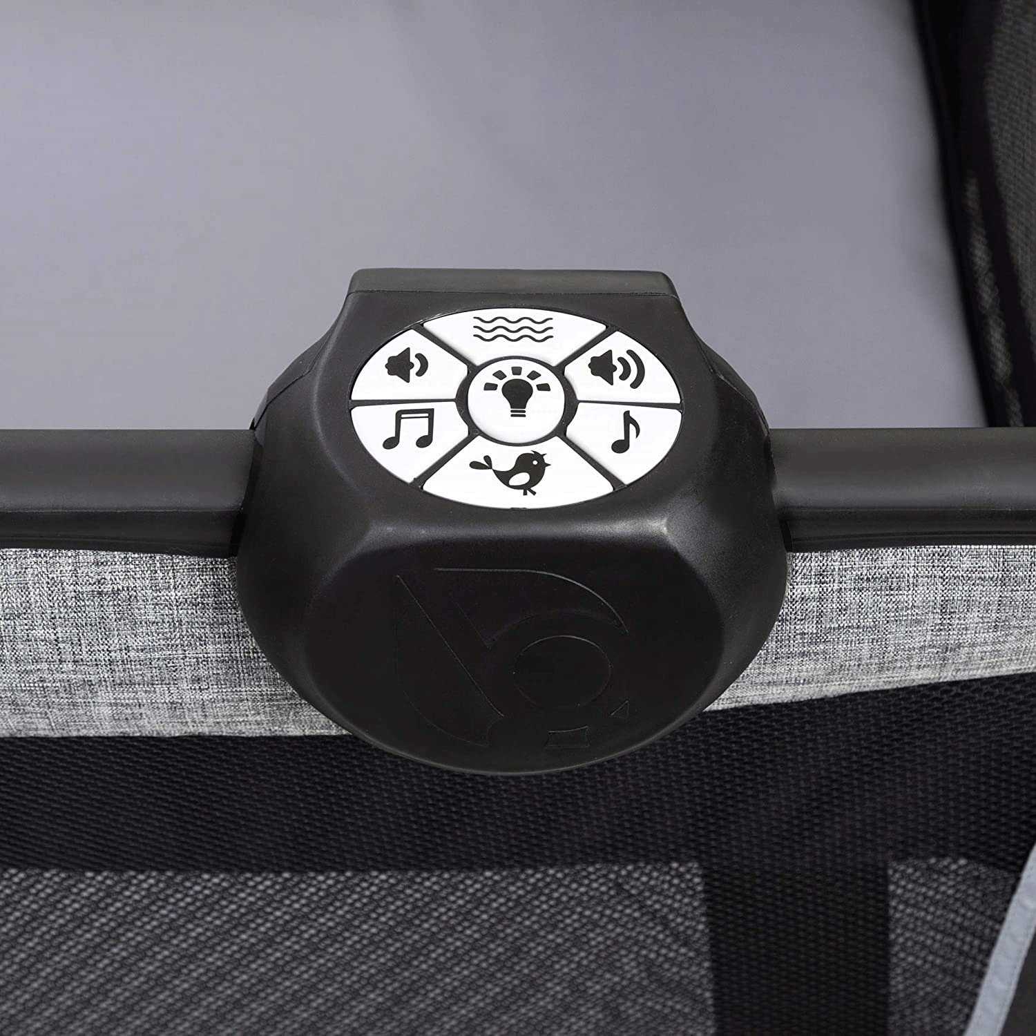 Complete nursery center includes 2 removable Rock-A-Bye Lay Flat Bassinets with canopy and carry handle Playard with removable changing table and parent organizer to store diapers, wipes, and more One-hand locking mechanism enhances stability; Large wheels with secure brakes improve portability Nursery center with plush fabric lining includes electronic music center with volume control, a nightlight, and vibration with 2 styles of music and nature sounds 2 toys included keeping baby entertained while in lay flat bassinet or play area Includes convenient tote bag for travel and storage Recommended age range: 0 to 24 months Maximum weight and height: 30 pounds, 35 inches Color: Quarry