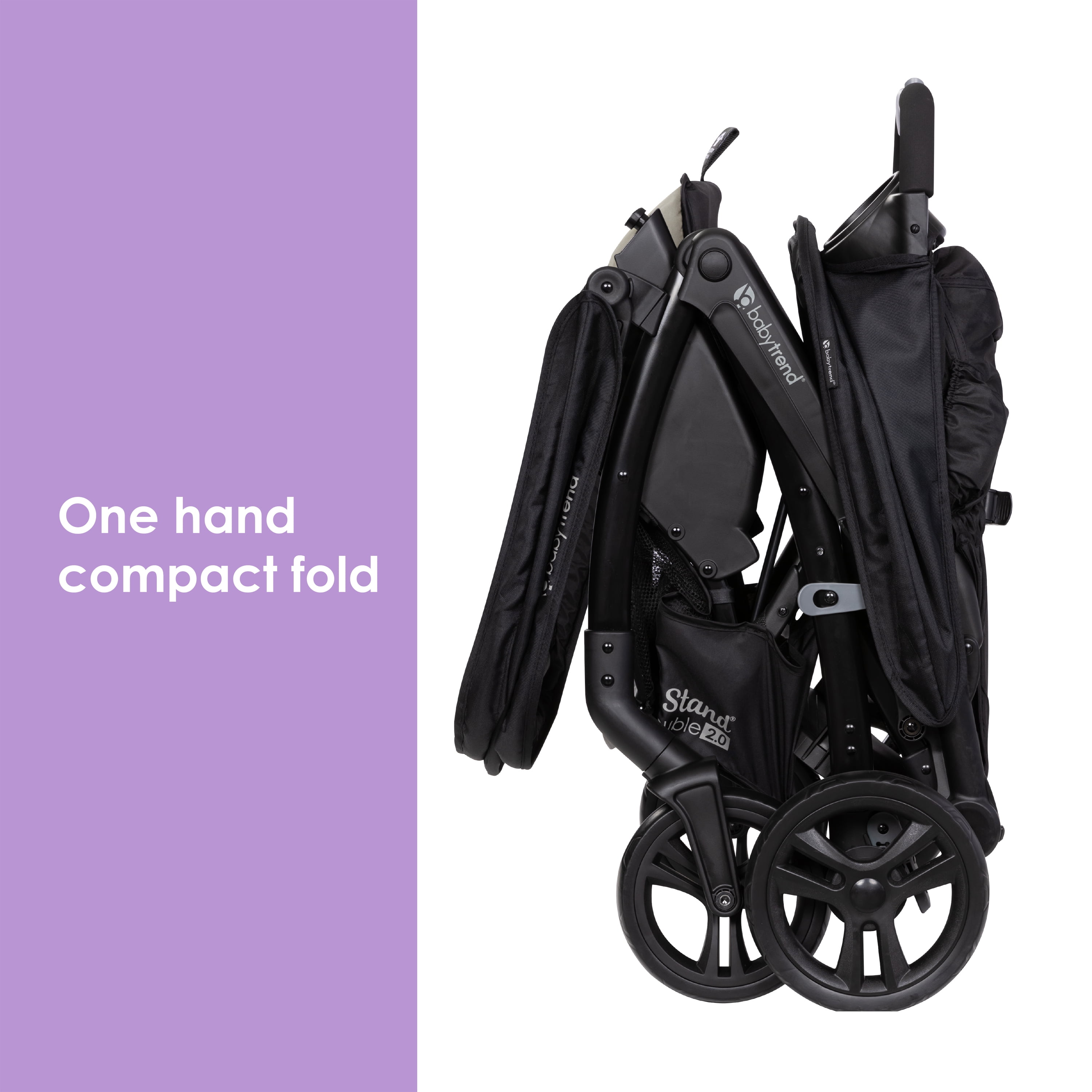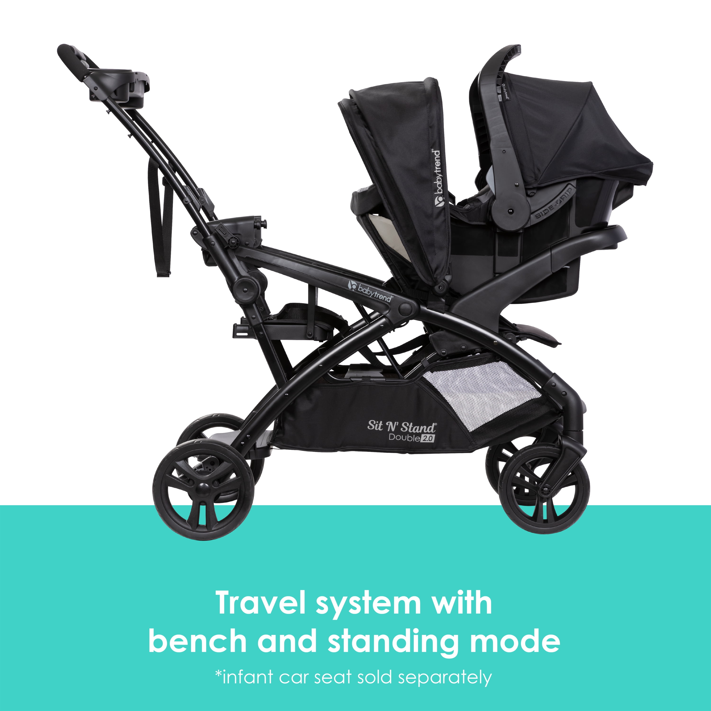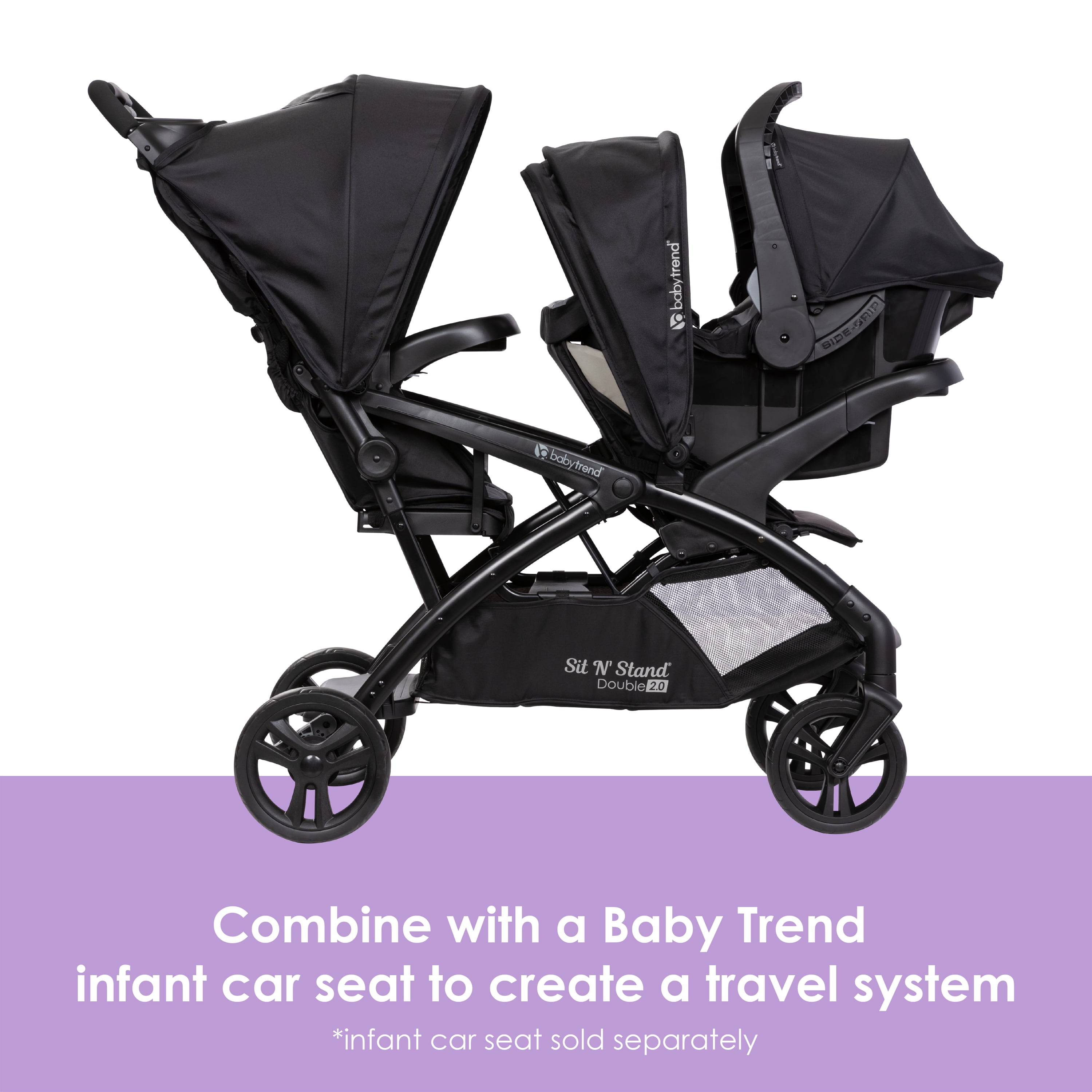 Children can sit in the front and rear seats of this stroller or stand on the rear platform Compatible with All Baby Trend EZ-Lift and Secure Lift Infant Car Seats Can hold two infant car seats at once – perfect for twins One hand compact fold