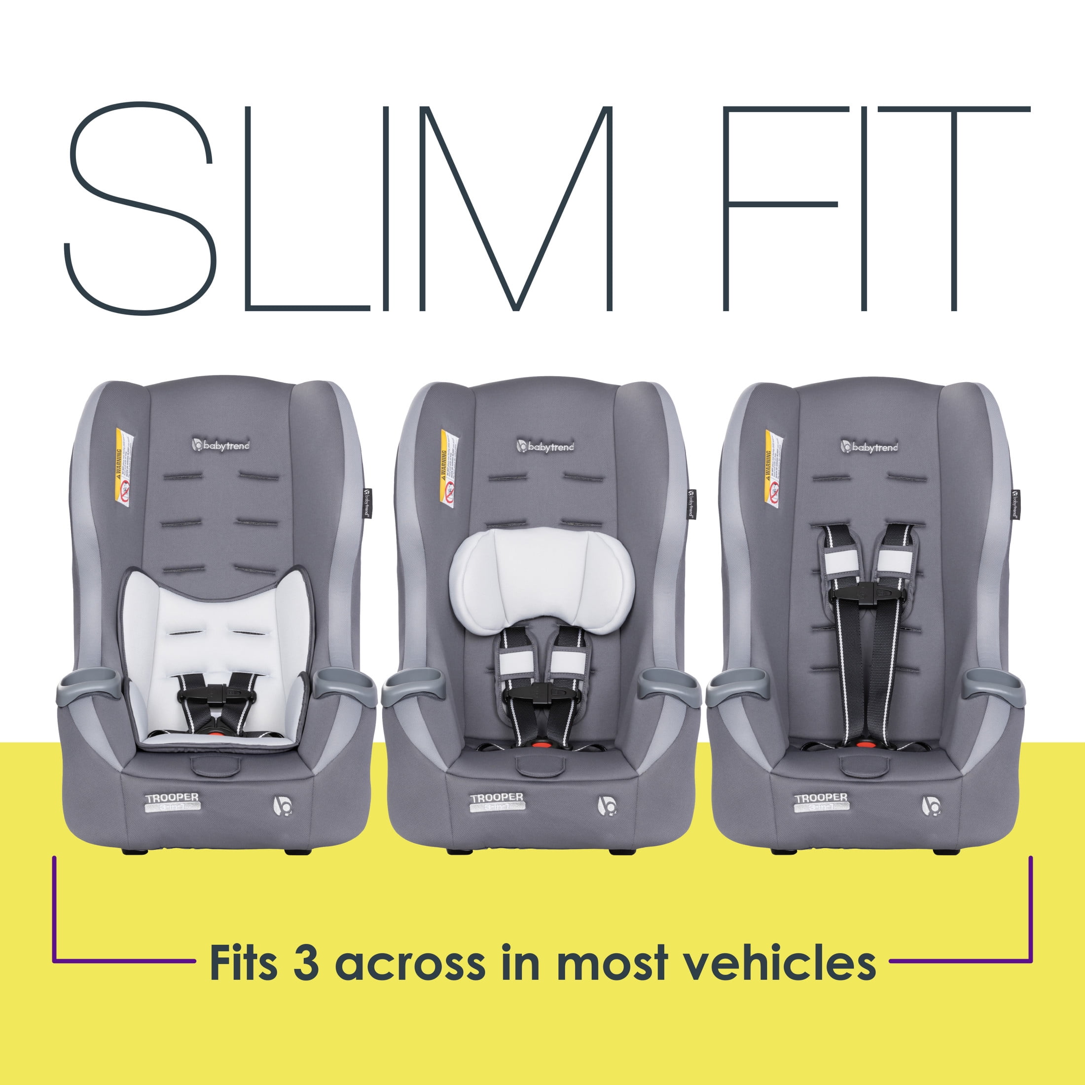 The Baby Trend Trooper 3-in-1 Convertible Car Seat converts from rear facing infant seat (4-18lbs) and rear facing toddler seat(18-40lbs), to forward facing toddler seat (22-65lbs) as your child grows. With 5-position shoulder height adjustment and 2- position crotch buckle for seat adjustment, the Trooper convertible gives parents the ultra convenience for installation and adjustment. The rear-facing recline flip foot also allows the Trooper to get great installation angles with ease. Trooper’s nimble frame can fit three across in most vehicles which is great for families that have more than one kiddo. The lightweight shell also allows for use of LATCH installation up to 55 lbs. The super deep side wings has premium cushion. With premium fabric and two convenient integrated cup holders, our Baby Trend Trooper 3-in-1 Convertible Car Seat truly gives your children the most comfortable and convenient commute/travel experience.