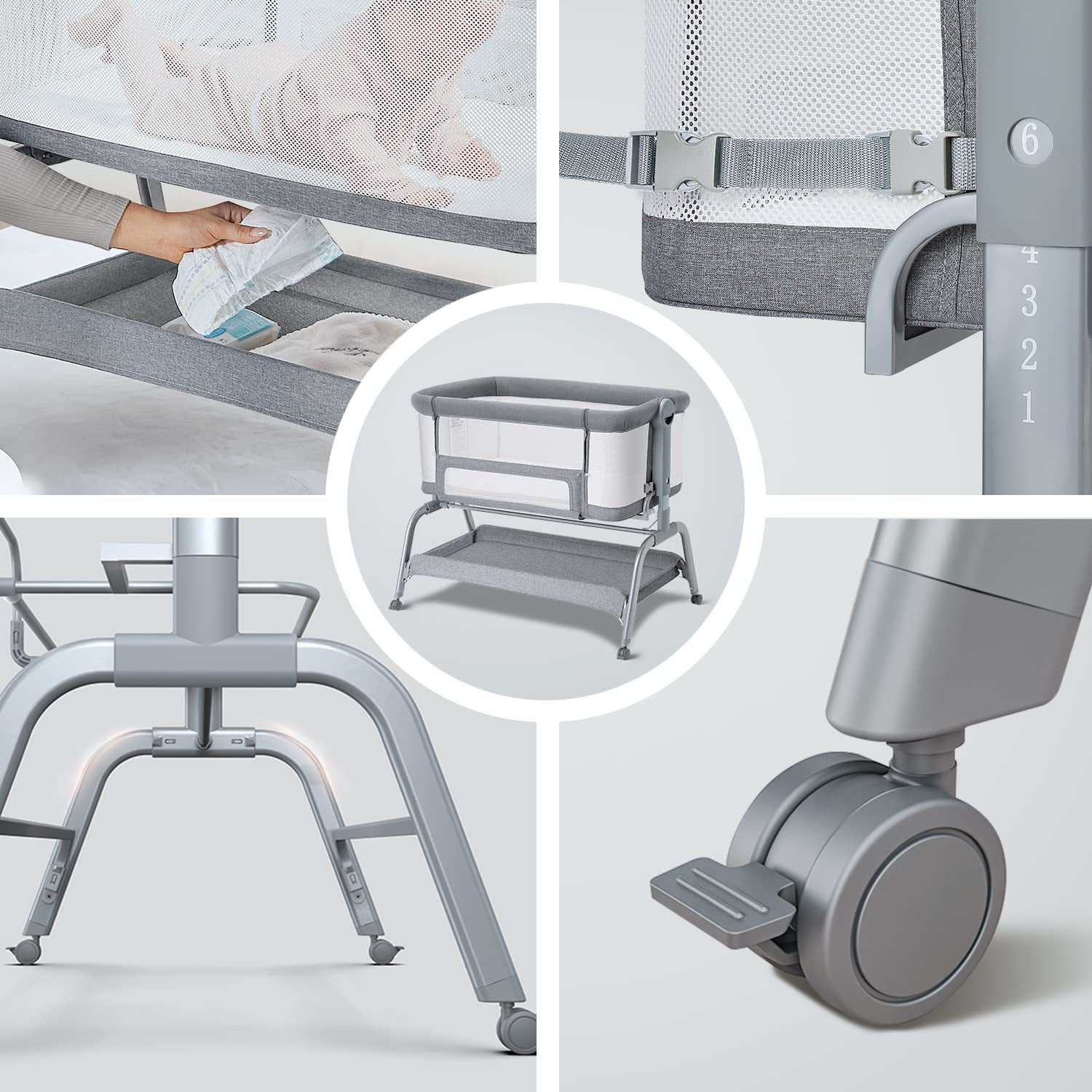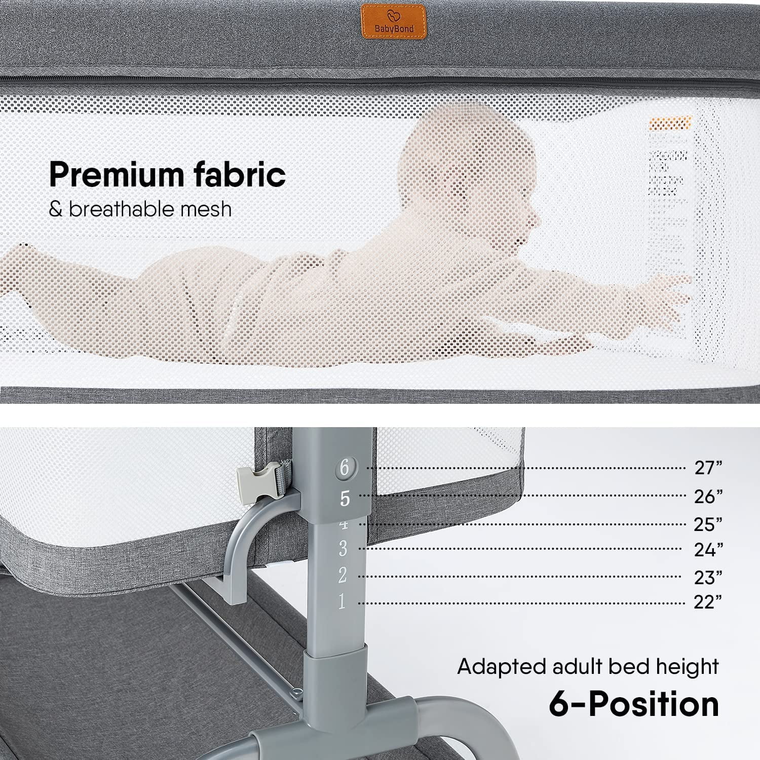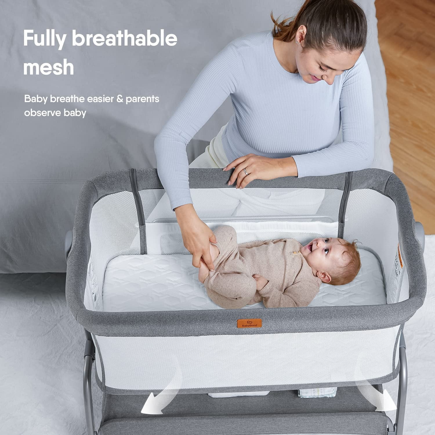 BabyBond Baby Bassinet, 3 in 1 Bassinet Bedside Sleeper with Washable Soft Mattress and Sheet, 6 Height Adjustable Easy Folding Bedside Crib, 4-Sided Mesh Bedside Bassinet for Baby,Gray