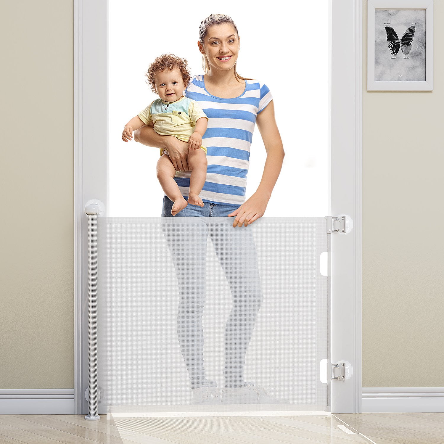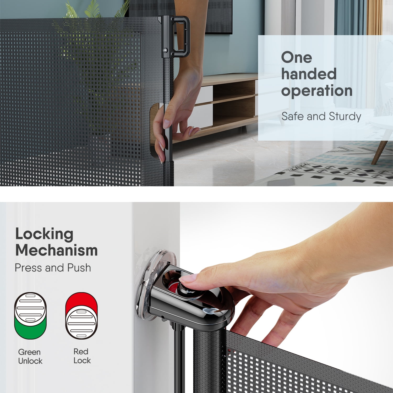 Punch-Free Installation: BabyBond retractable baby gates come with all of the hardware necessary for installation including a punch-free kit or drilling kit. It is worth noting that an excellent advantage compared to others is that BabyBond retractable baby gate could be fast installed in 3 minutes without any tools and drilling to protect your wall. Retractable Design: BabyBond retractable baby gates are designed to adjust to a width of up to 71 inches (33 inches tall). It could be completely retracted away when not in use, saving your space so that it could be used for indoor or outdoor areas like a doorway, stairs hallway, and so on. One-handed operation: The retractable baby gates with doors are easy for you to operate one-handed, in the real talk you’ll probably be holding a baby in your other hand. For more convenience, the locking mechanism for safety is also easy to do with one hand you just need to press and push to lock or unlock, but your kid can’t do anything with it. ASTM Certified: The retractable baby gates are made of durable mesh and a reinforced bearing shaft, the hooks are also improved for more sturdy. All gate lines are tested to the safety standards, both JPMA and ASTM standards.