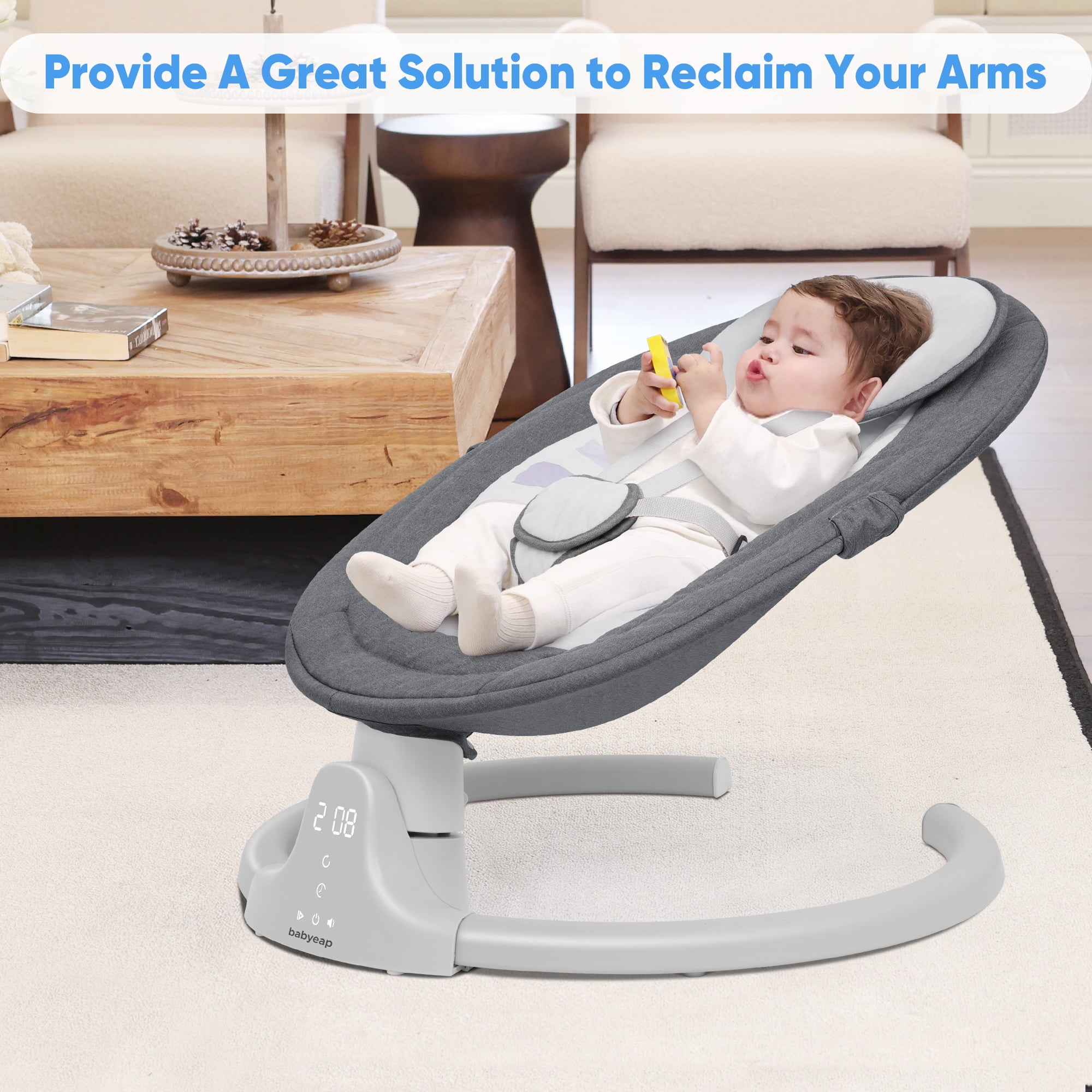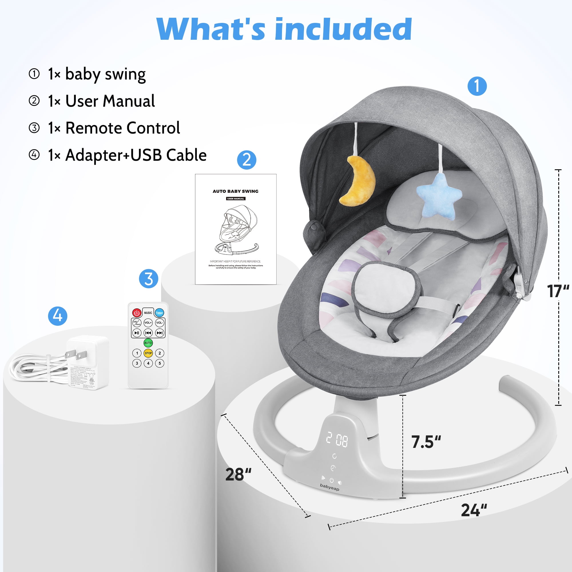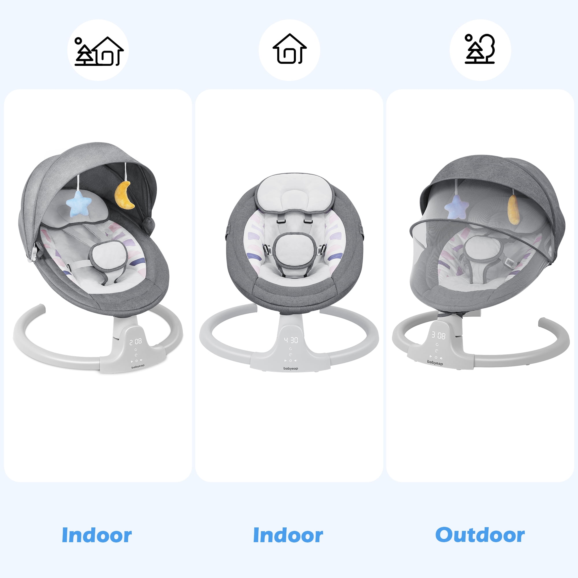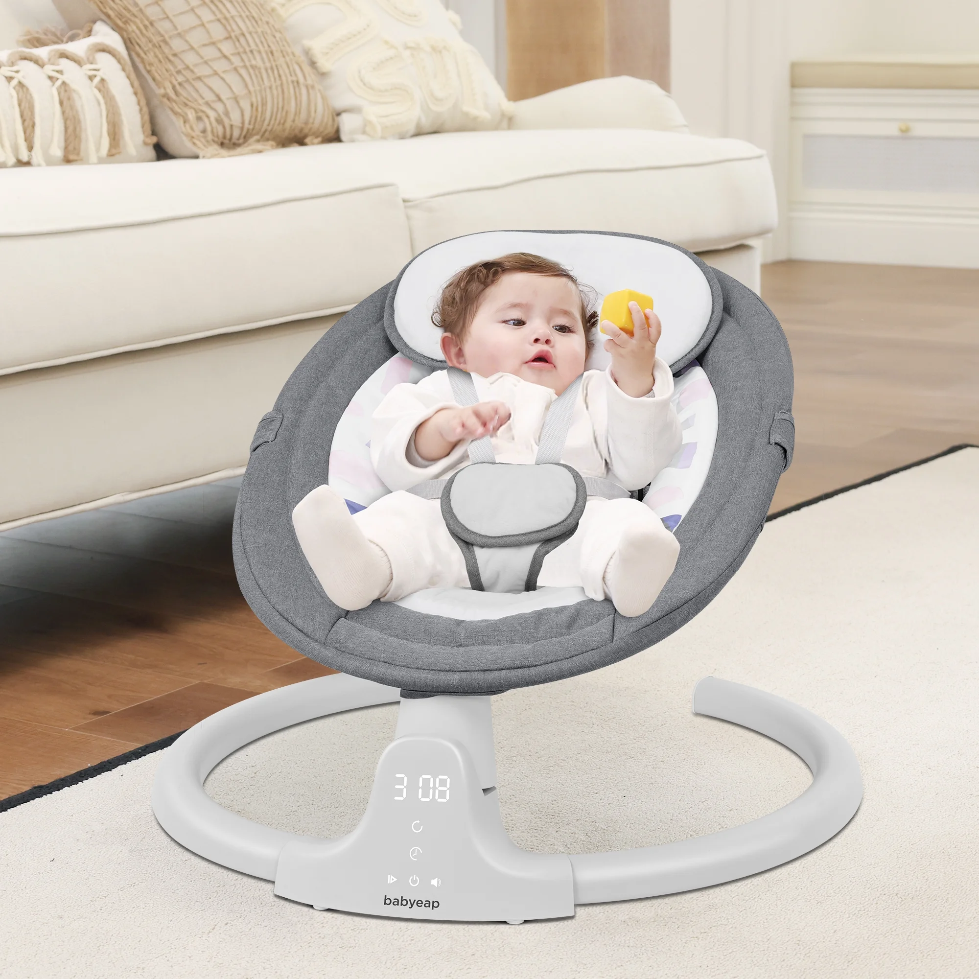 Our baby swings feature a large and adjustable safety belt that ensures your baby feels secure and protected while enjoying themselves. With 5 different speed settings, our baby swings emulate parents’ natural side-to-side swinging motion. This soothing motion helps to calm and comfort your baby. The cationic fabric outer ring and crystal velvet cushions of our baby swings provide a breathable and comfortable seat for your little one. The durable aluminum base with anti-skid grips ensures stability and safety. Easily control the swing using the panel or the remote control for added convenience. Switch between music options, adjust swing speed, and set the timer for 8, 15, or 30 minutes. These timing options make it convenient for you to attend to other tasks while your baby enjoys their swing. Our baby swings come with 10 built-in soft lullabies to help relax your baby. Additionally, the Bluetooth music speaker allows you to play your baby’s favorite music or story from your phone, keeping them entertained and happy.