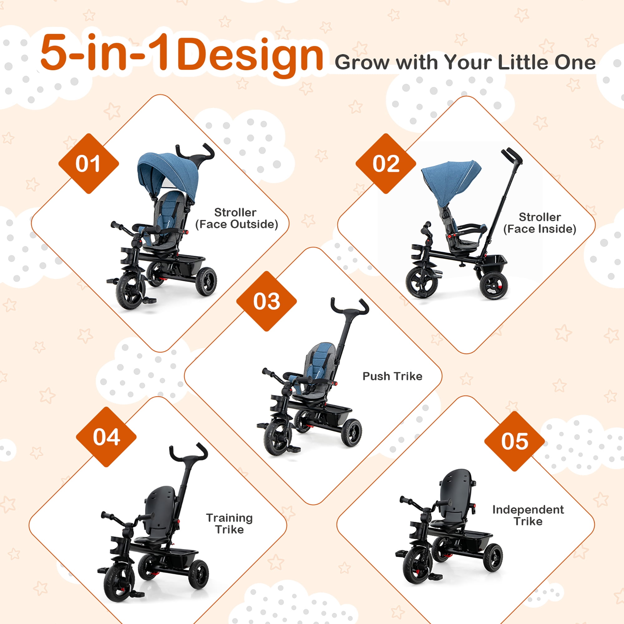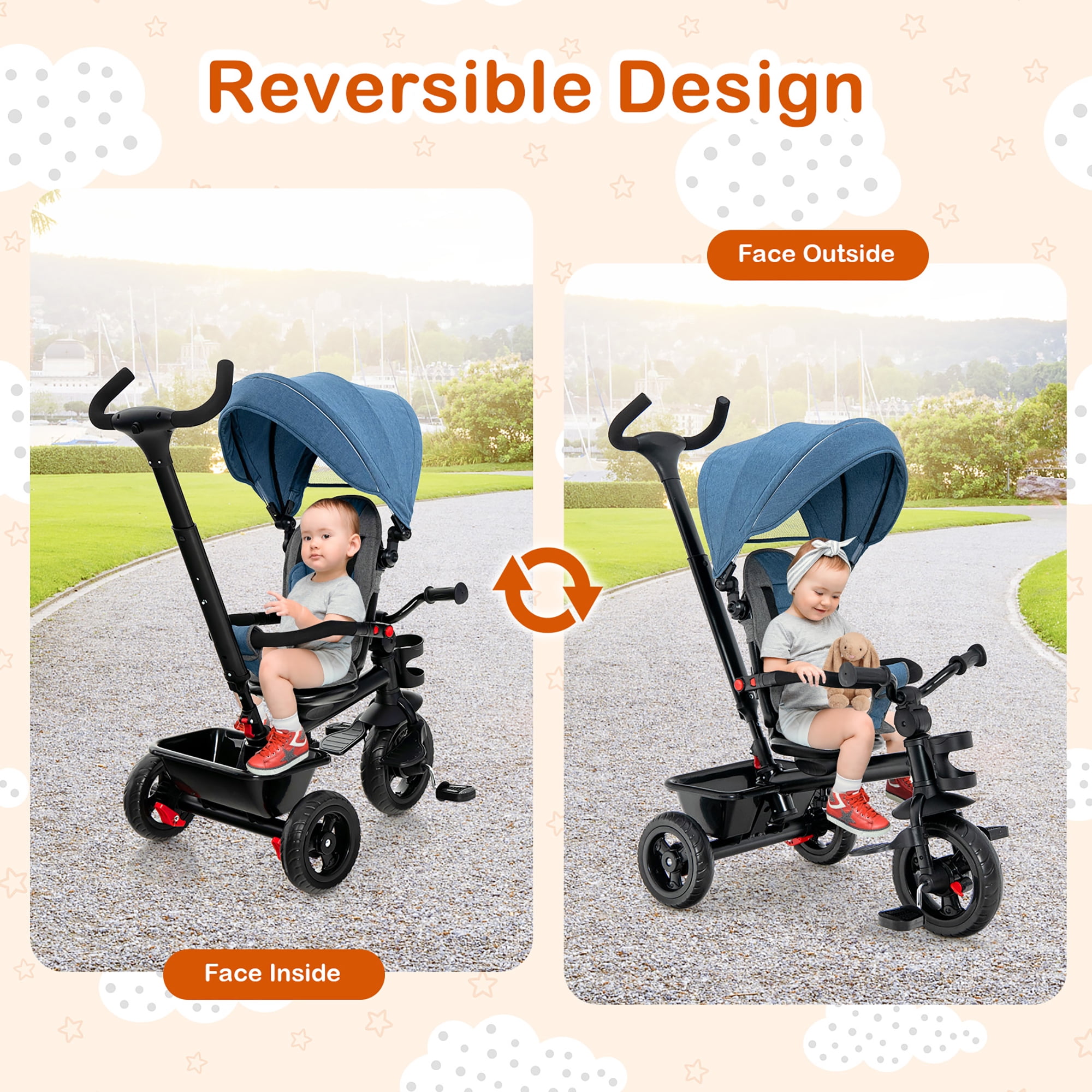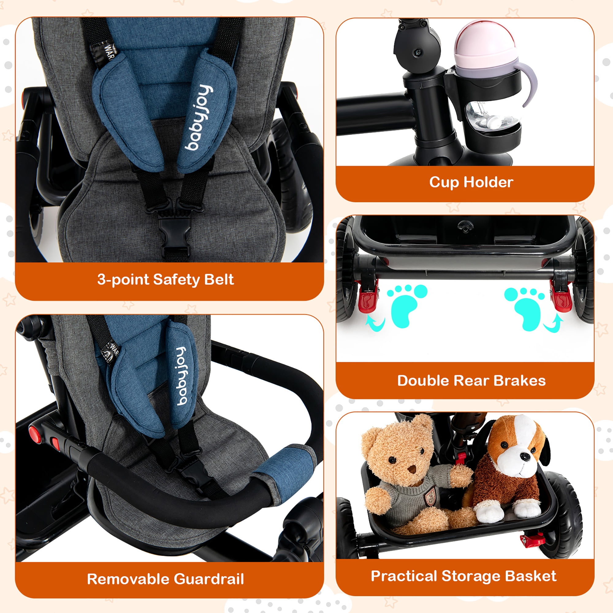 Babyjoy, 1.5, 60 days, 5, 18 lbs Reversible Baby Tricycle Grow with your little one with a multifunctional design that adapts as they grow Can be used as a baby stroller, push trike, learn-to-ride trike, or stand-alone trike Reversible seat allows your child to face either inside or outside Adjustable canopy with 3 positions for protection against sunlight Push handle height can be adjusted for parent comfort Designed with a 3-point safety belt to keep kids secure Double brakes on the rear wheel for emergency stops 135° steering limit for stable riding Comfortable push handle with steering function for easy direction control Folding guardrail for easy access in and out Bottom storage basket for convenient storage of baby items All-terrain EVA wheels with anti-slip textures for high stability Functional front wheel clutch for easy connection to pedals