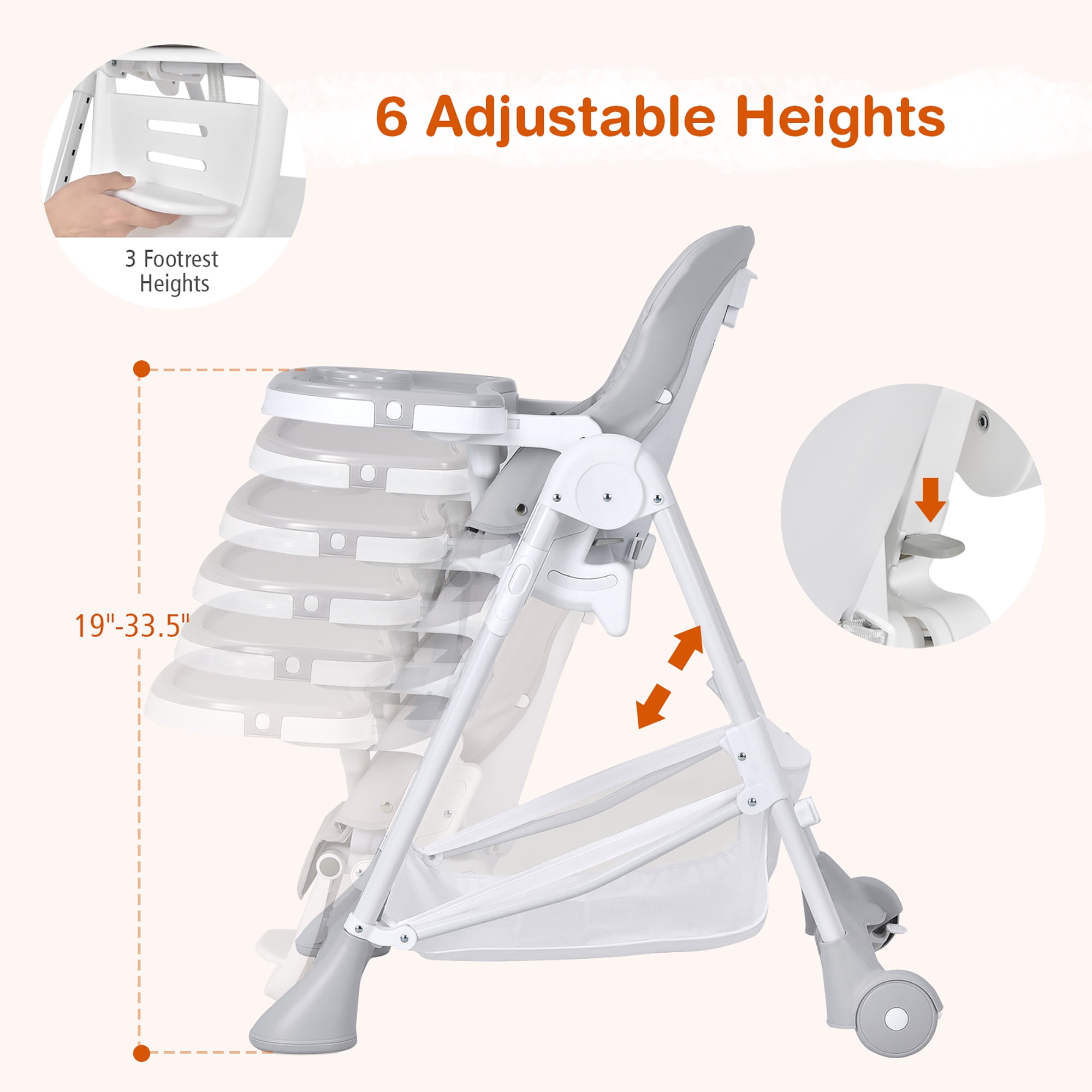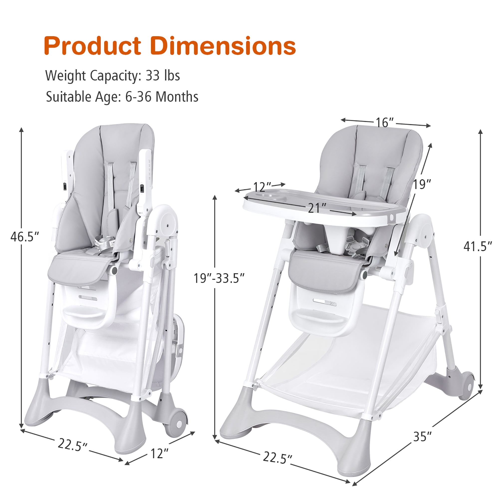 High Chair with Flexible Adjustment: This baby high chair comes with multiple adjustments to meet various needs. The 6-position adjustable height and 3-gear adjustable food tray can match tables at different heights and accompany the growth of the baby. The 5-position backrest is perfect for different activities. Besides, the 3-position footrest with 3 heights is designed to meet the baby’s various postures. Removable Double Trays & Easy Cleanup: Made of premium PP material, the upper tray is suitable for babies feeding or eating. The groove design on the tray is convenient to hold the baby’s bottle. After removing the upper tray, there is another tray for babies to enjoy playing or reading time. Both the 2 trays are easy to clean with damp cloth. Comfortable Seating & Large Storage Basket: The thick and soft padded cushion can give your baby a comfortable dining space. The skin-friendly PU cushion cover is removable and easy to wipe clean. In addition, there is a large storage basket under the chair to store paper diapers, towels, baby toys for quick access. Stable Construction & Safety Protection: Supported by a sturdy A-shaped metal tube frame, this baby high chair ensures high stability and avoids being toppled by children’s restlessness. Moreover, 5-point safety harness plus thick & soft shoulder belt are equipped to keep children up to 33 pounds secure in the chair. Easy Movement & Quick Folding Design: With 2 wheels on the back legs, this high chair can be moved to any place effortlessly. Besides, the wheels can be firmly locked to prevent sudden sliding. The one-second folding design makes it easy for storage when not in use. The detachable trays can be fixed on the back legs to save more space.