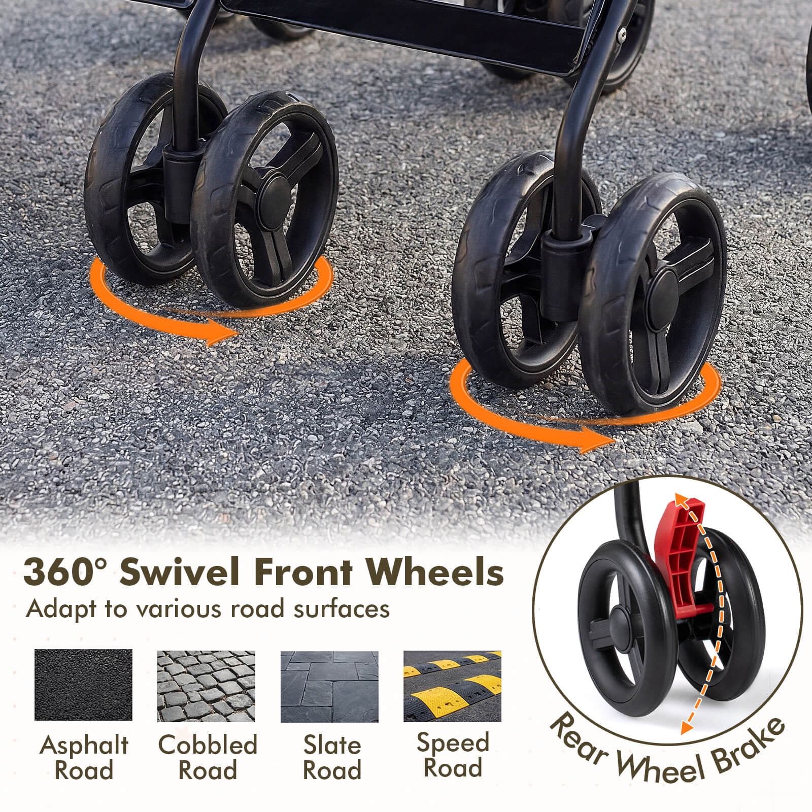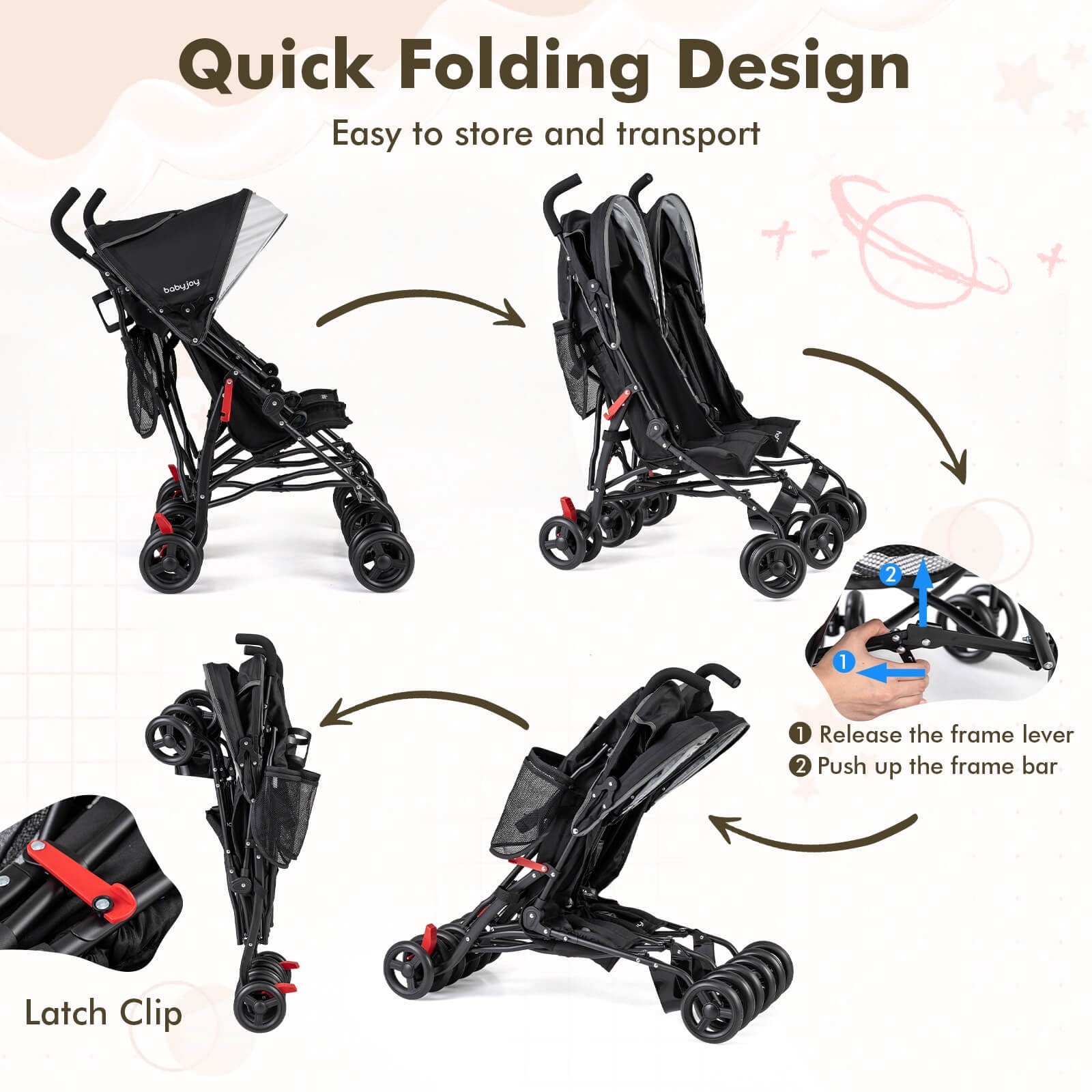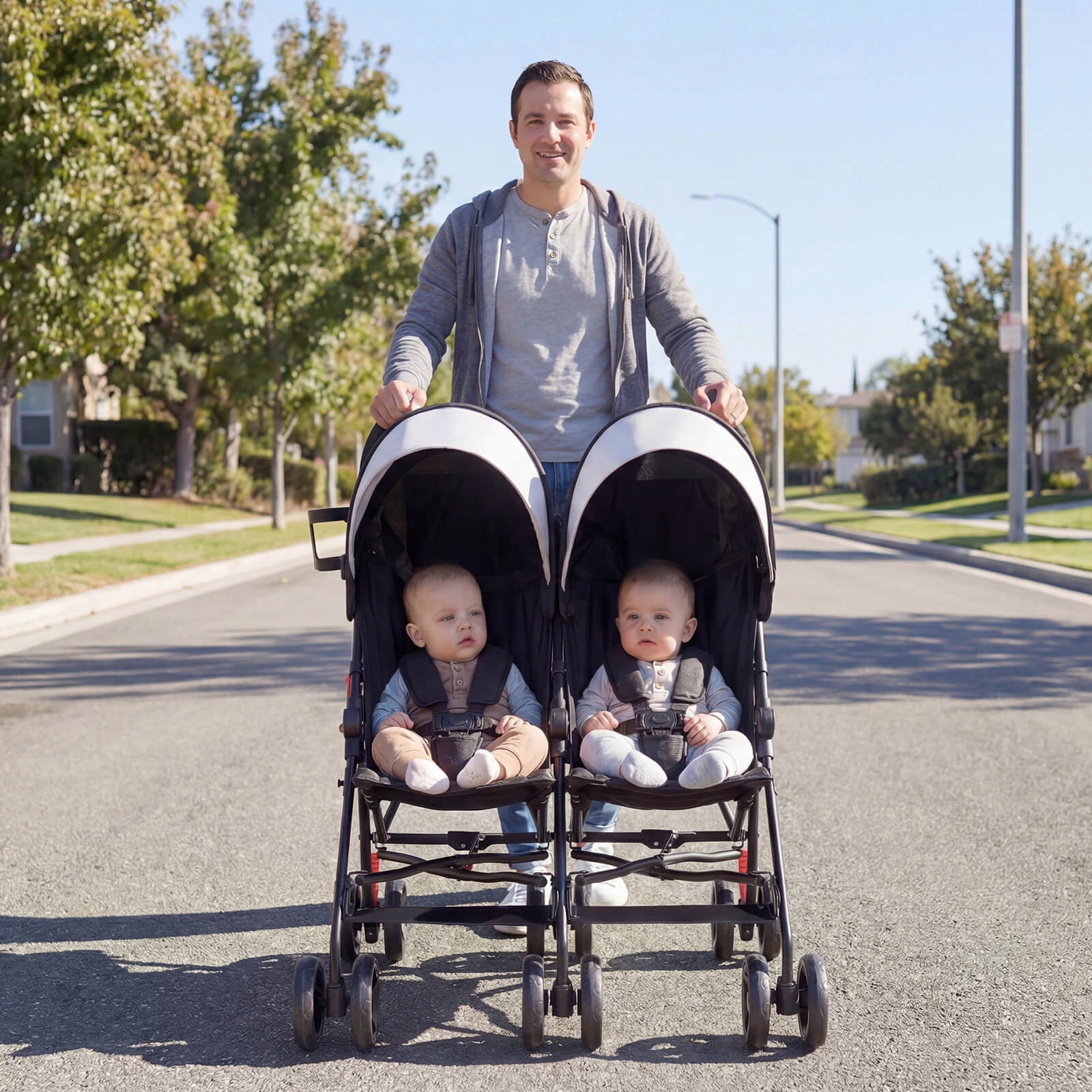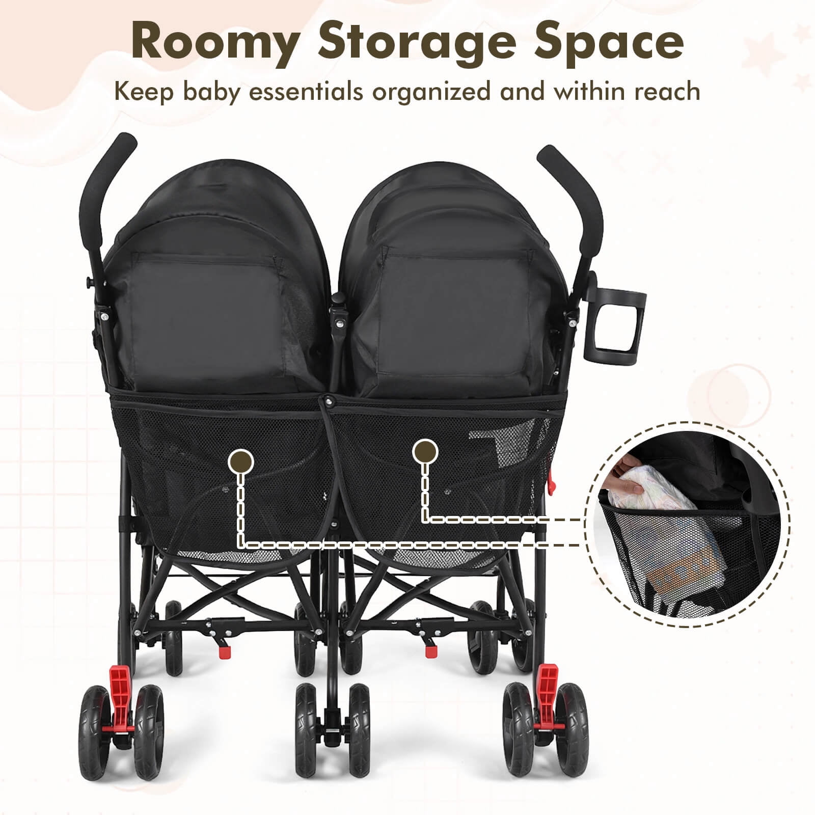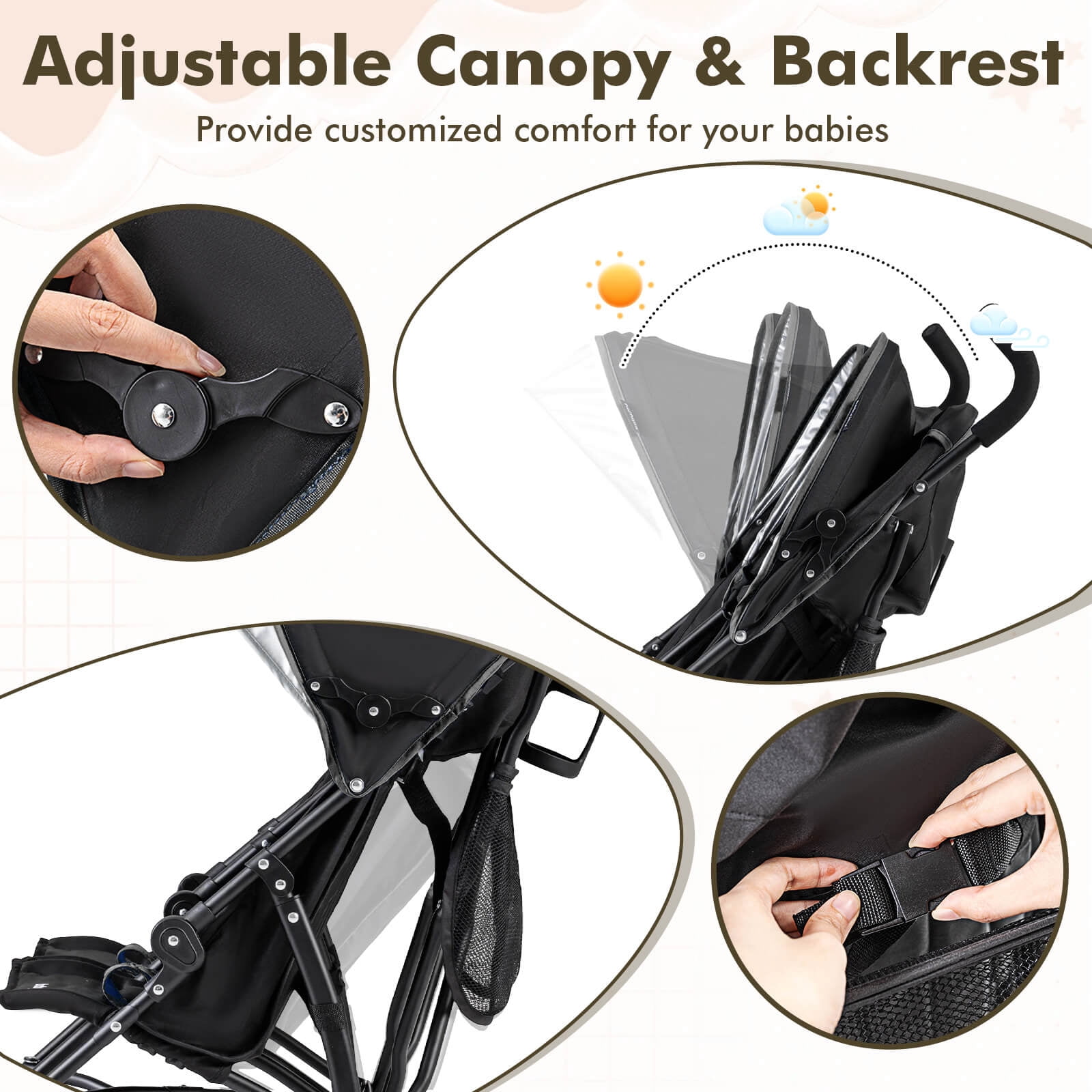 Stable & Comfortable Double Stroller: This umbrella stroller is constructed from metal frame and utilizes durable polyester cloth fabric, which is stable enough to hold weight up to 66lbs and offers a comfy spot for your children. It includes 2 side-by-side strollers, perfect for taking twins or different age siblings on adventures no matter the weather. Lightweight and Compact Folding: This lightweight twin umbrella stroller can be easily and quickly folded into a compact size for convenient storage and transportation. Weighs around 18 pounds, this sleek and stylish infant stroller rides easily and folds compactly to slip into the trunk of your car with ease, ideal for traveling or day trips. Adjustable Canopy & Storage Bag: The adjustable extended canopy with pop out sun visor keeps baby shaded and blocks baby’s sensitive skin from strong sunlight. And it has a peek-a-boo window so you can quietly check on your little one. The mesh storage bags are considerate and functional, providing ample storage space and easy access to baby essentials. Lockable 360° Swivel Wheels: The shock absorbing front wheel swivels offer better maneuverability. The rear wheels feature a foot-activated brake system to ensure safe parking, giving you more flexibility. The stroller gives a smooth ride over various terrains for an even more relaxing stroll. Considerate and Humanized Features: Ergonomically designed rubber handle bars are easy to control and provide optimal comfort. With a cup holder on the side, you can carry beverage or water bottle for easy access throughout the day. Equipped with 5-point safety harness and padded belt, ensuring a secure and comfortable seat feeling for your baby.