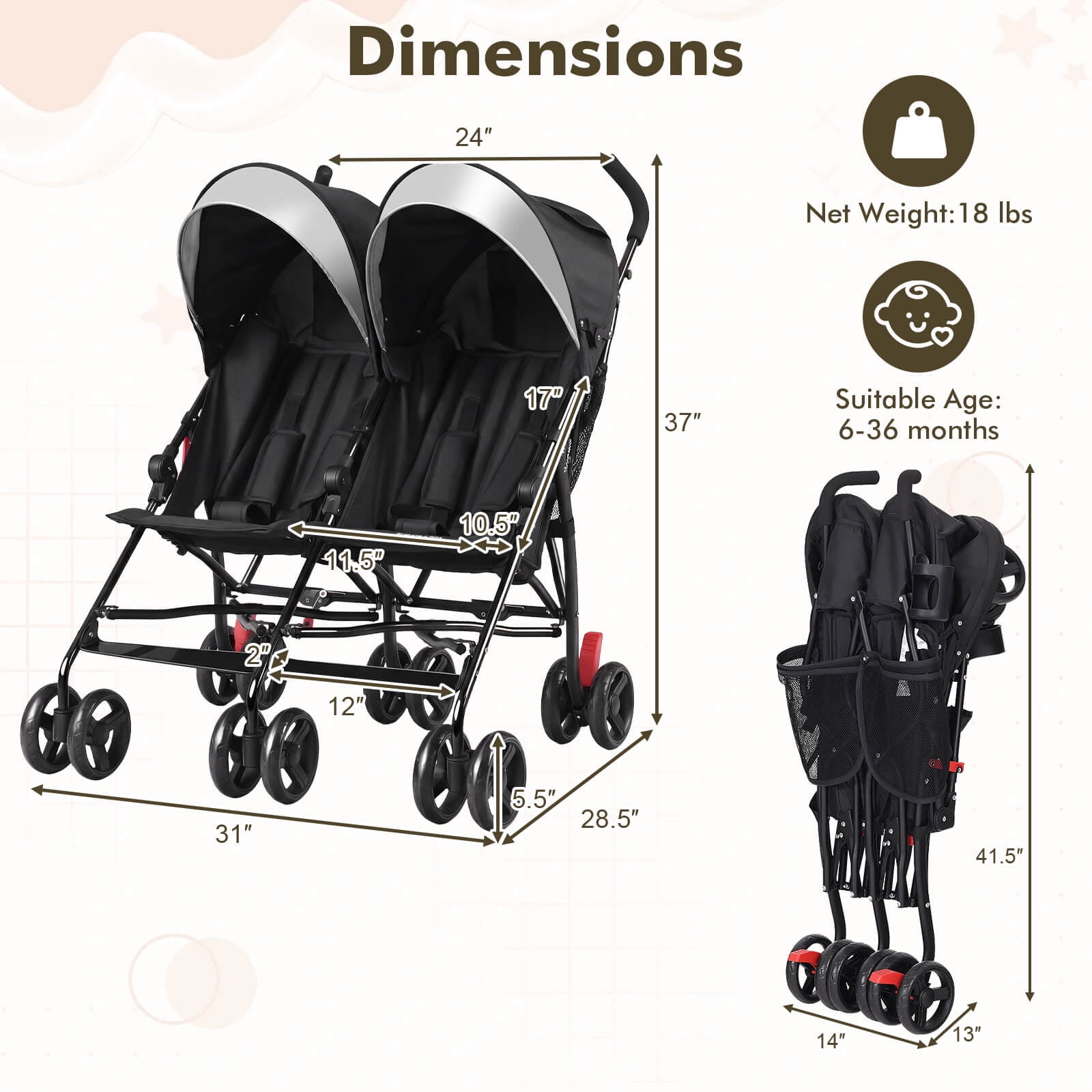 This stroller with the functionality of quick and easy umbrella fold is a must-have for parents who travel or go out often. This double side by side stroller will be of great use if you have two kids or twins. It is ideal for babies weighing up to 33 pounds. Ventilate canopy with two small windows for blocking ultraviolet and lightweight frame is friendly for travel. 360-degree swivel wheels is shock absorbing designed and 5-point safety harness ensures security for your little baby Feature Adjustable backrest in three different positions Brake unit of rear wheel for safe travel Ventilate canopy with two small windows for blocking ultraviolet Lightweight frame for easy travel Easy fold, quick and compact umbrella fold for portability and easy travel 2 large back storage bags and 2 bottom large carrying basket 5-point safety harness 360-degree swivel, shock absorbing front wheels With cup holder Specification Color:Black Material:Steel Frame Product Dimension:31”(L) X 28.5”(W) X 37”(H) Product Weight:18 lbs Maximum weight for each seat:33lbs Suitable age:7-36 months (under 38” tall)