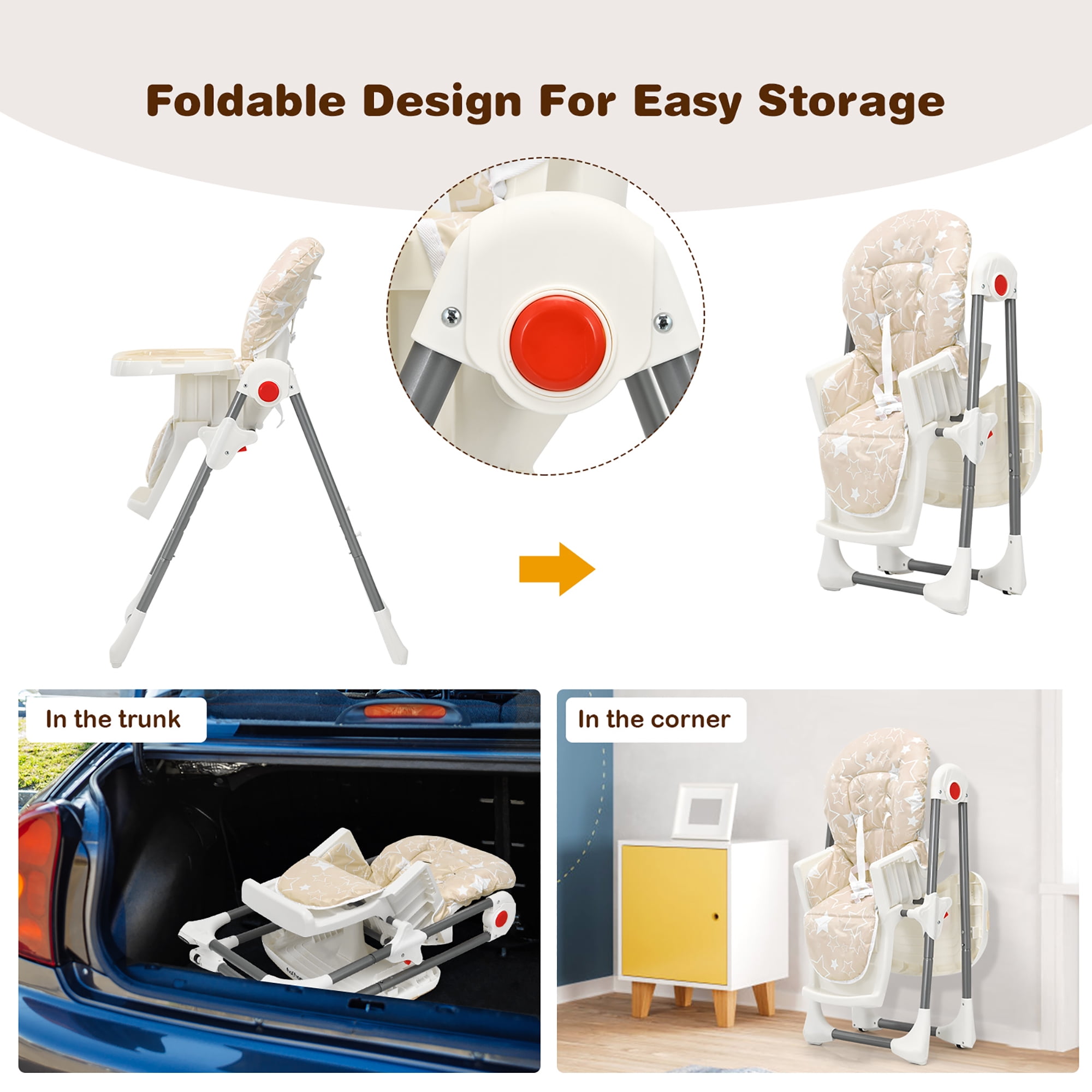 Our baby high chair is the best companion for your baby’s meals. The adjustable high chair can meet the different purposes of eating, playing, feeding and interacting with parents. The 6-position height adjustment allows you to find the most suitable height to feed your baby. The adjustable backrest angle allows the child to enjoy the ultimate comfort. It is worth mentioning that the distance between this double-layered tray and the backrest can be adjusted based on the age of the child. The upper layer of the disassembled double-layer tray can be cleaned in the dishwasher. When not in use, the entire tray can be hung on the leg to facilitate storage. Meanwhile, its folding design is specially designed for families with small spaces. The waterproof PVC fabric features good splash resistance and water stains are not easy to penetrate. In addition, the 5-point safety belt effectively prevents the baby from falling. Feature Featuring 6 height options, free to find the right height With 3 backrest angles from 110° to 125°, choose the right angle to eat 3-position distance between the tray and the backrest, suitable for 6-36 months baby The double-layer tray is detachable, and the top is PFA-free, dishwasher safe Save space by folding design and hanging the tray Waterproof PVC to prevent the cushion from getting wet after splashing 5-point safety belt for increased safety to secure your cute baby With Soft cushion, not only comfortable but also removable for cleaning Iron pipe to increase stability and improve bearing capacity The rolling wheels at the bottom are designed for smooth movement Suitable for many occasions: eating, feeding, parent-child interaction Specification Color: Beige Material: PVC + PP + ABS + Iron Unfolding Product Dimension: 20” x 31.5” x 34”-42” (L x W x H) Folding Product Dimension: 20” x 12” x 44” (L x W x H) The Height of The Tray from The Ground: 23”-30” The Length of The Tray from The Backrest: 5.5”/6”/7” Backrest Angles: 110°/114°/125° Net Weight: 15.5 lbs Maximum Weight: 33 lbs Suitable Age: 6-36 months Package Includes: 1 x Baby High Chair 1 x Instruction