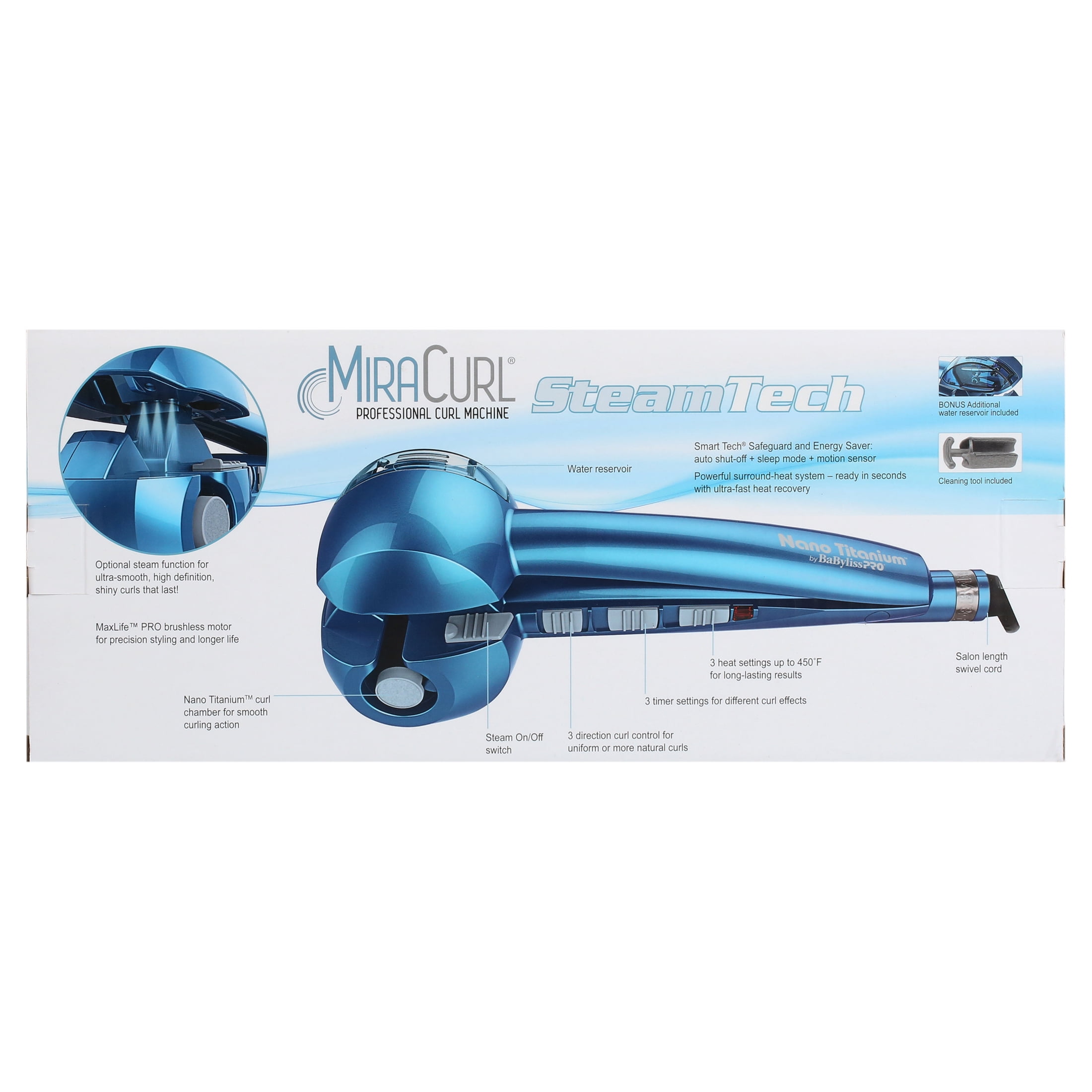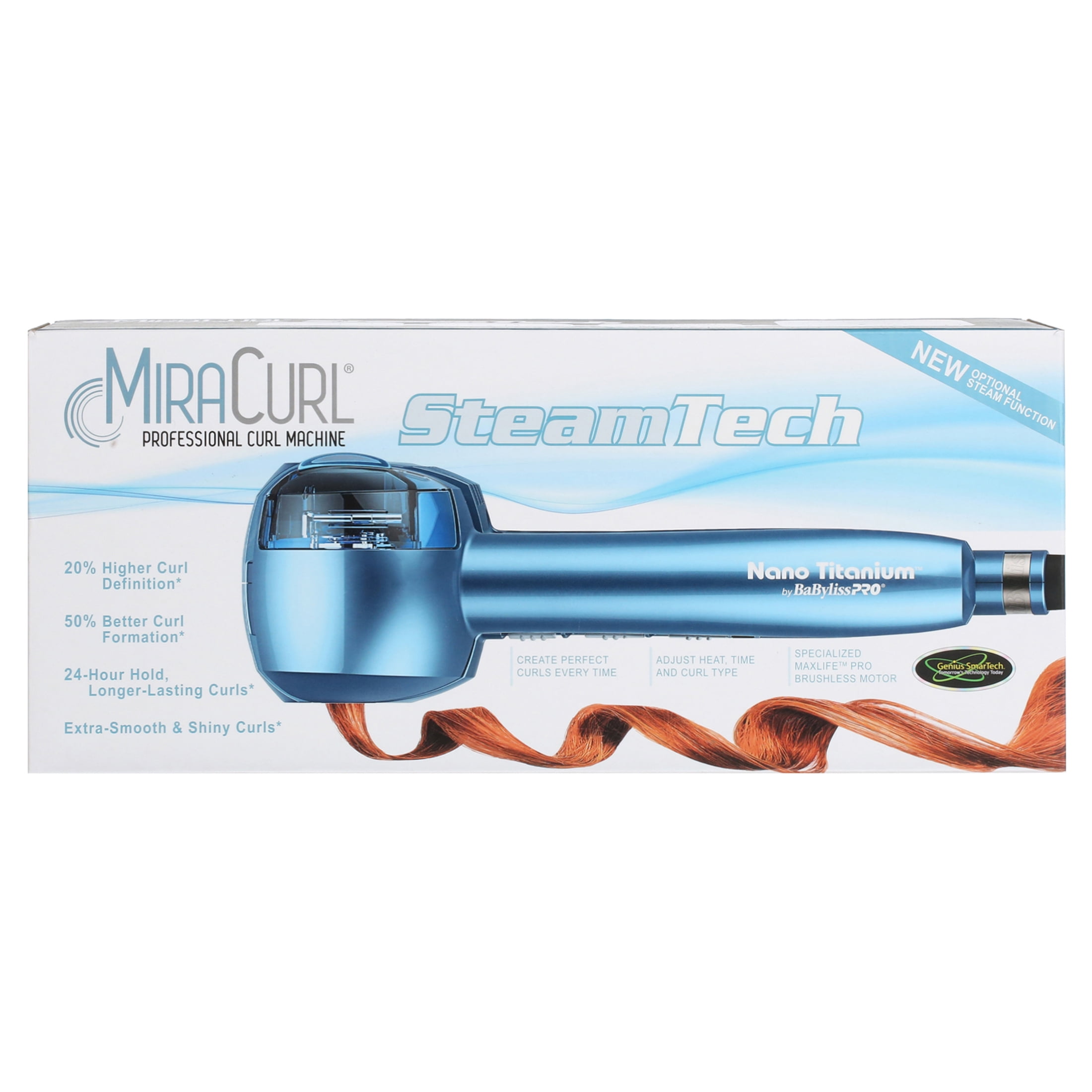 BaBylissPRO Nano Titanium Miracurl SteamTech Professional Automatic Hair Curling Machine, Blue The new Mira curl steamtech now has a steam option that creates higher curl definition and better curl formation. Automatically forms one perfect curl after another Place sectioned hair in unit and create perfect frizzless curls with incredible bounce
