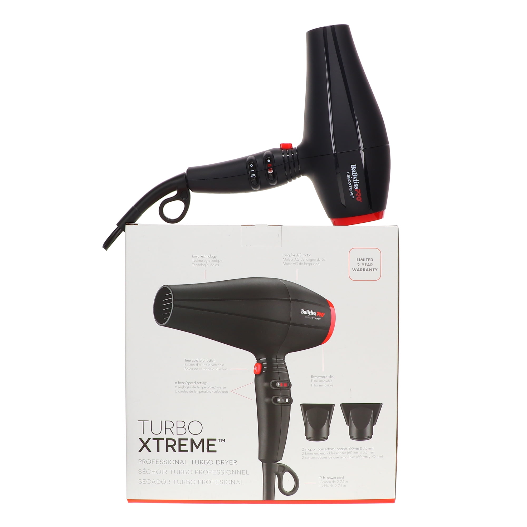 The BABYLISS ~ PRO TURBO EXTREME DRYER will have your hair dry in a matter of minutes. It features 1800 watts for fast drying, 1875w power with TurboAirâ„¢ technology to provide superior airflow that dries faster across multiple heat and speed settings. It also offers the cold shot button for setting styles after blow-drying, has a removable filter which will make clean up easier!
