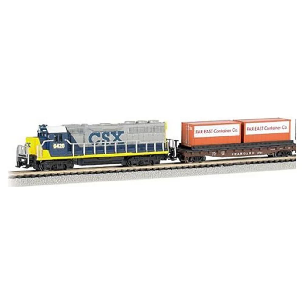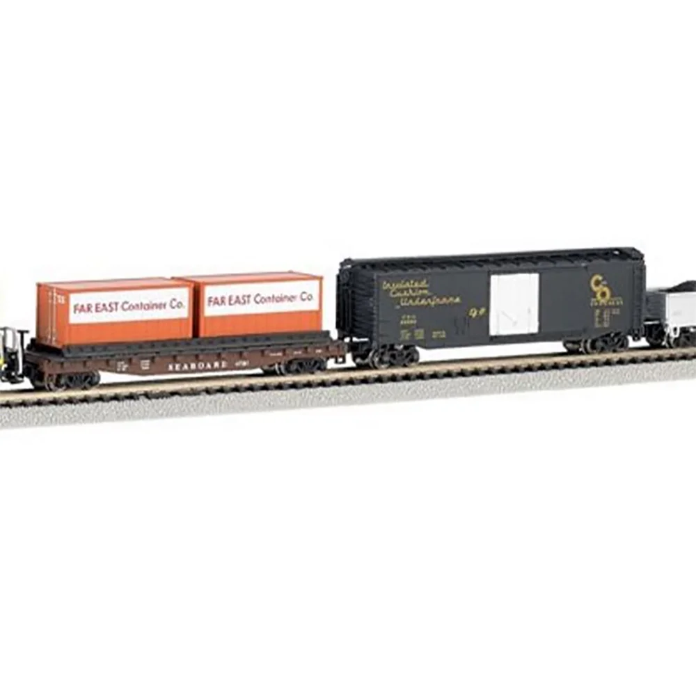 Complete Ready To Run 60 Piece Freight Train Set Powered by a EMD GP40 Diesel Locomotive with Operating Headlight Includes; Flat Car with Container Load, Gondola Car, Plug-Door Box Car, Wide-Vision Caboose, Railroad Signs, Street Signs, and Telephone Poles 34″ x 24″ Oval of Nickel Silver E-Z Track , Power Pack and Speed Controller N Scale 1:160