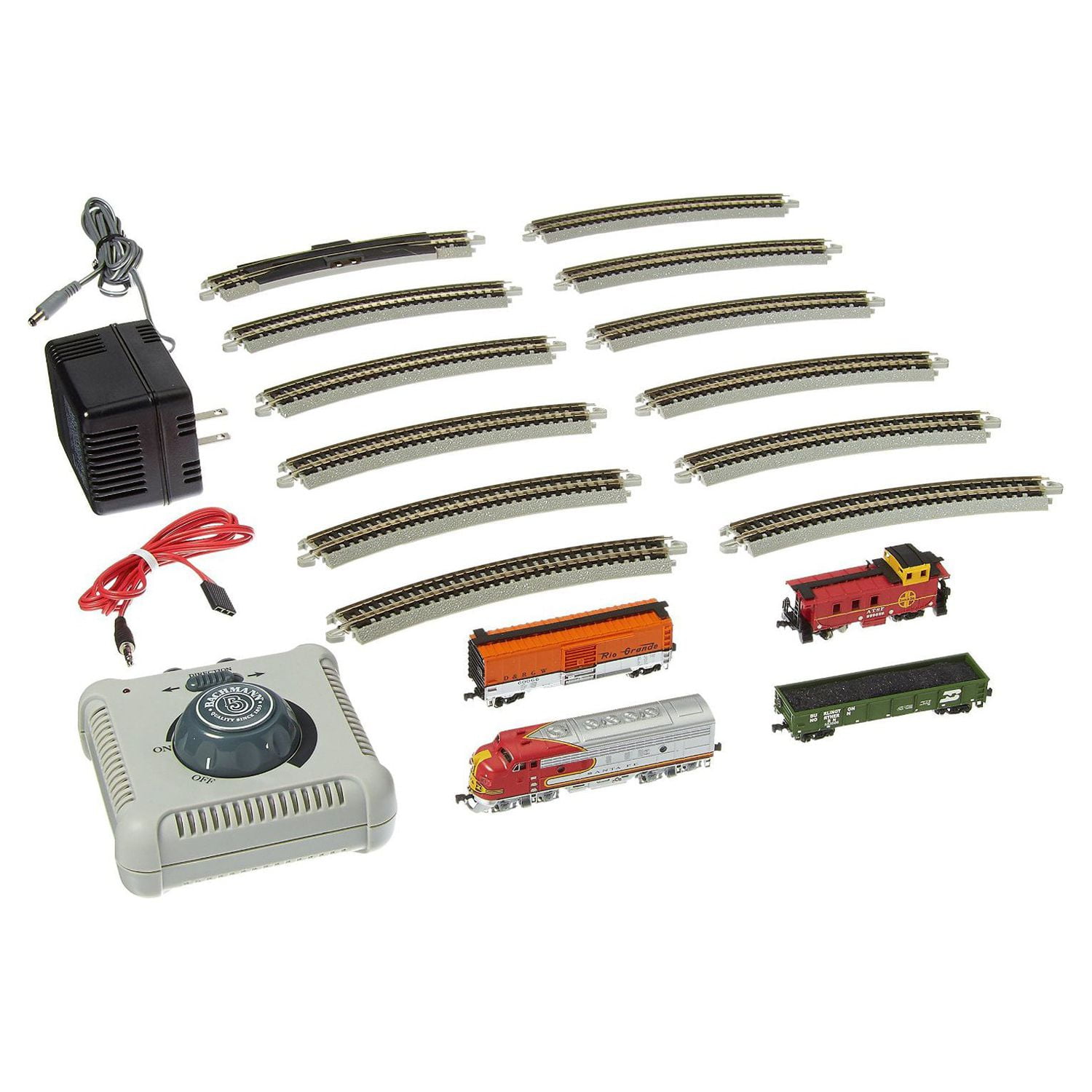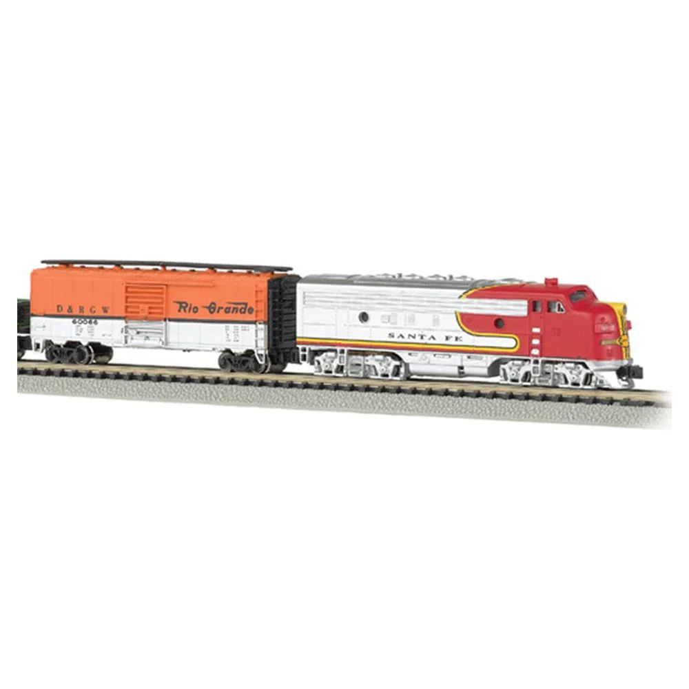 Complete Ready To Run Freight Train Set Powered by a F7-A Diesel Locomotive with Operating Headlight Includes; Box Car, Steel Gondola Car, Off-Set Cupola Caboose 24″ Circle of Nickel Silver E-Z Track , Power Pack and Speed Controller N Scale 1:160
