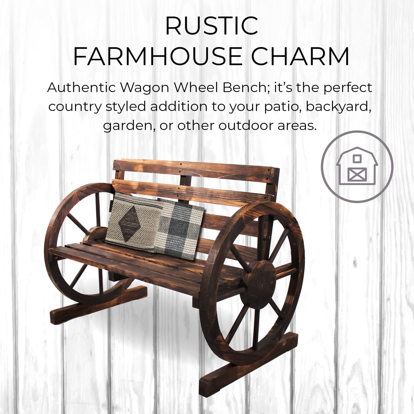 This BACKYARD EXPRESSIONS Wood, Wide Slatted Farmhouse Wagon Wheel Bench will provide seating while dual functioning as a outdoor décor for your home or front yard. Please note that this bench is a compact size, with the length measuring in at 3 and 1/3 feet. Also available is our matching rustic farmhouse arm chair.