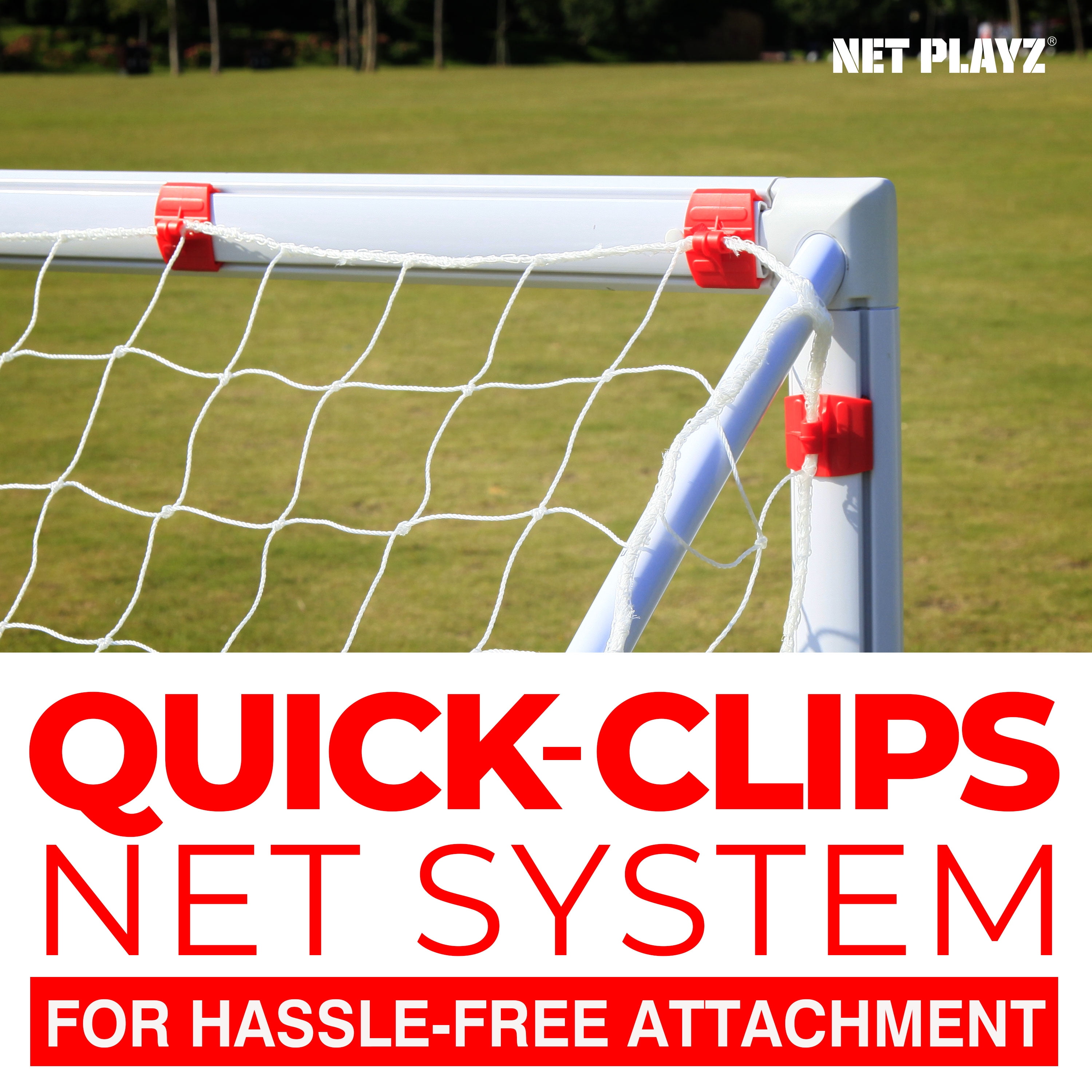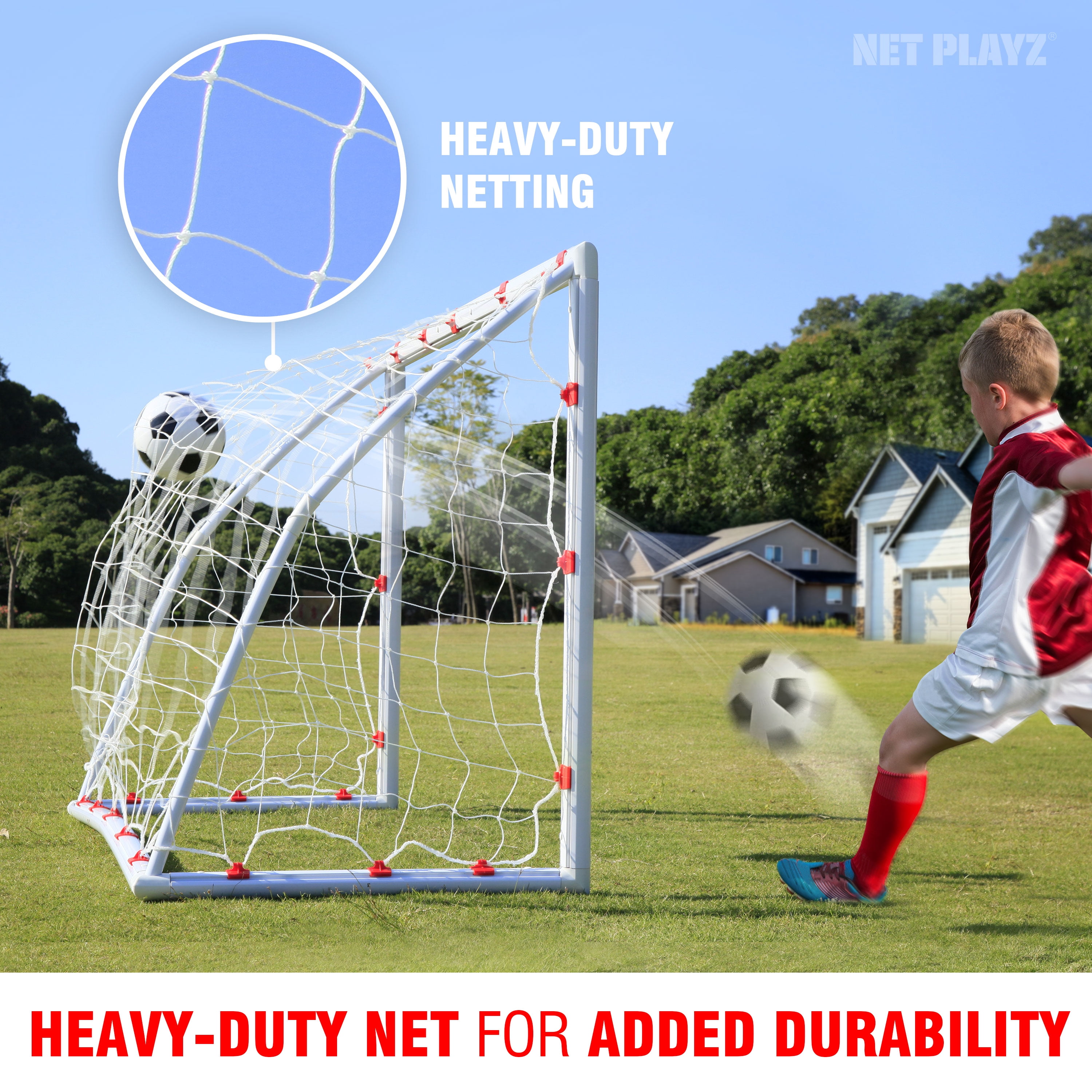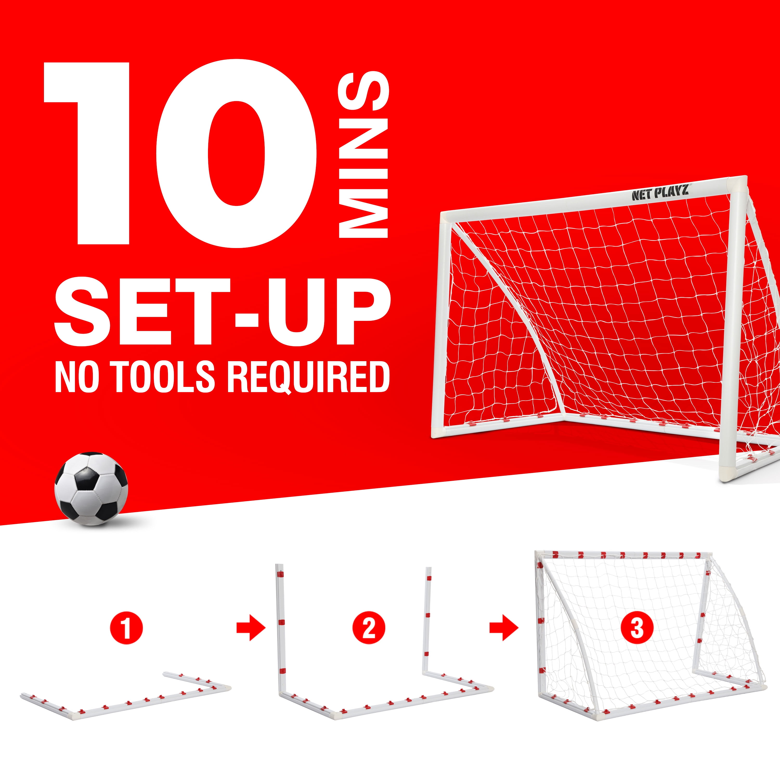 Net Playz PVC Soccer Goal 6 x 4 x 3Ft, featuring extra-strong PVC frame structure and 3D structural pole, easily attach net hook system, secure locking pins for fast assembly, and premium all-weather net. Sturdy enough for practice, a wonderful addition to your backyard. Featuring PVC frame formed by specially designed 3D structural pipe construction (patented), 30% stronger than common pipes in the market. Provides ultra sturdiness and stability during soccer practices, also able to withstand a heavy barrage of shots. Together with the specially designed 3D structural pipe, it is the most durable and longest-lasting of any PVC 6ft x 4ft soccer goal brand. Premium PE net features waterproof and weather-resistant. Protect the soccer goal from sun damage & rot. Make it able to be used in any weather condition. Together with the durable PVC frame, this weather-resistant PVC soccer goal can be left outside all year round. A simple and quick set-up in 10 minutes saves you time and hassle. No tools/screws are required. Ensure security by locking pins, poles can be snapped quickly into place. An easy quick-clips net system makes the installation of the soccer goal simple, quick, and easy. Provides hassle-free attachment, allowing the net to attach to the poles easily like a curtain. The straightforward and time-saving net installation makes it a much better choice than the traditional one. A simple 6ft x 4ft rectangular shape PVC frame that is built for the backyard, on-field training. Brings you a real soccer goal experience in your backyard. Also ideal to be used in soccer camps, youth soccer clubs. Suitable for all soccer lovers, kids, coaches, youth soccer players. Product Details: Premium PVC Soccer Goal x 1 Heavy-duty Ground Pegs x 5 Large Net Clip x 12 Small Net Clip x 12 Quality Net x 1 Instruction x 1 Assembly Size: 6.46 x 2.95 x 4.26Ft (L x W x H)