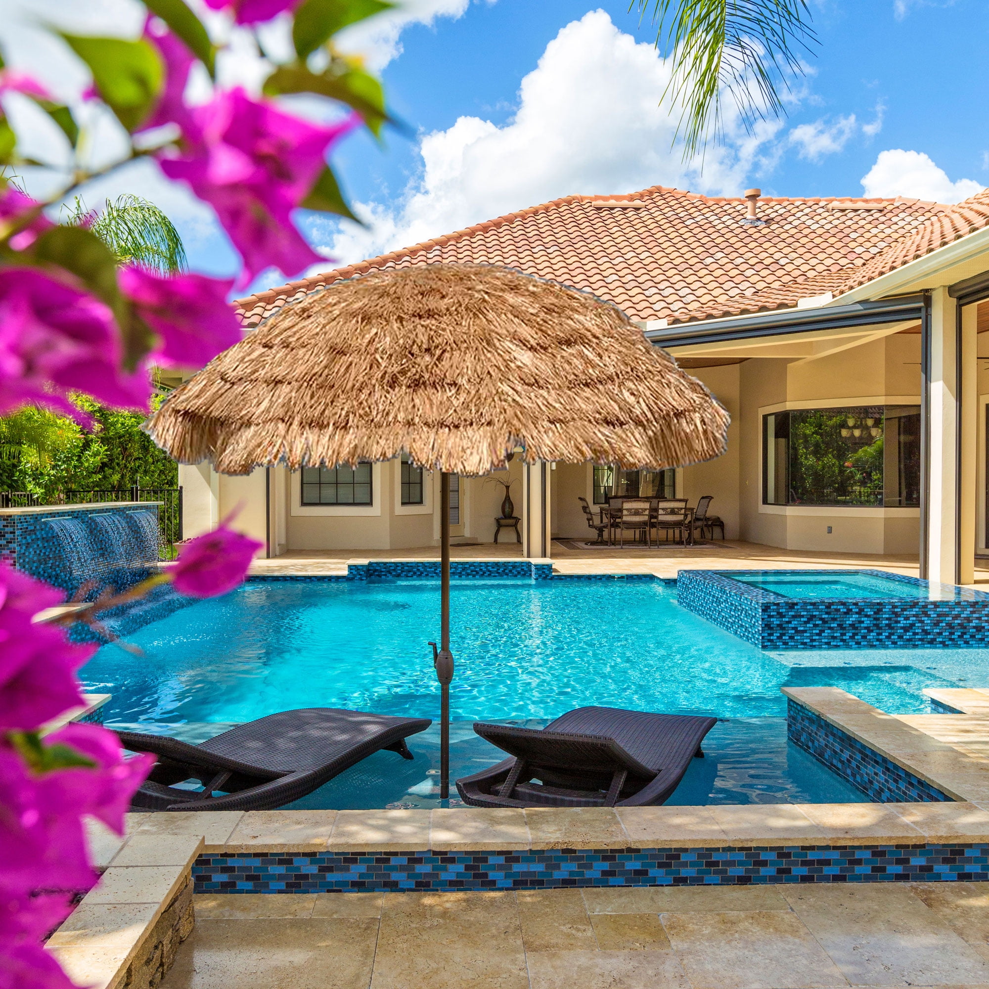 Enhance your outdoor living space with a Tilt feature Tiki grass umbrella from Backyard X-Scapes. Our thatch umbrella is the perfect addition to any patio, beach hangout, tiki bar or for any outdoor setting. This tiki hut umbrella is designed to bring a touch of the tropical vibe to your backyard. Made with eco-friendly, Tiki thatch and heavy-duty steel stake poles, this Tiki grass umbrella is designed to withstand various weather conditions, from sunny and hot to windy and rainy. The “Market Style” construction of this tiki beach umbrella makes it easy to open up and close down, and the sturdy wood-looking steel stake poles make for effortless installation in the sand. The Tilt feature allows you to adjust the umbrella to maximize shade from sunrise to sunset. The breathable UV-blocking polyester fabric allows air to flow through, keeping you cool and comfortable under the Tiki umbrella. This outdoor thatch umbrella is not only stylish but also practical. The tiki bar umbrella also comes with a travel case, making it easy to take with you on your next beach trip or outdoor adventure. Upgrade your patio umbrella game with a Tiki palapa umbrella from Backyard X-Scapes, and enjoy the tropical vibes all season long.