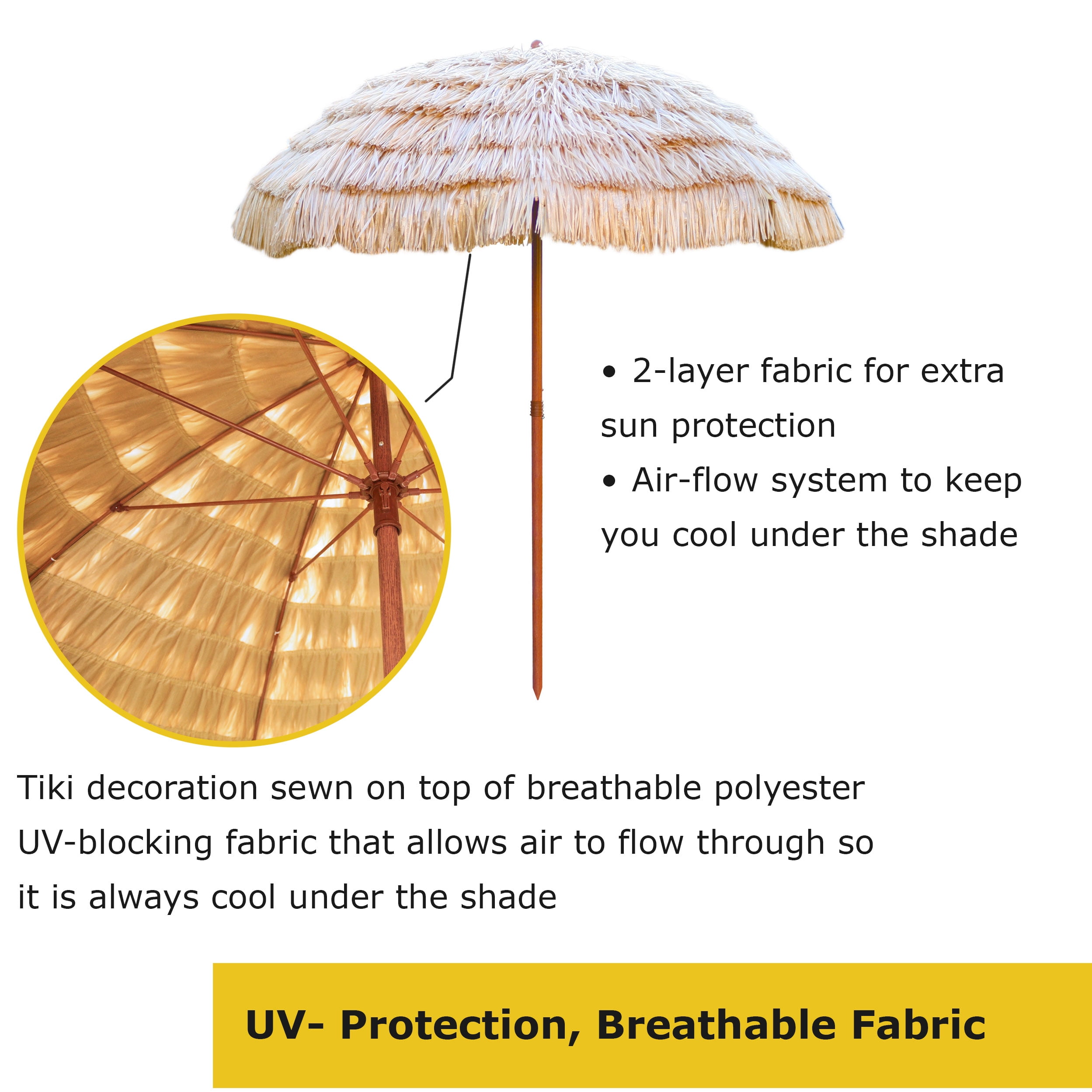 6.5 Ft. High Eco-friendly, Lightweight, Portable, Hawaiian Style Pop-up beach or patio umbrella is easy to open with latch for security Heavy-duty steel, standard size stake pole makes installation in sand or grass easy UV-blocking Polyester fabric protects from the harms of the sun Ventilated canopy made of breathable umbrella roofing fabric Travel case bag so you can bring your shade anywhere