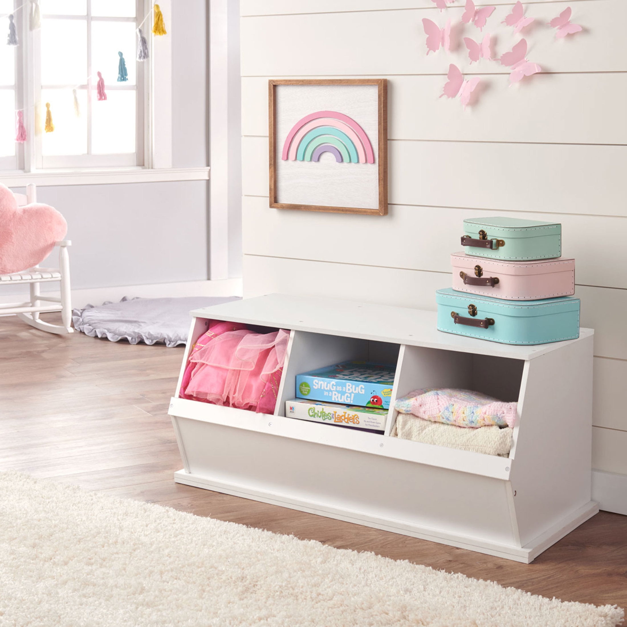 Three bin stackable toy storage unit Great for organizing and sorting kid’s toys and belongings Easy to access large open mouth bins Stack on additional two or three bin Badger Basket Storage Cubbies (each sold separately) Top surface doubles as a shelf for small toys and other treasures Smooth, easy-to-clean surface Solid panel construction helps to keep items in place Overall measurements 37.25 inches L x 19.25 inches W x 17.125 inches H Each bin measures 11 inches L x 17.5 inches W x 15.6 inches H Bin opening measures 9 inches H Total of 5.2 cubic feet storage capacity 80 pound weight capacity Wipe clean with a damp cloth and mild soap, dry thoroughly Adult assembly required Product includes a 30 day limited manufacturer’s warranty