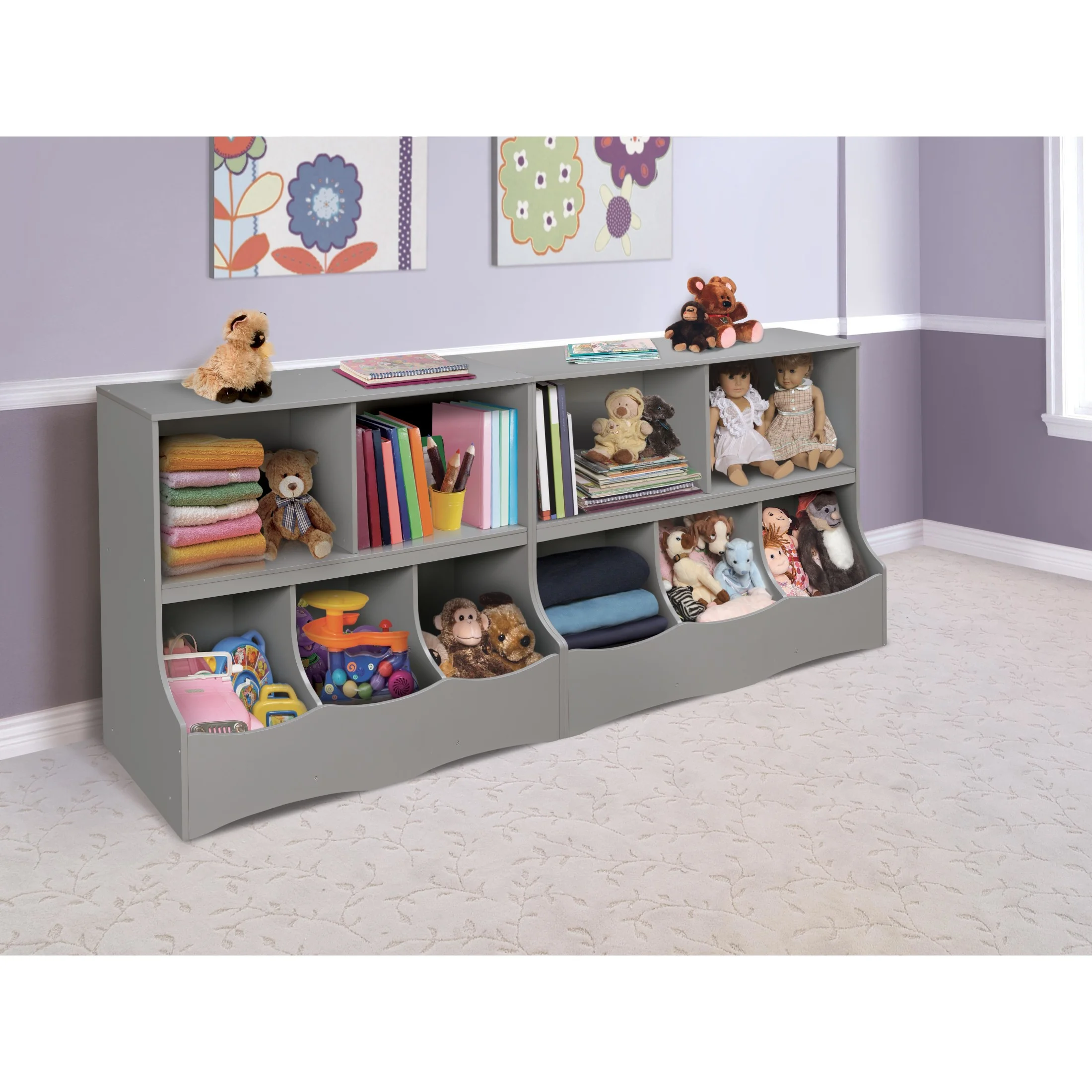 Compartmentalized storage encourages children to sort, categorize and tidy up toys Features two open shelves and three large cubby bins The top surface doubles as a shelf for books, small toys, and special treasures Perfect size for kids’ rooms, family rooms, and playrooms Overall size 37 inches L x 15.75 inches W x 32 inches H Solid panel MDF construction with non-toxic painted finish Wipe clean as needed and dry thoroughly Total of 6.4 cubic feet storage capacity Adult assembly required